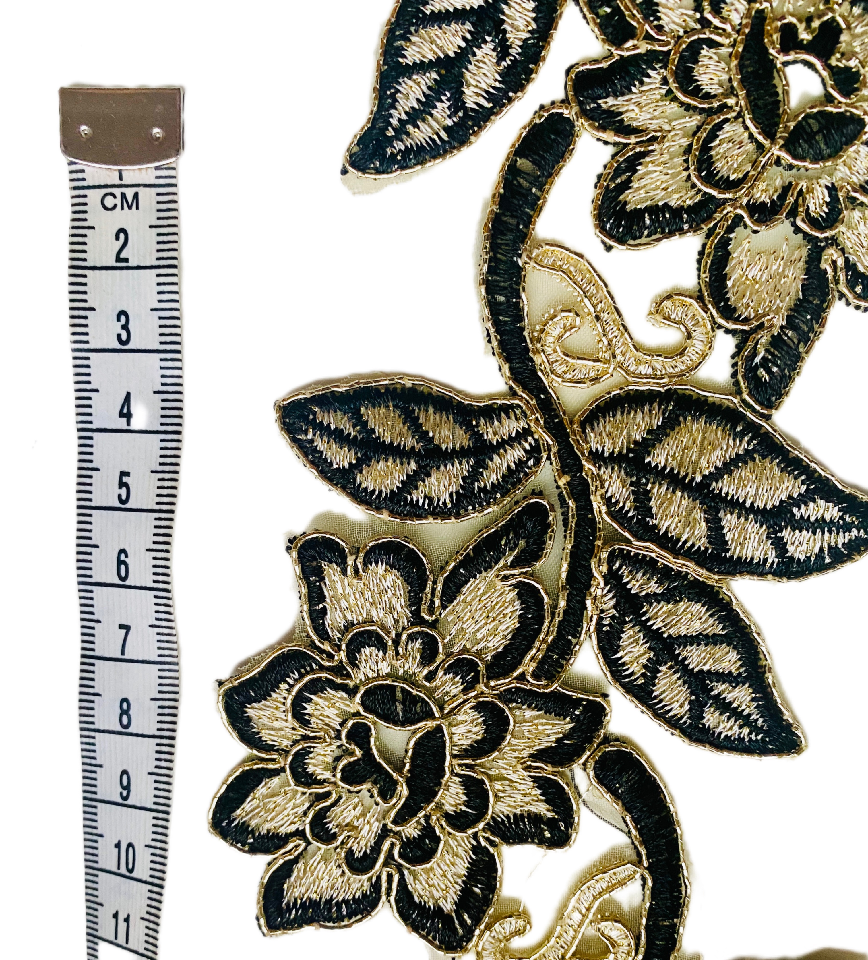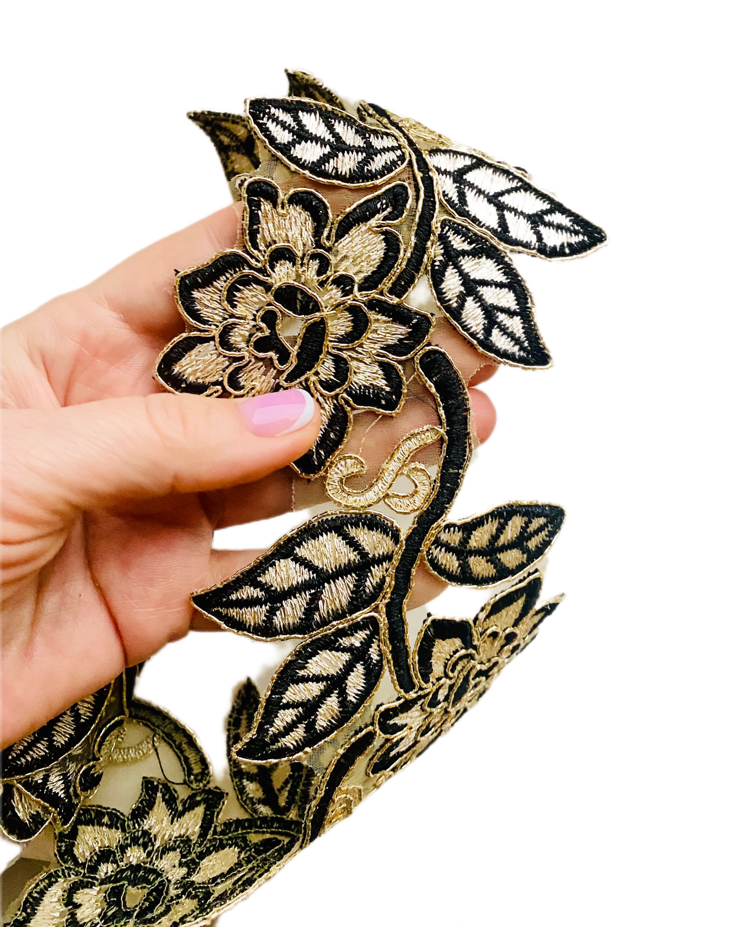 Эффектное кружево на тонкой прозрачной сетке, выполненное в нежном бежевом цвете с изящным контуром из золотистого корда. Объёмный цветочный орнамент подчёркнут плотной вышивкой, создающей выразительный рельеф и благородный визуальный эффект. Фигурный край с ажурными элементами придаёт кружеву утончённость и декоративную завершённость.