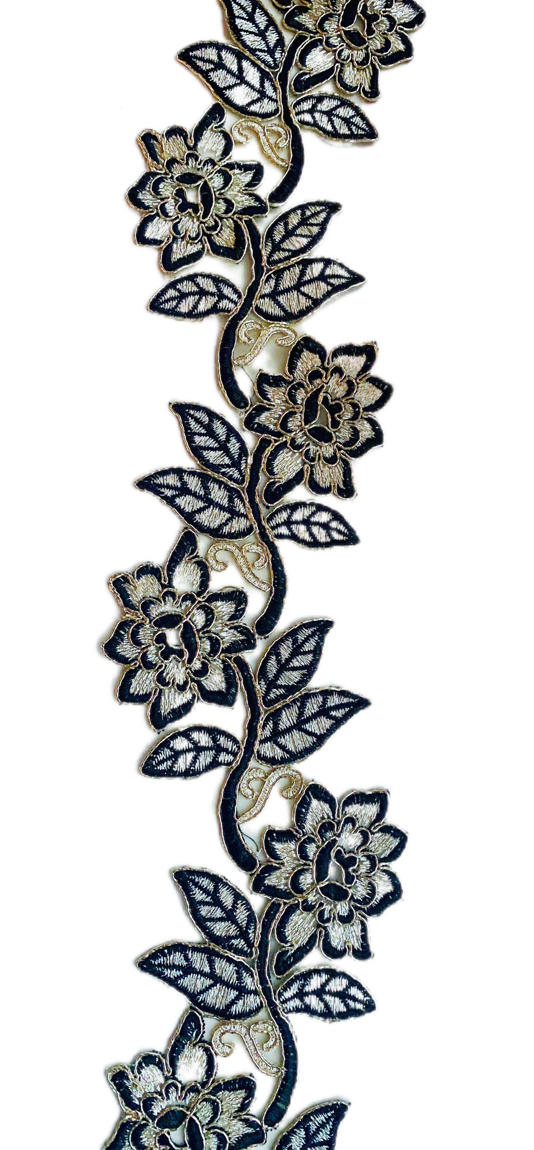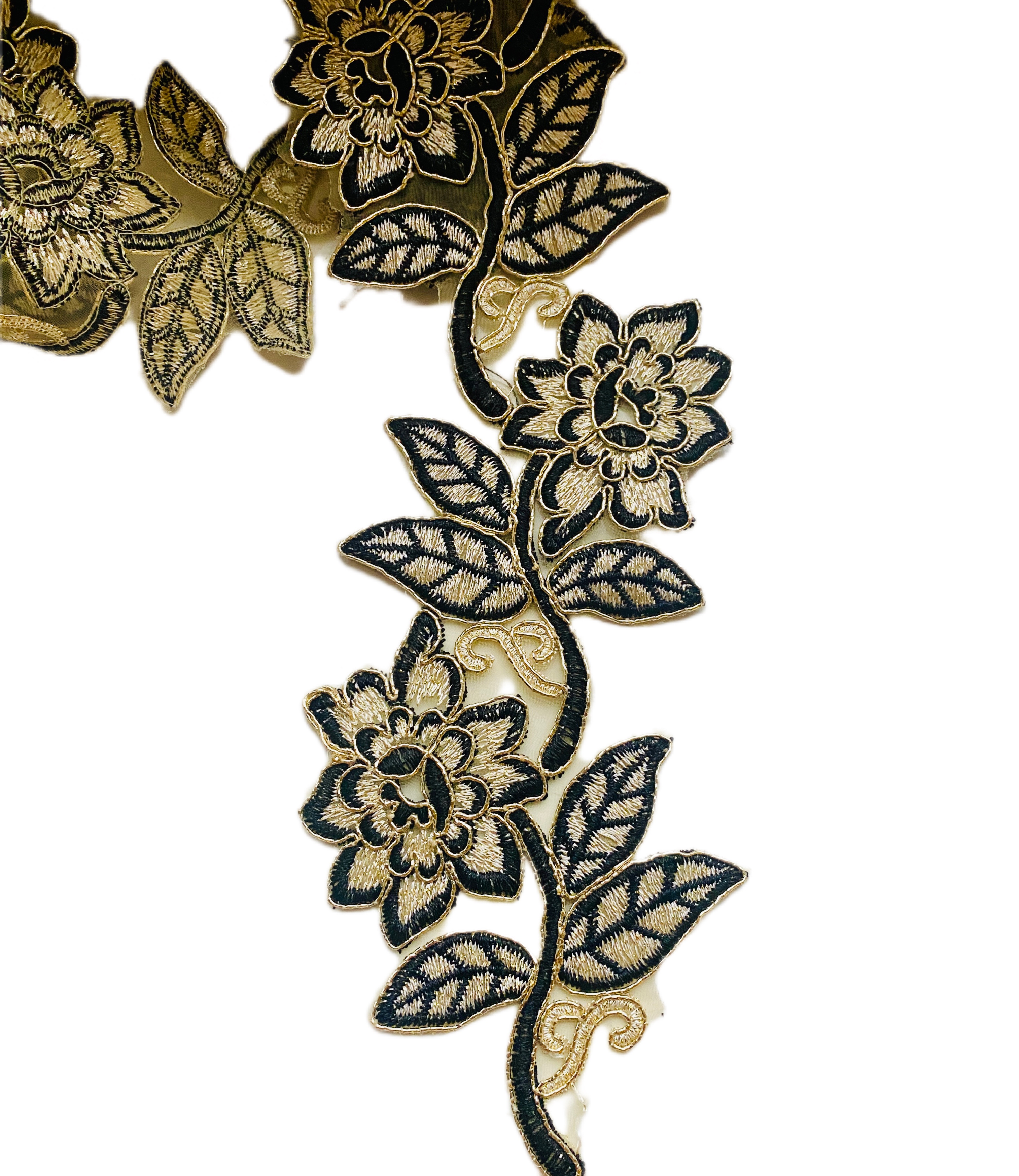 Эффектное кружево на тонкой прозрачной сетке, выполненное в бежево-черном цвете с изящным контуром из золотистого корда. Объёмный цветочный орнамент подчёркнут плотной вышивкой, создающей выразительный рельеф и благородный визуальный эффект. Фигурный край с ажурными элементами придаёт кружеву утончённость и декоративную завершённость.