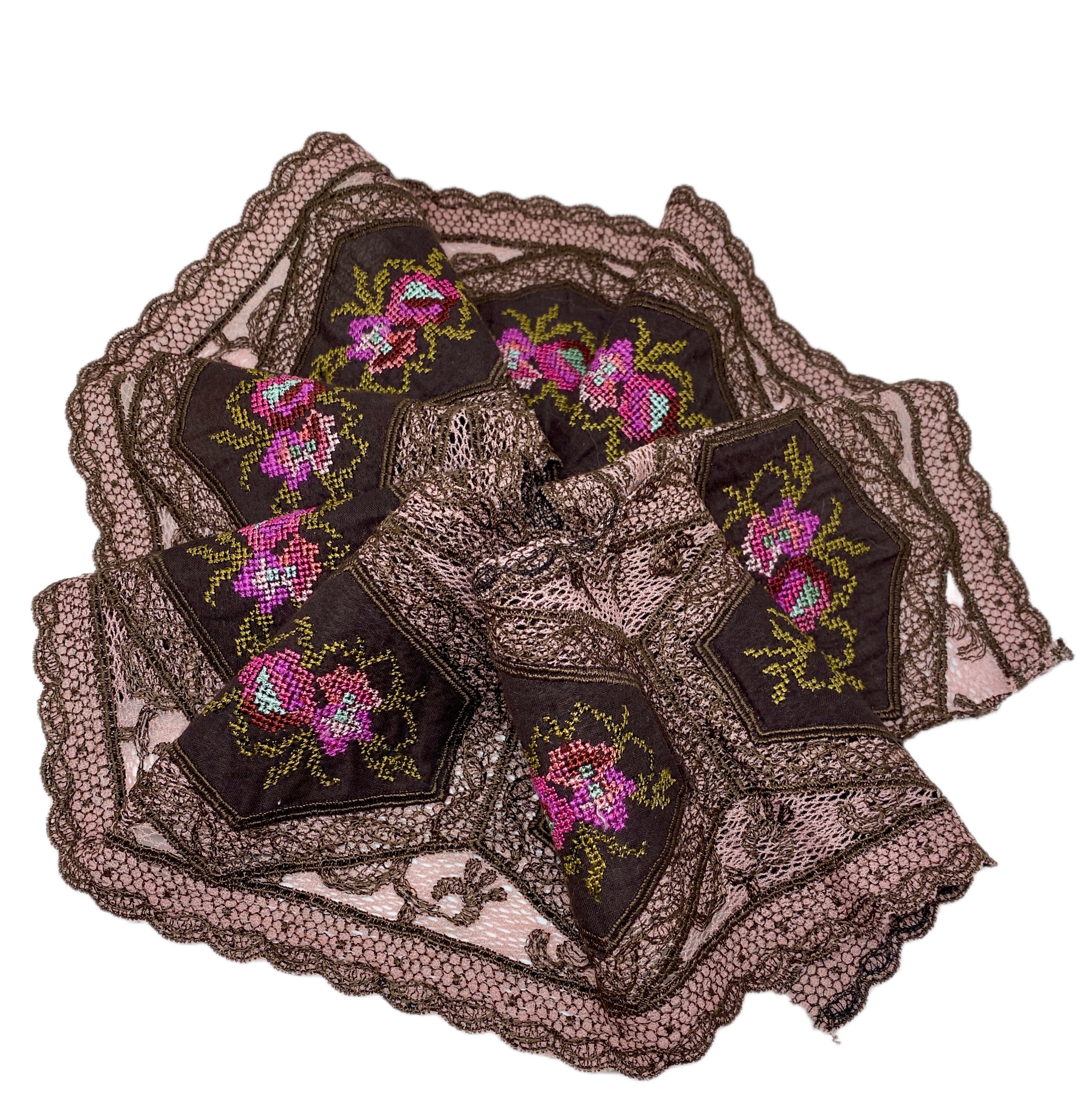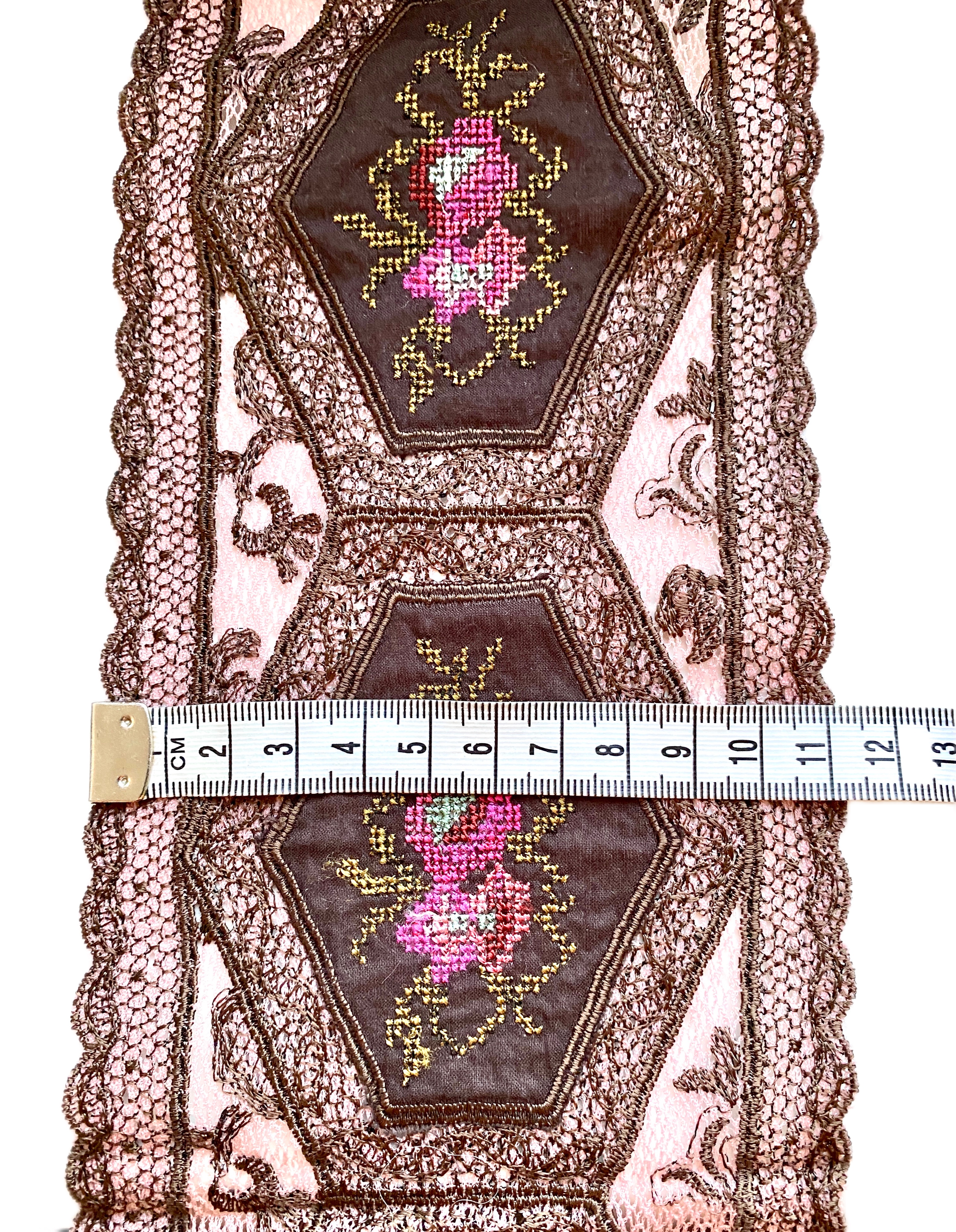 Декоративное кружево премиум‑класса : богатые узоры, цветная машинная вышивка на однотонных вставуках из шелка, фигурные края и благородные оттенки. Отлично подходит для белья, вечерних платьев, корсетов, сценических костюмов и дизайнерских деталей — когда нужен заметный и стильный декор.