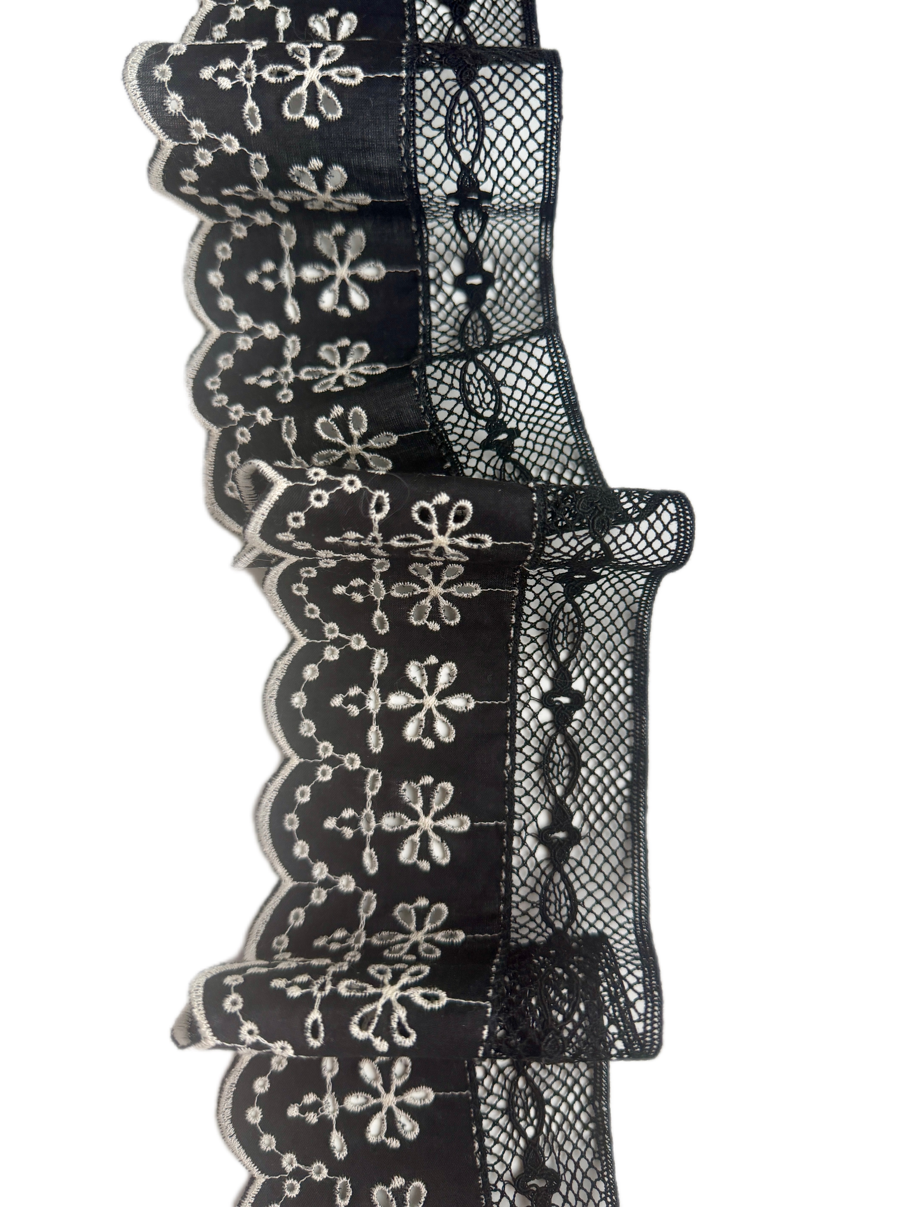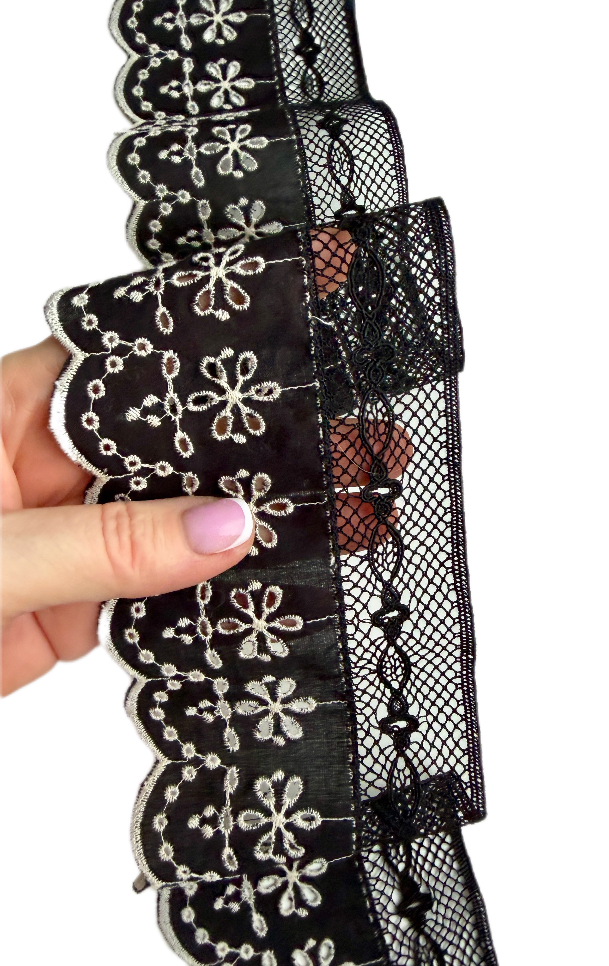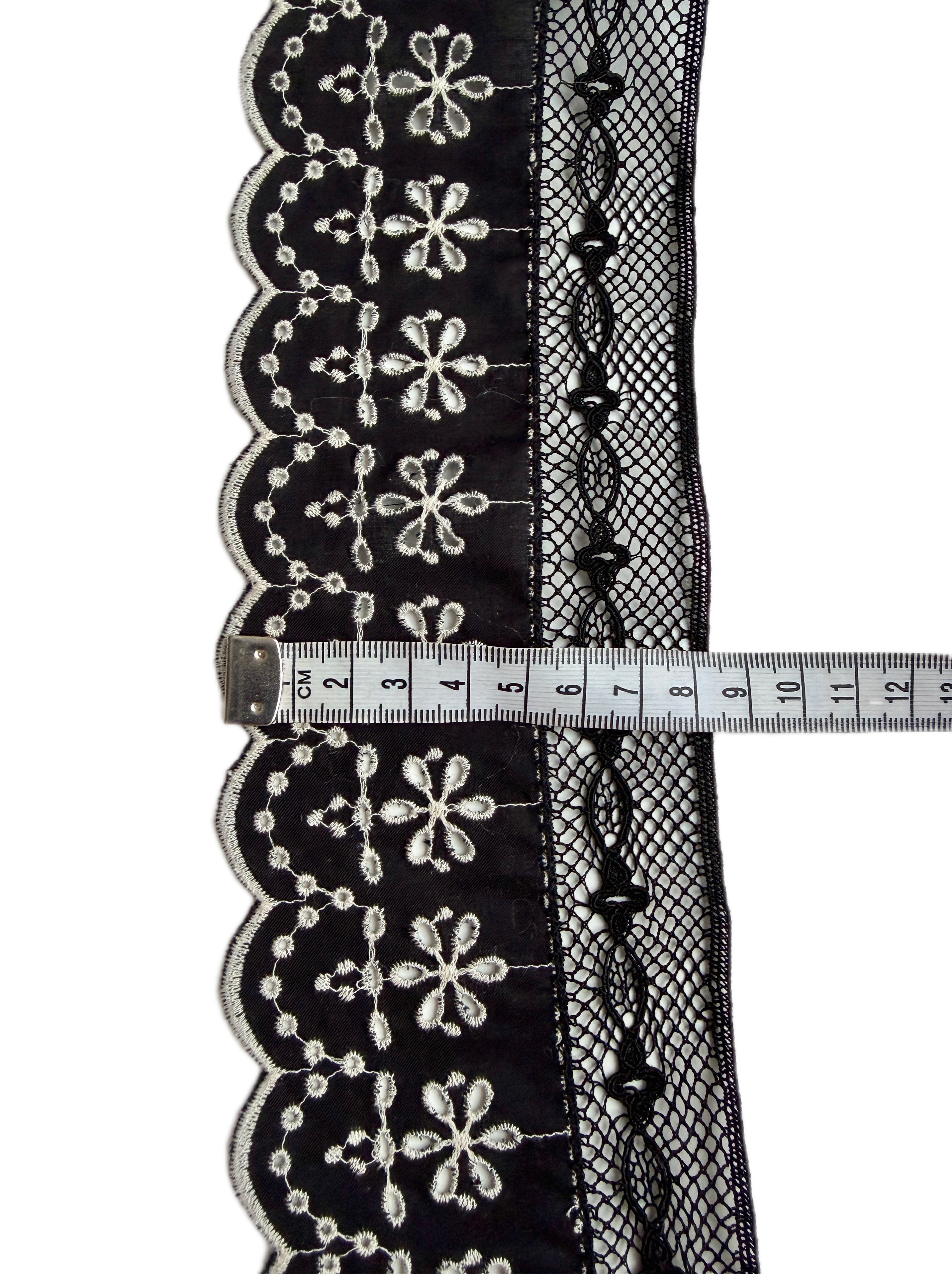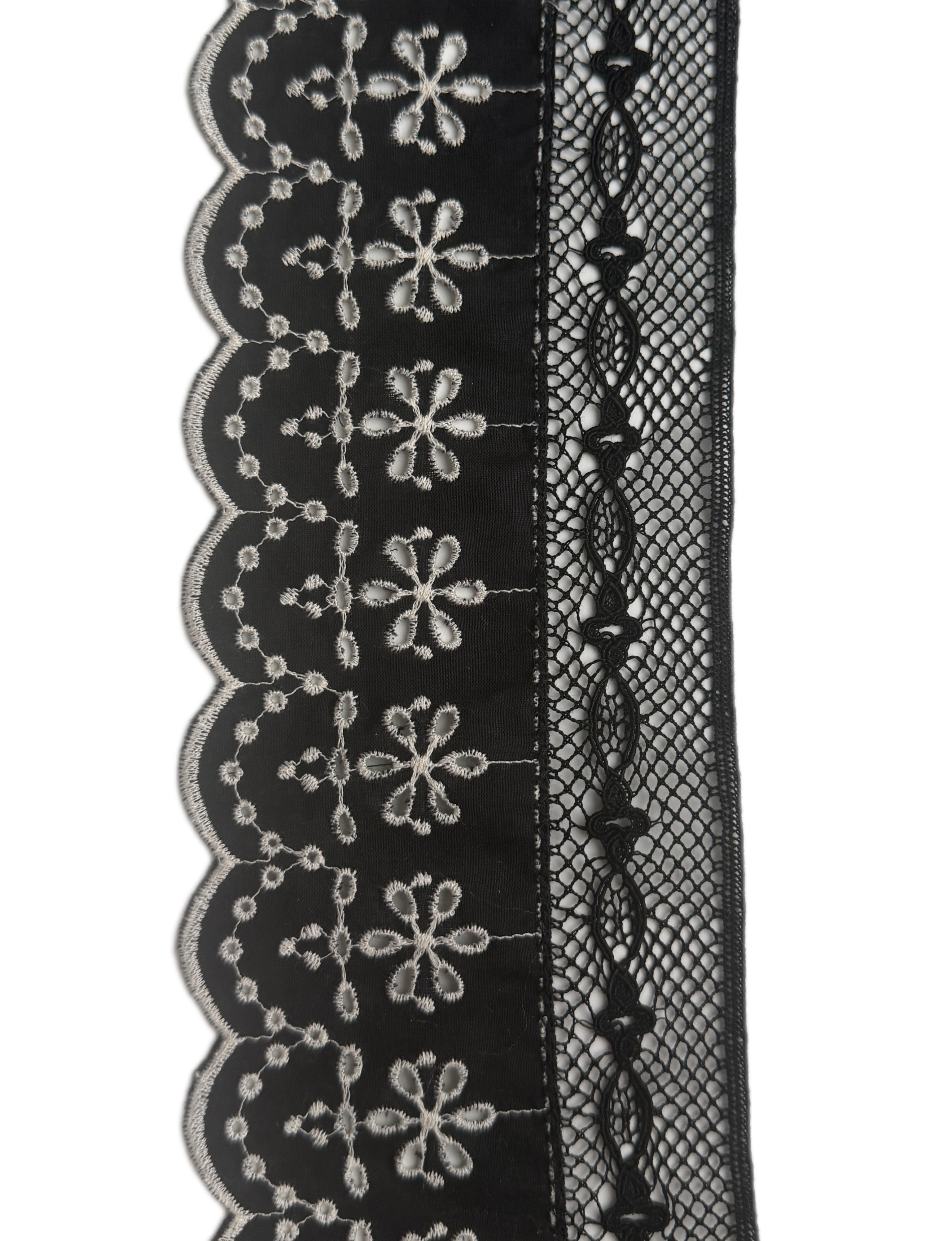 Черное кружево с вышивкой — изящный и натуральный материал для шитья и декоративной отделки. Кружево выполнено на хлопковой основе, украшено цветочной вышивкой с аккуратными прорезными элементами, обработанными молочной обстрочкой и дополнено ажурной сетчатой кромкой бежевого цвета . Край фигурный, мягко волнистый, что придаёт изделию аккуратный и законченный вид без дополнительной обработки.
