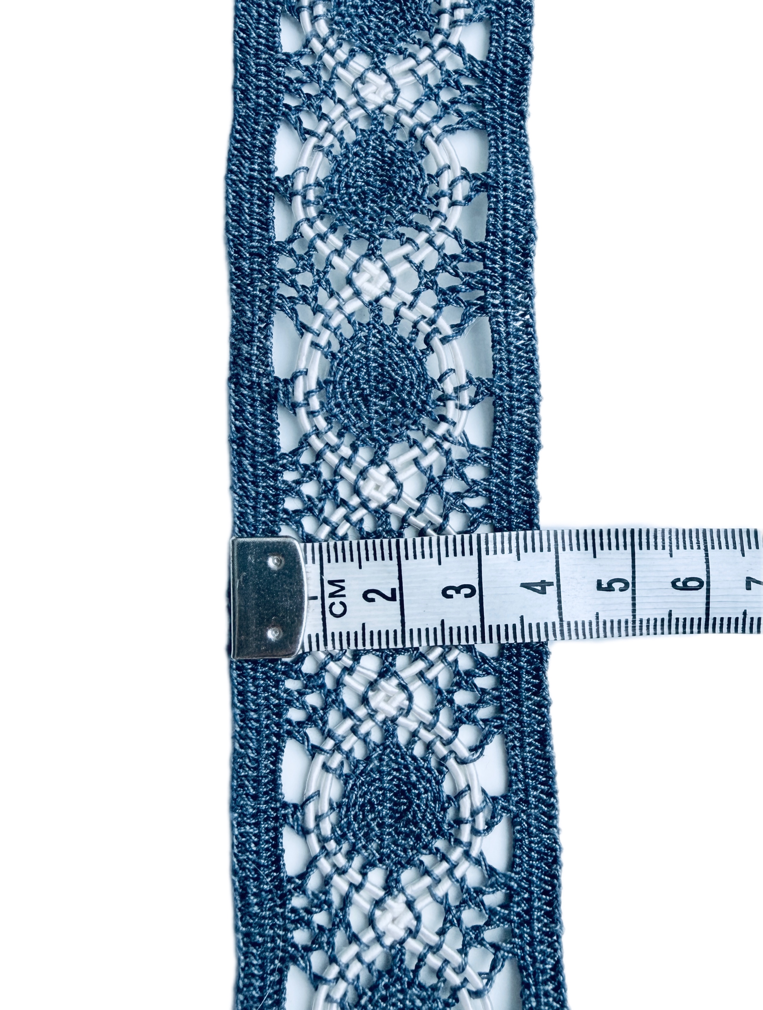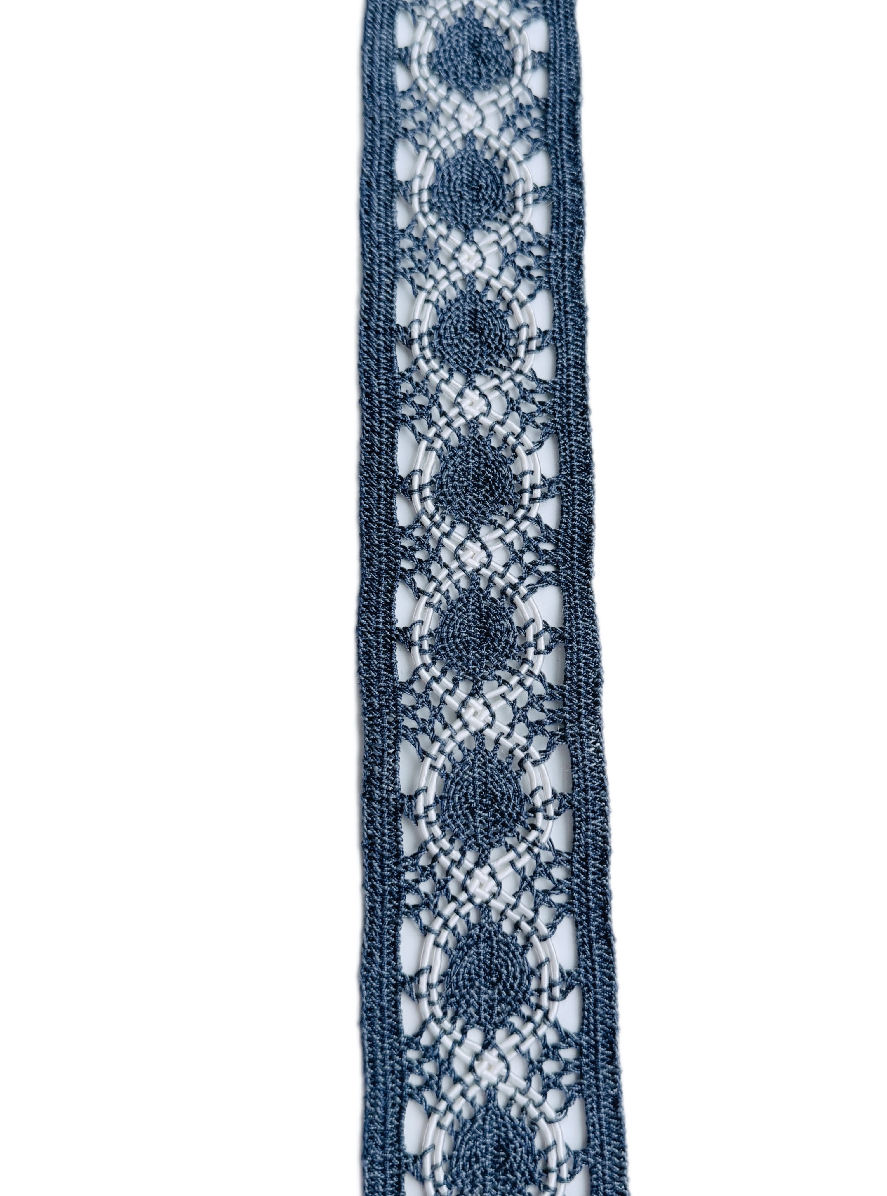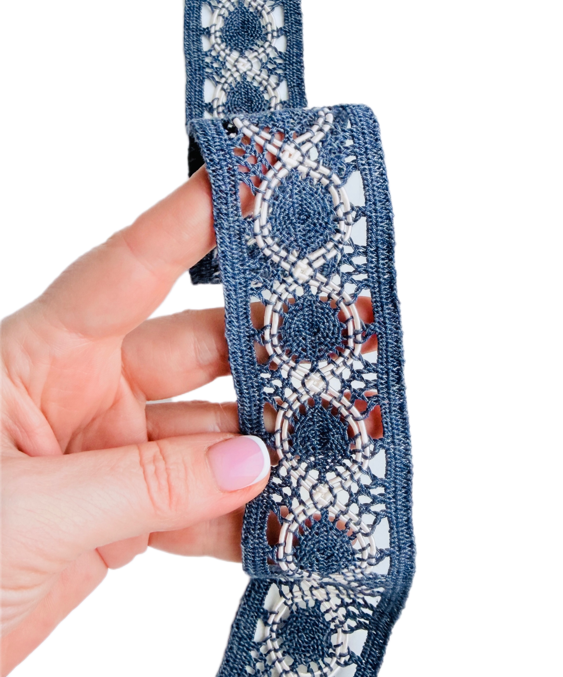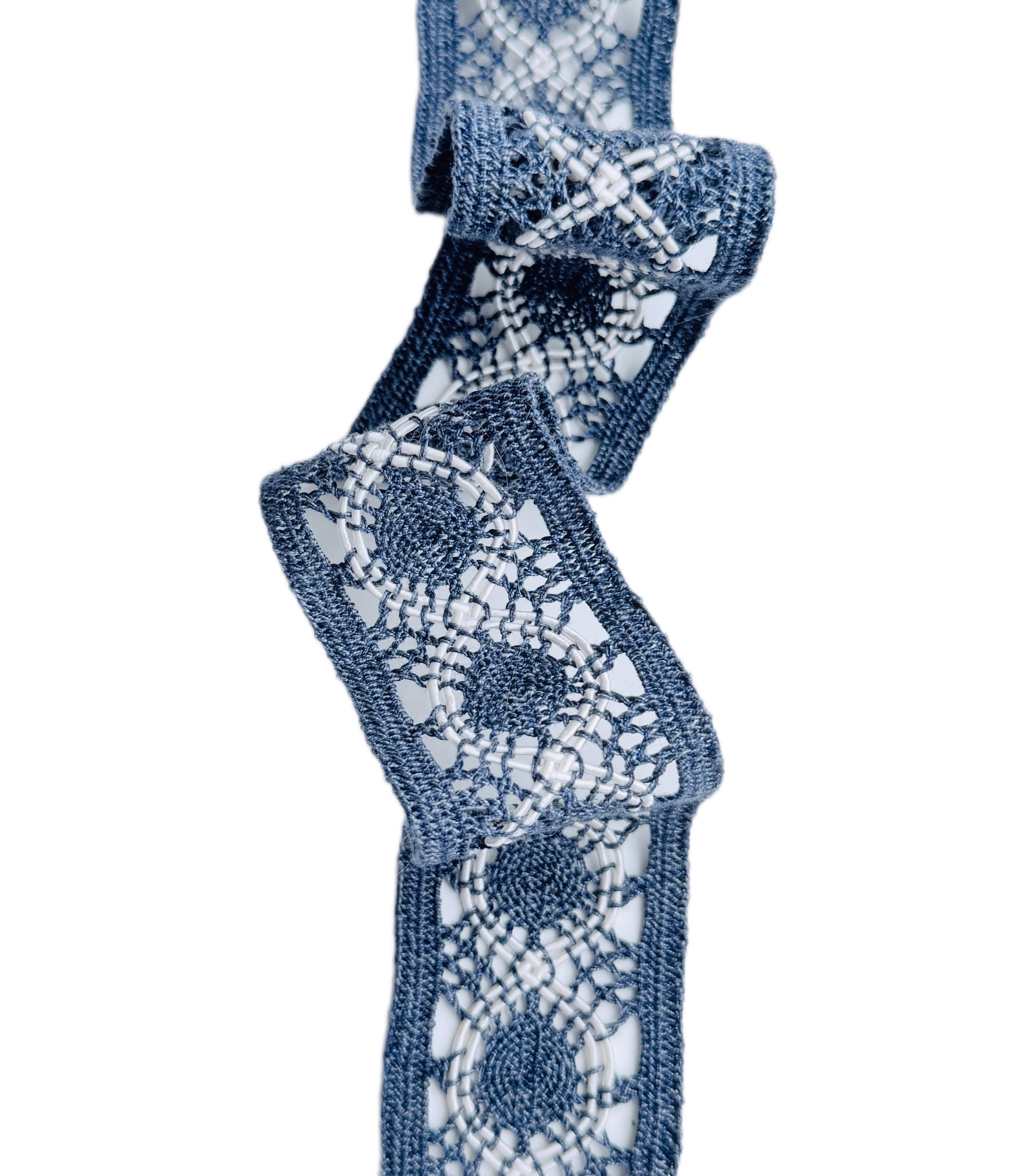 Кружево в джинсовом стиле — изящный и натуральный материал для шитья и декоративной отделки. Кружево выполнено в технике вязания крючком , украшено с обеих сторон элементами с плотным переплетением , что придаёт изделию аккуратный и законченный вид без дополнительной обработки.