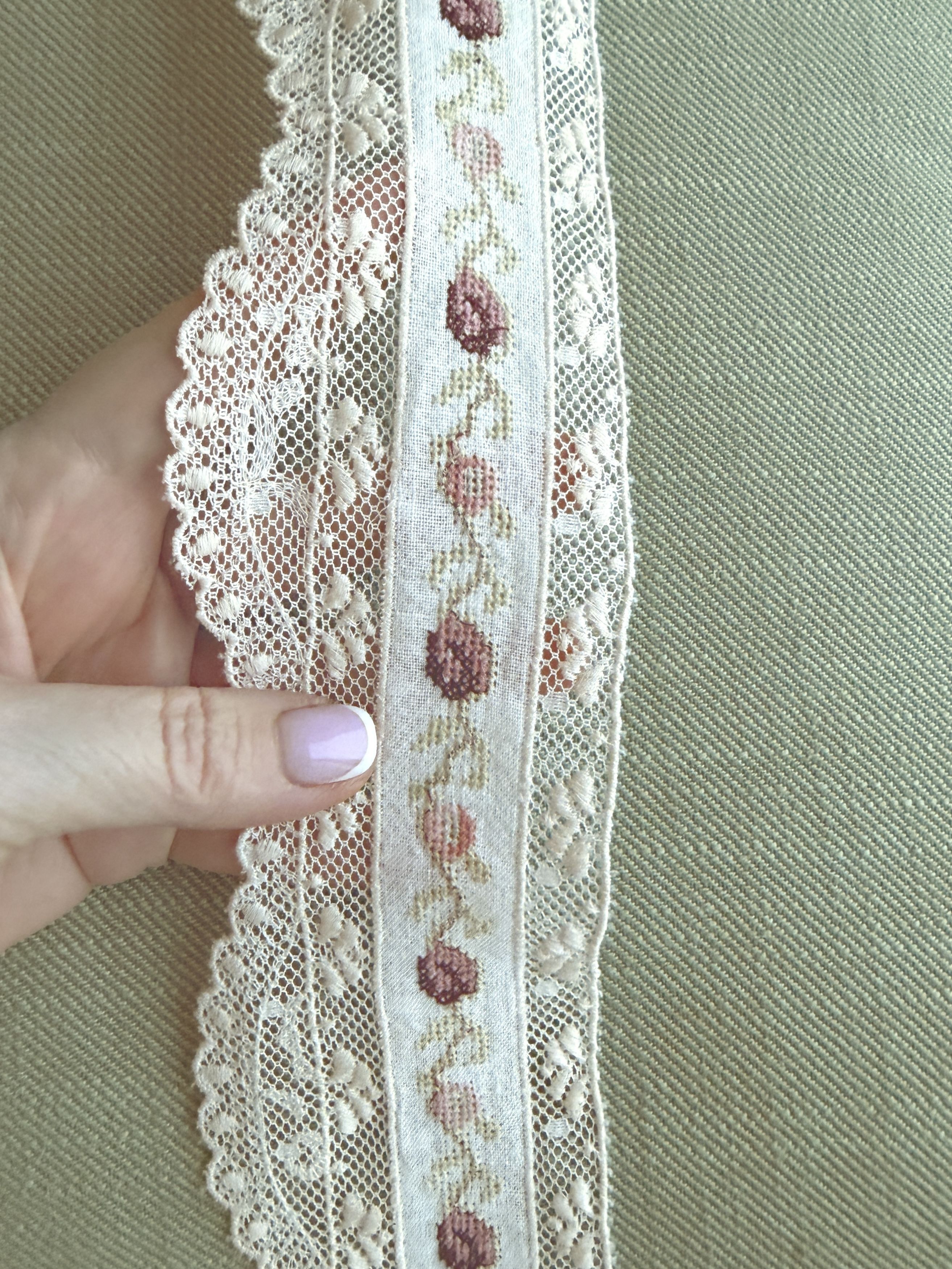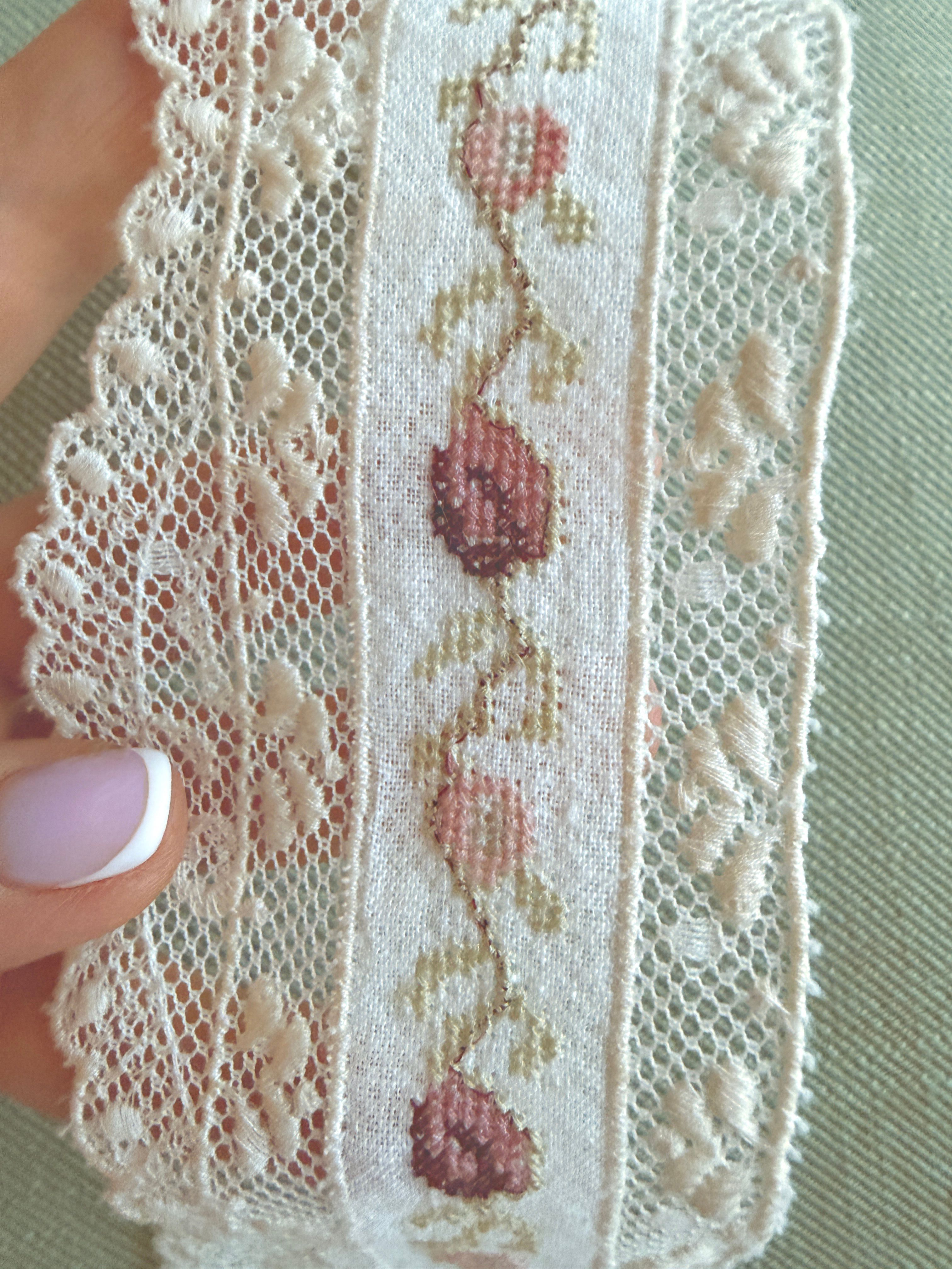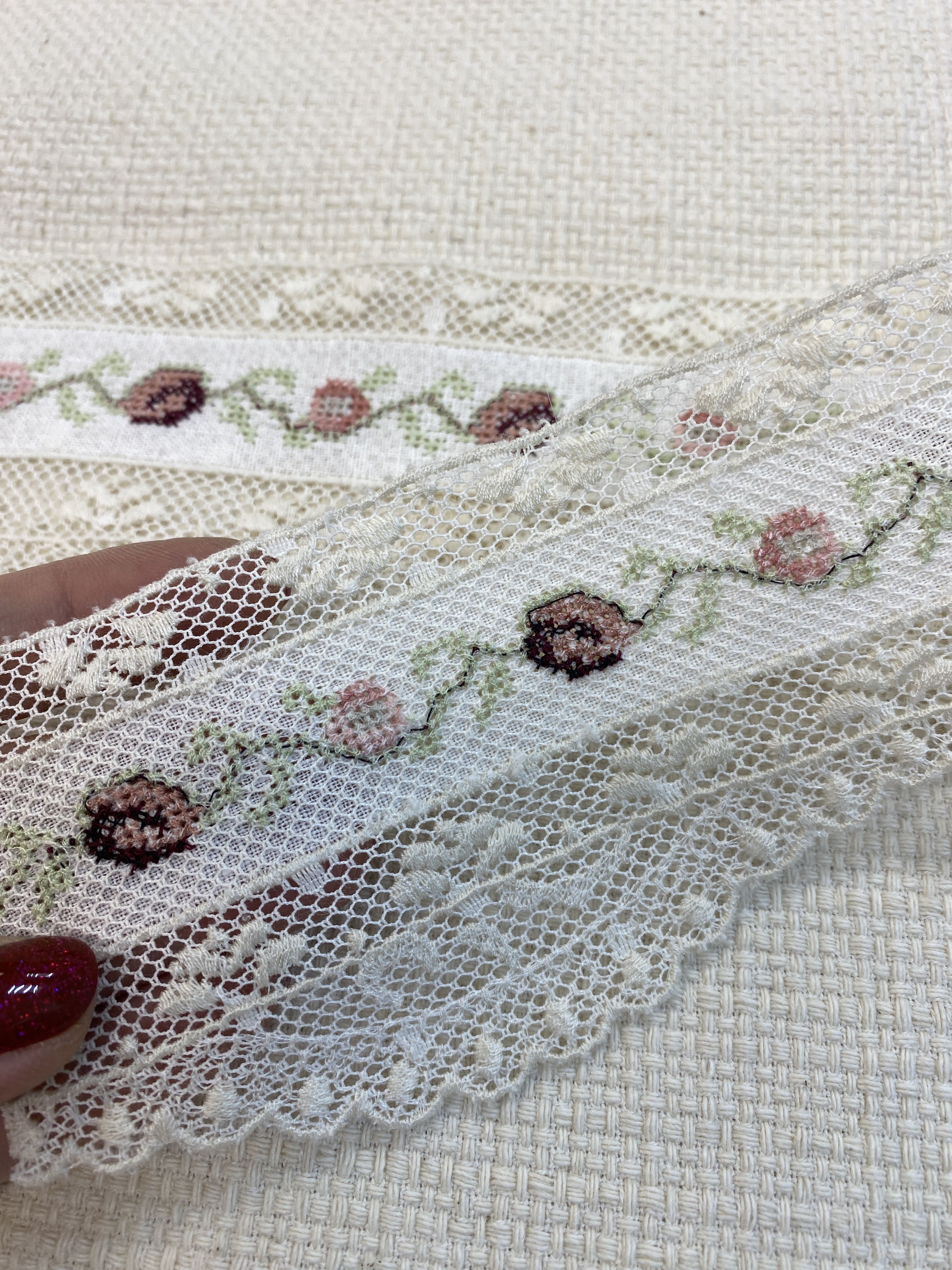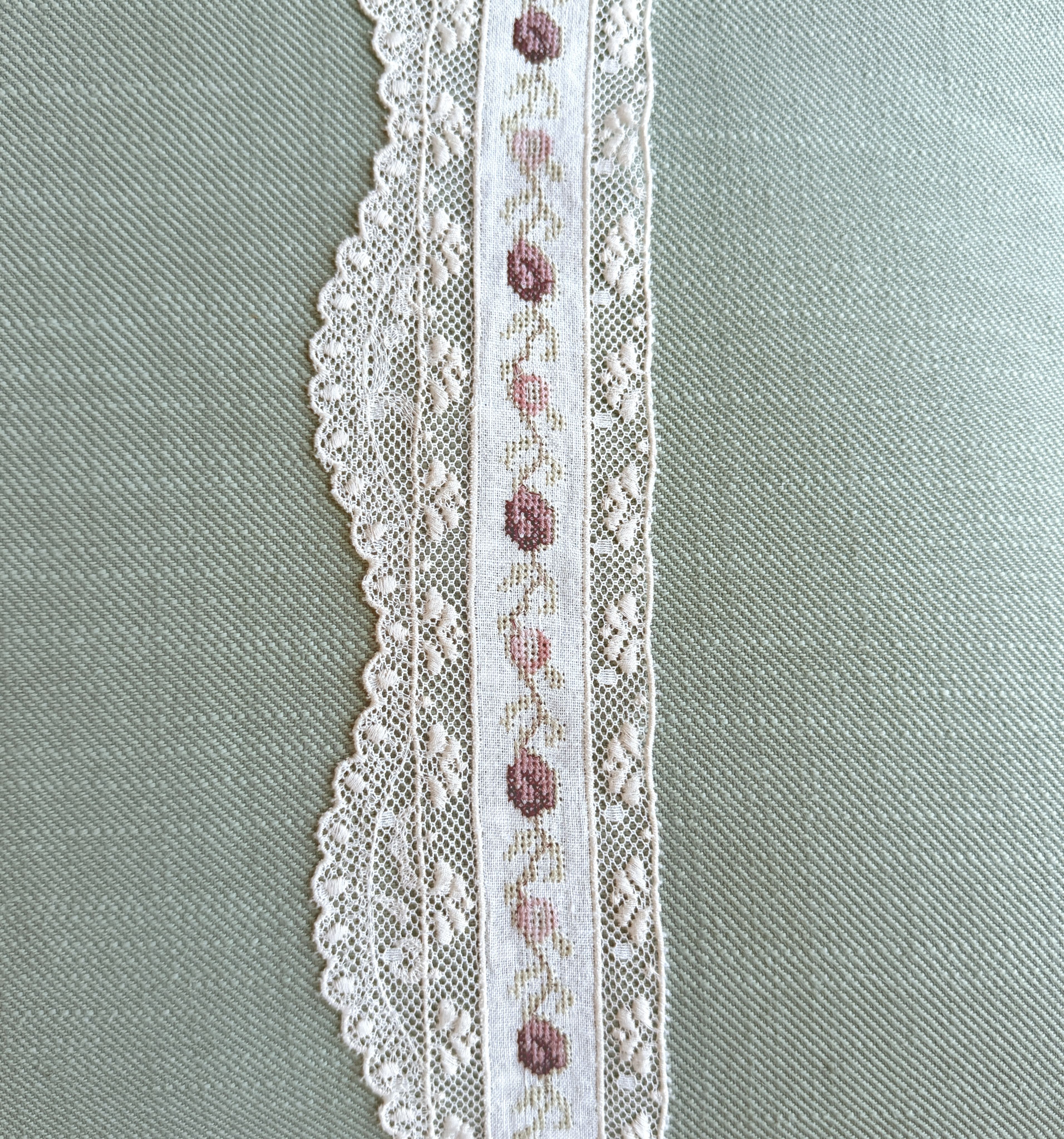 на сетке из тончайшего хлопка расположена вышивка на хлопковой основе в розовых, бордо и салатных тонах