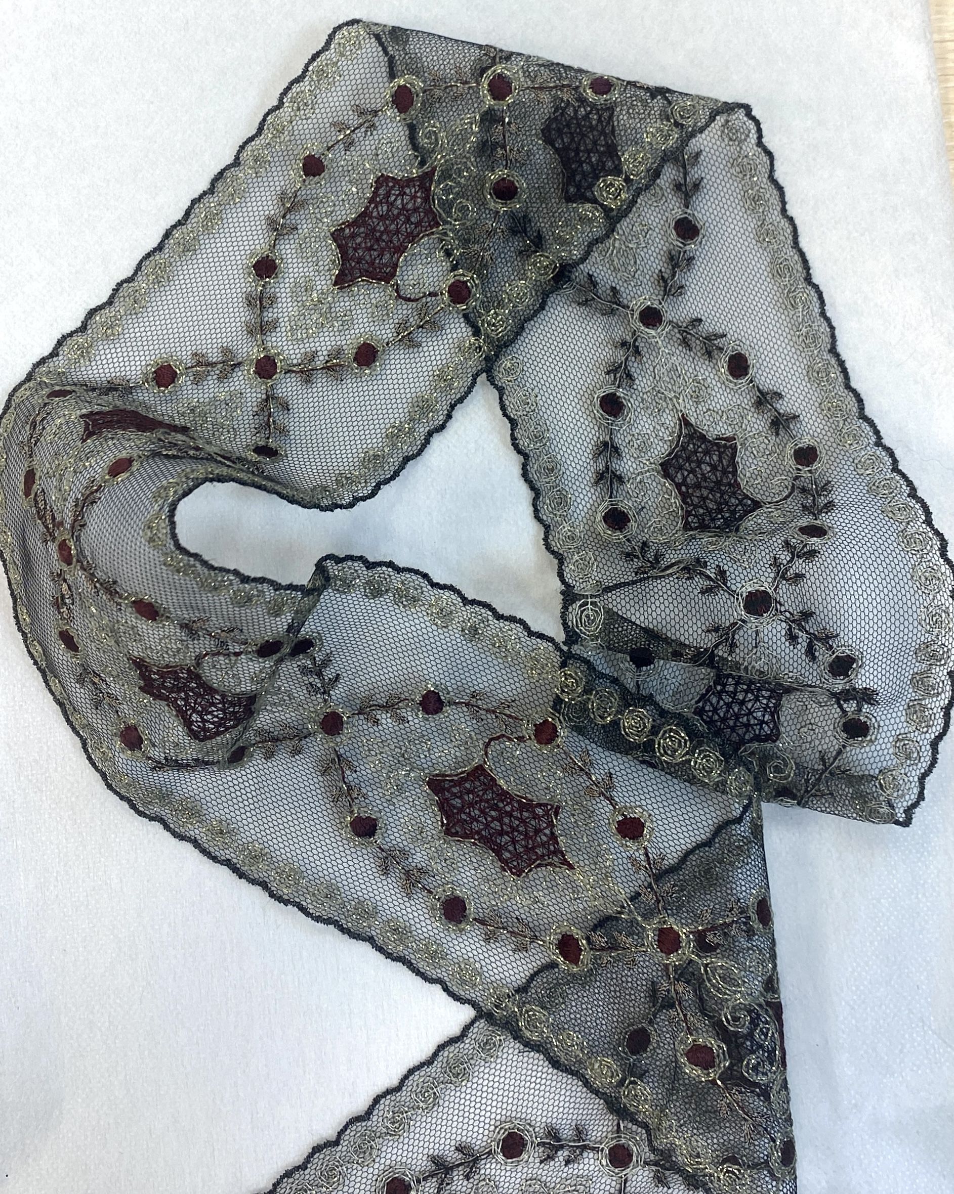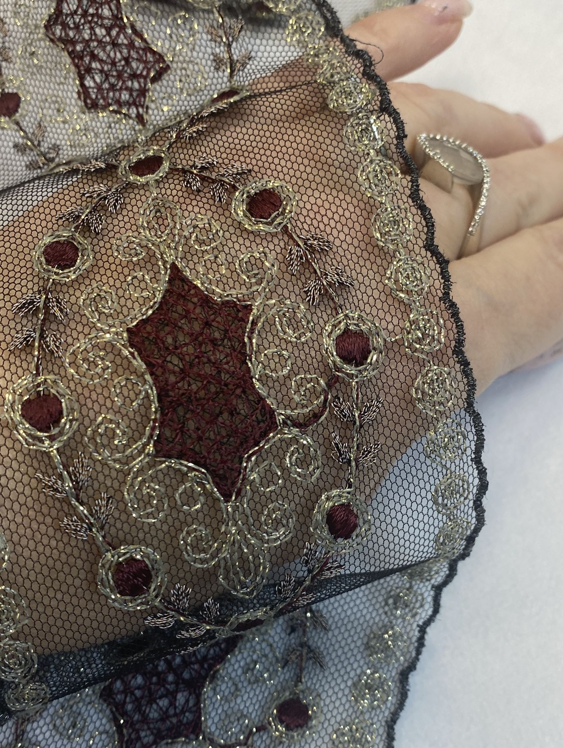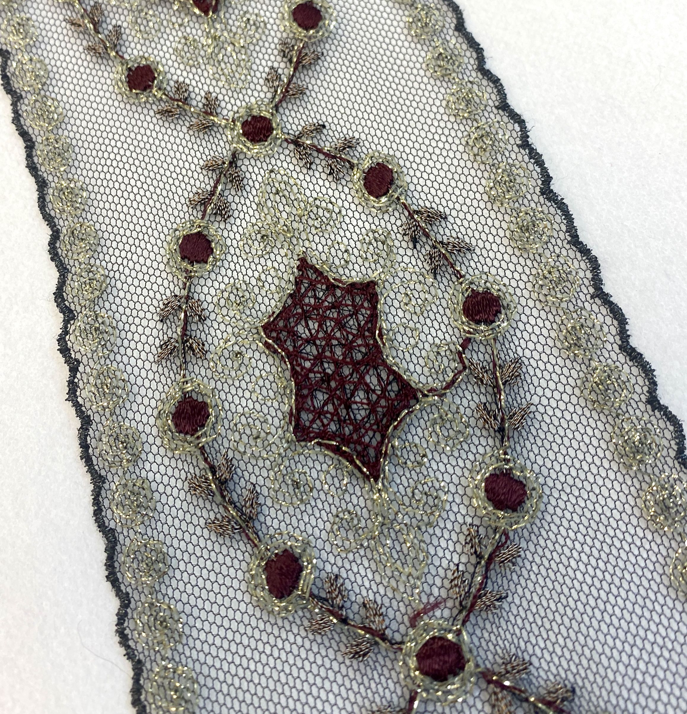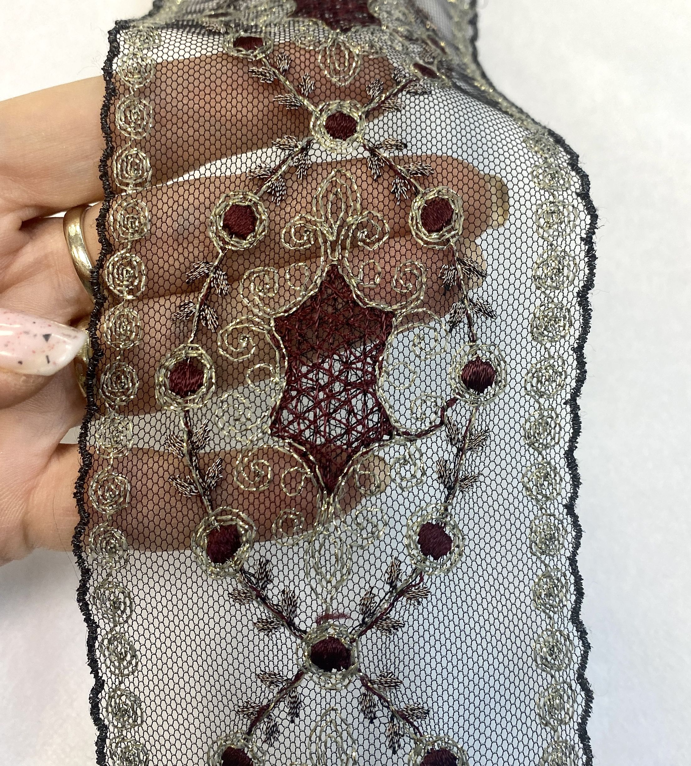 Цвет сетки -черный, вышивка на ней представлена темно-бордовым и серыми цветами с золотым люрексом