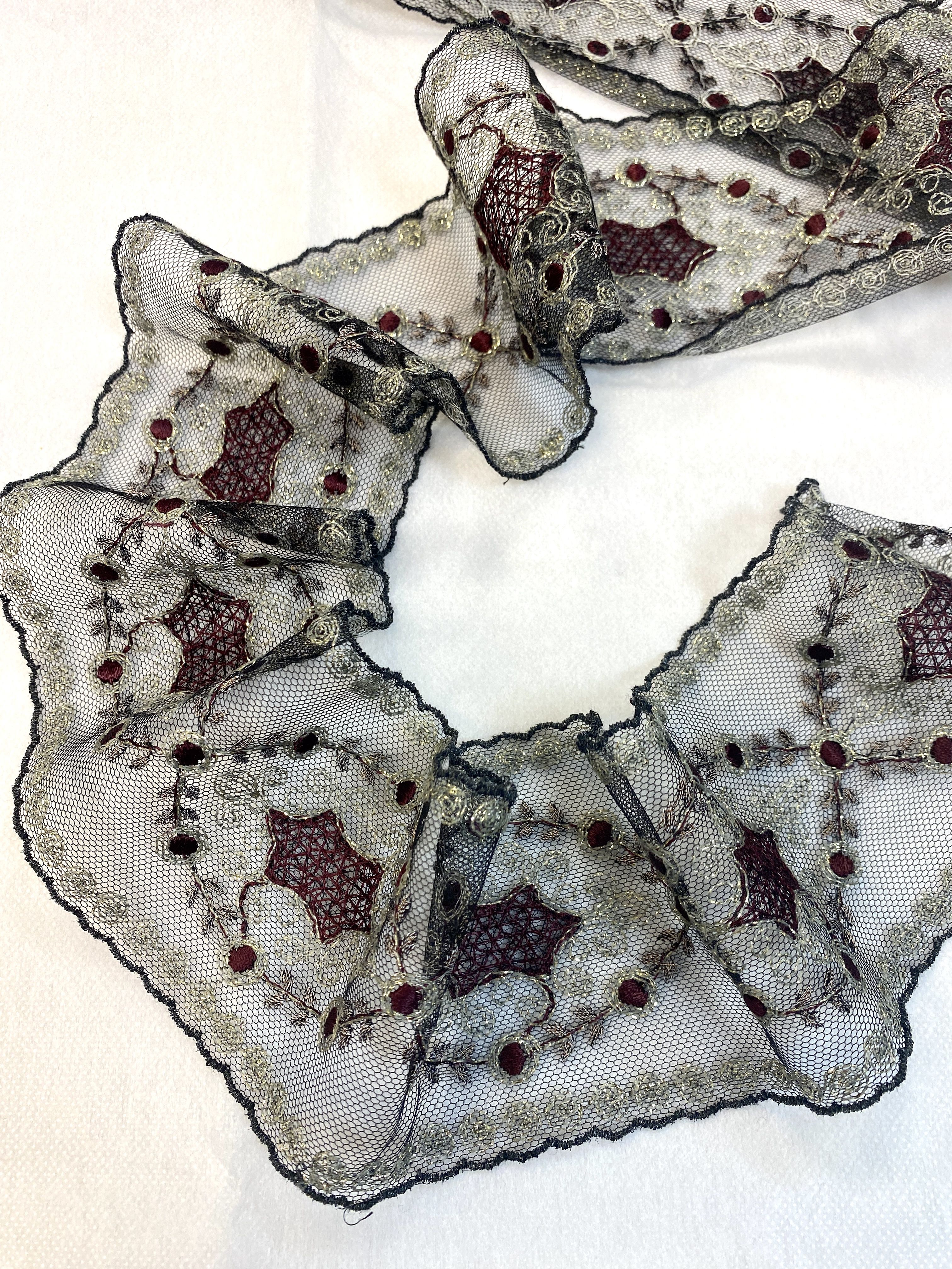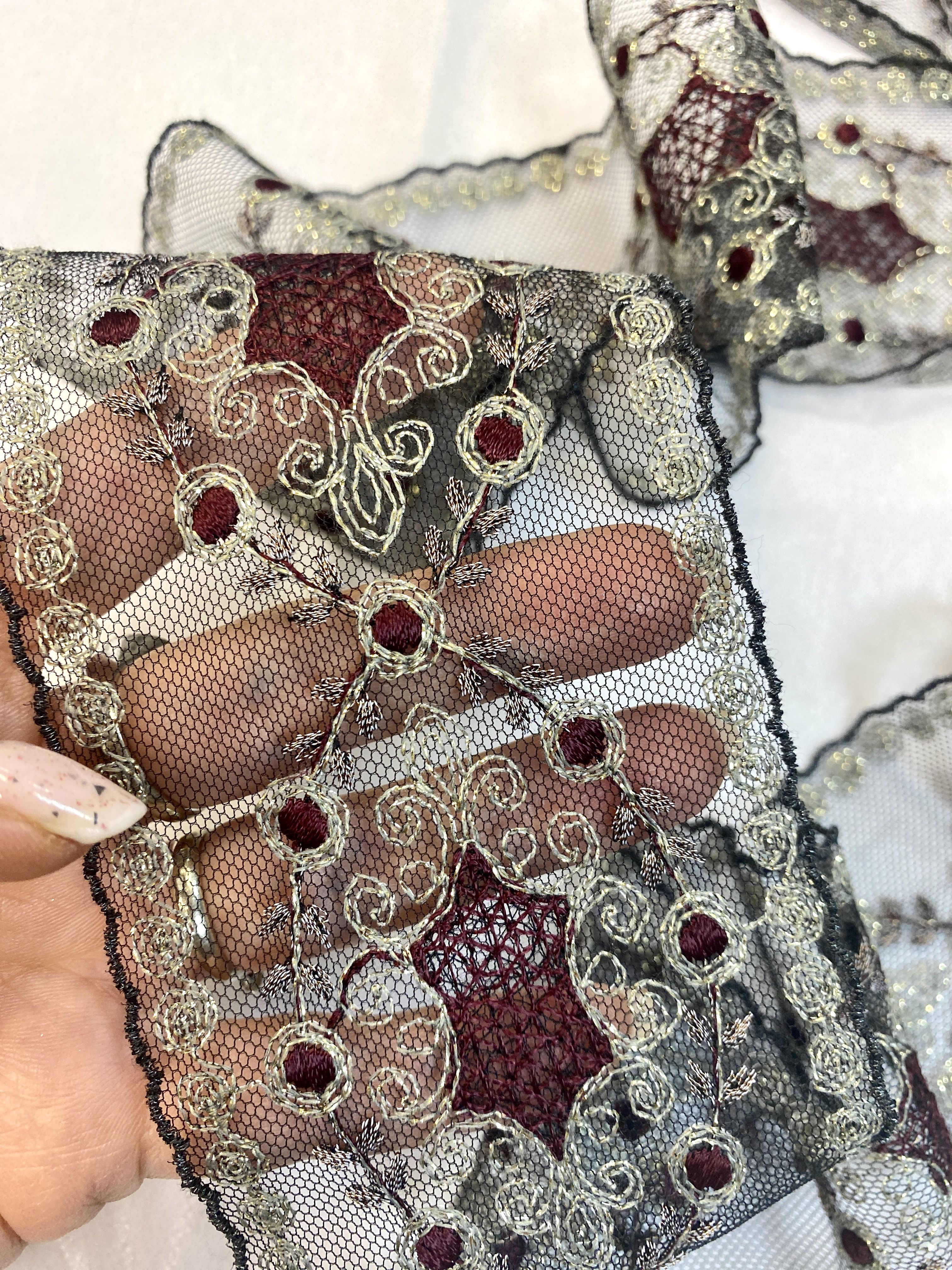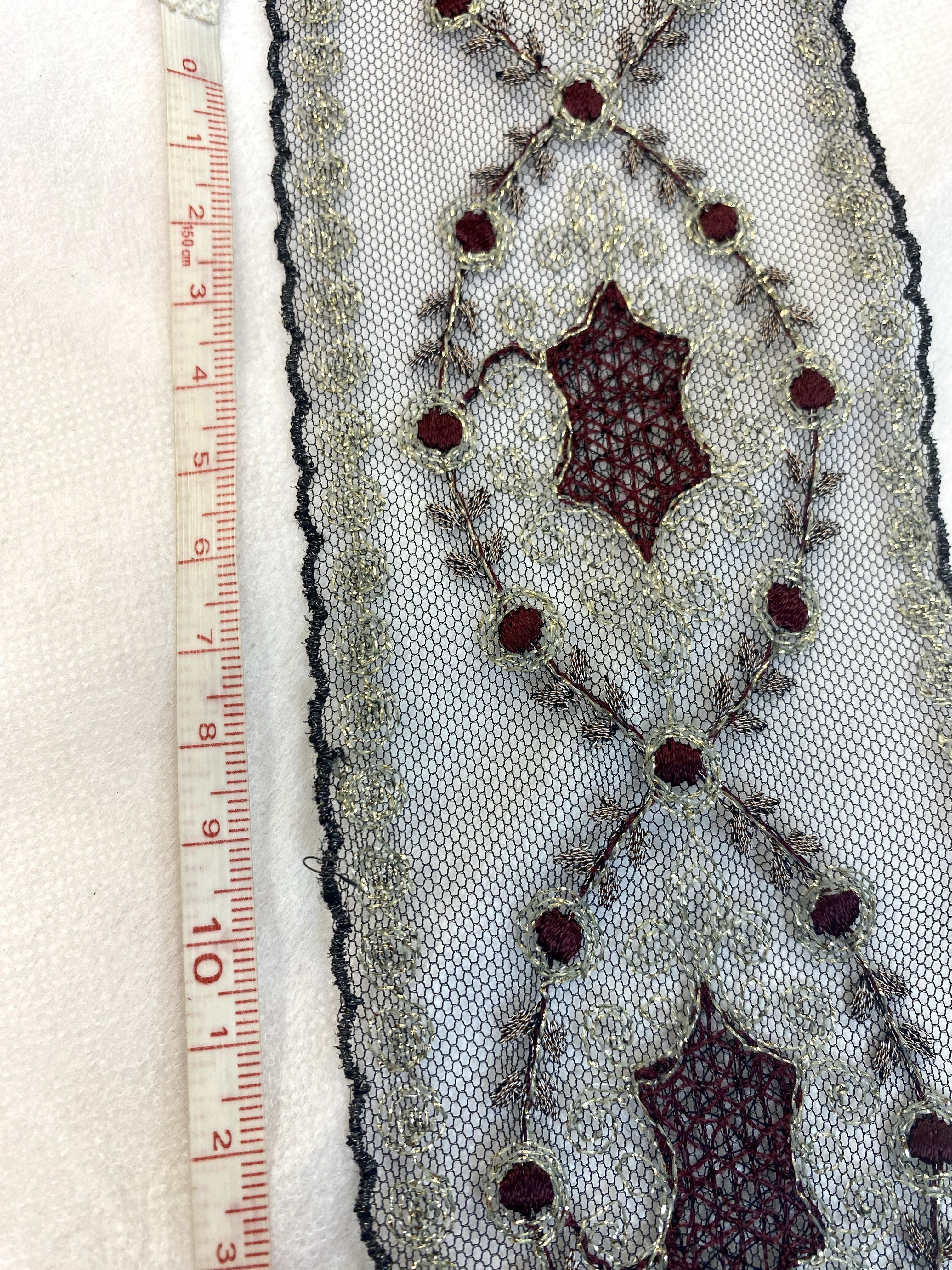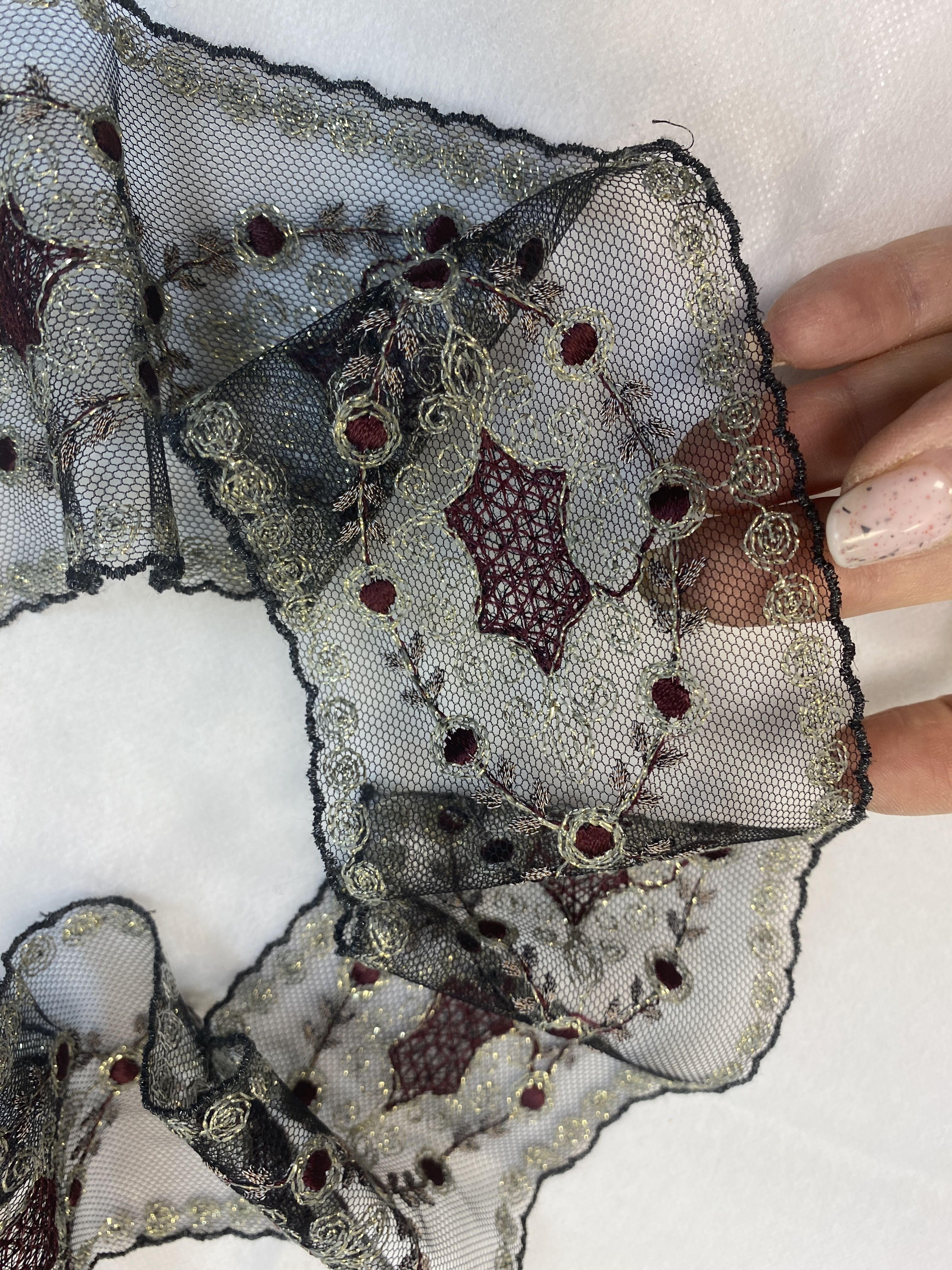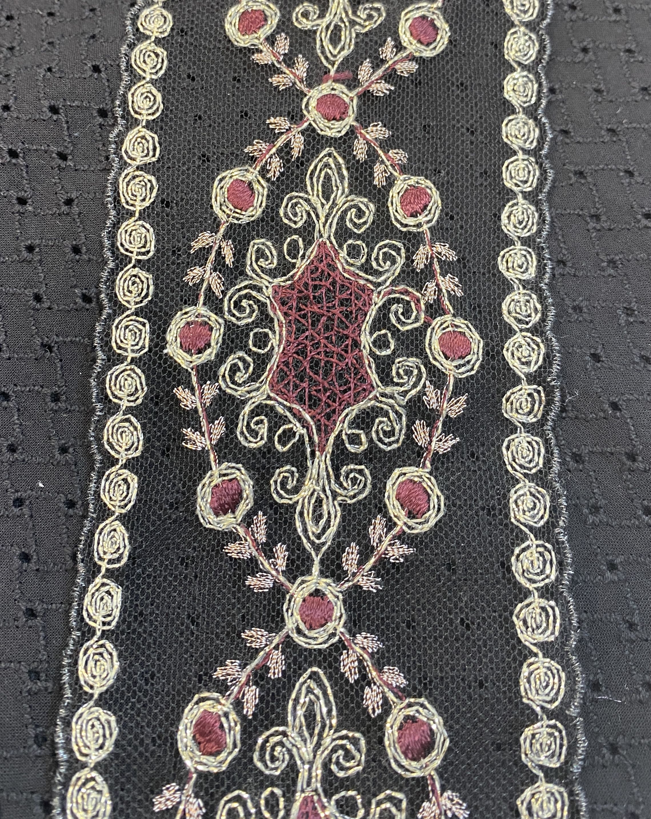 Цвет сетки -черный, вышивка на ней представлена темно-бордовым и серыми цветами с золотым люрексом