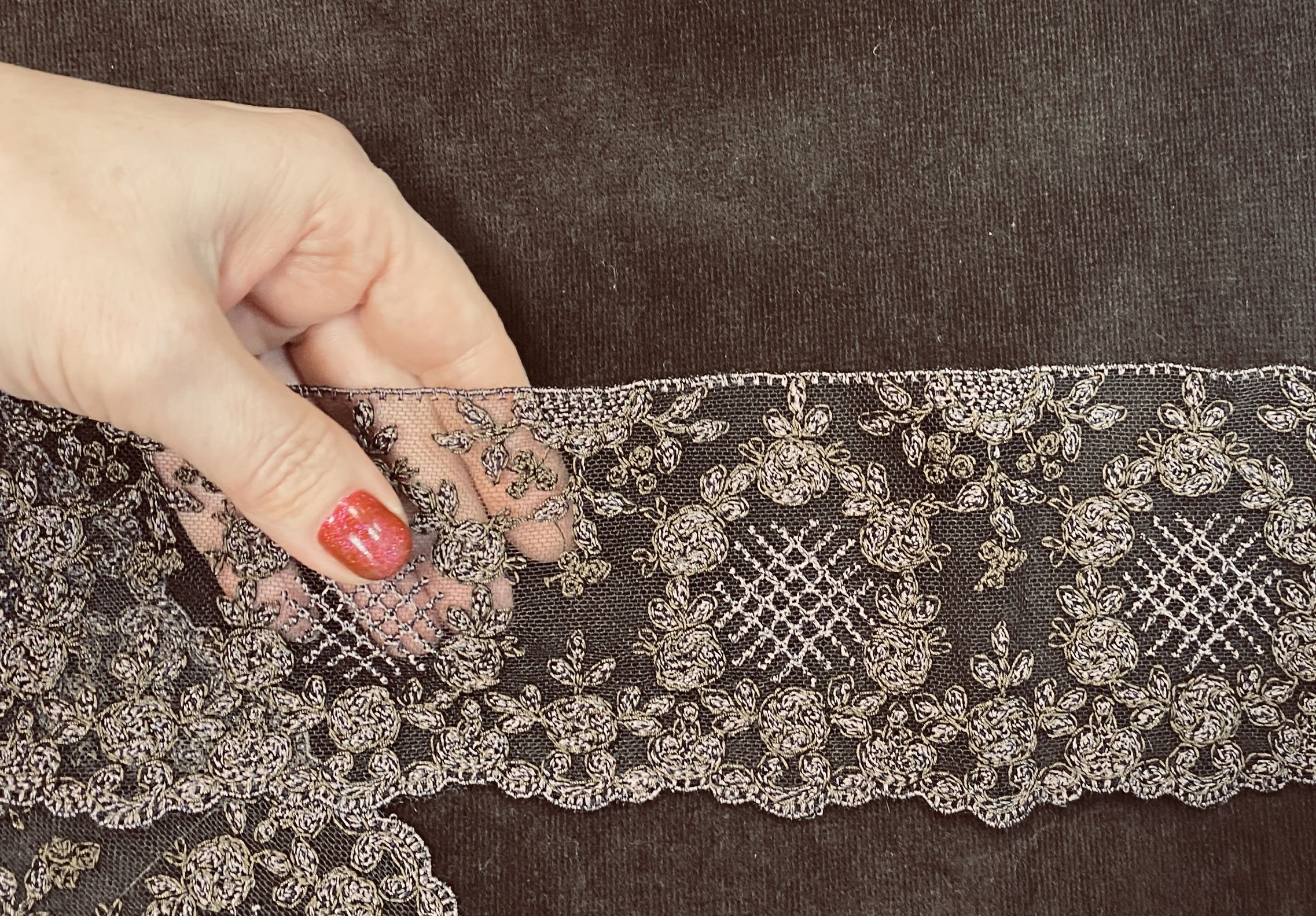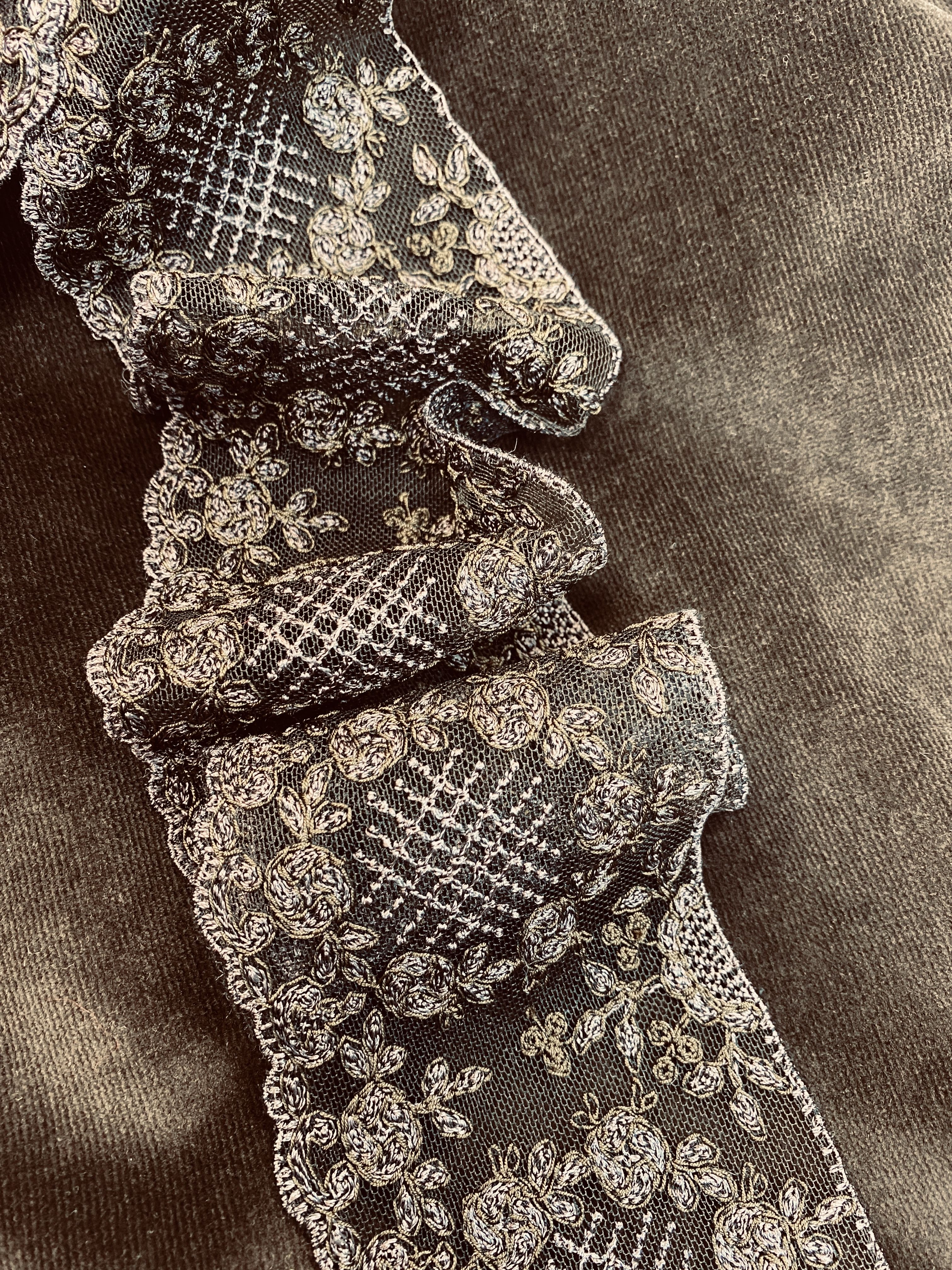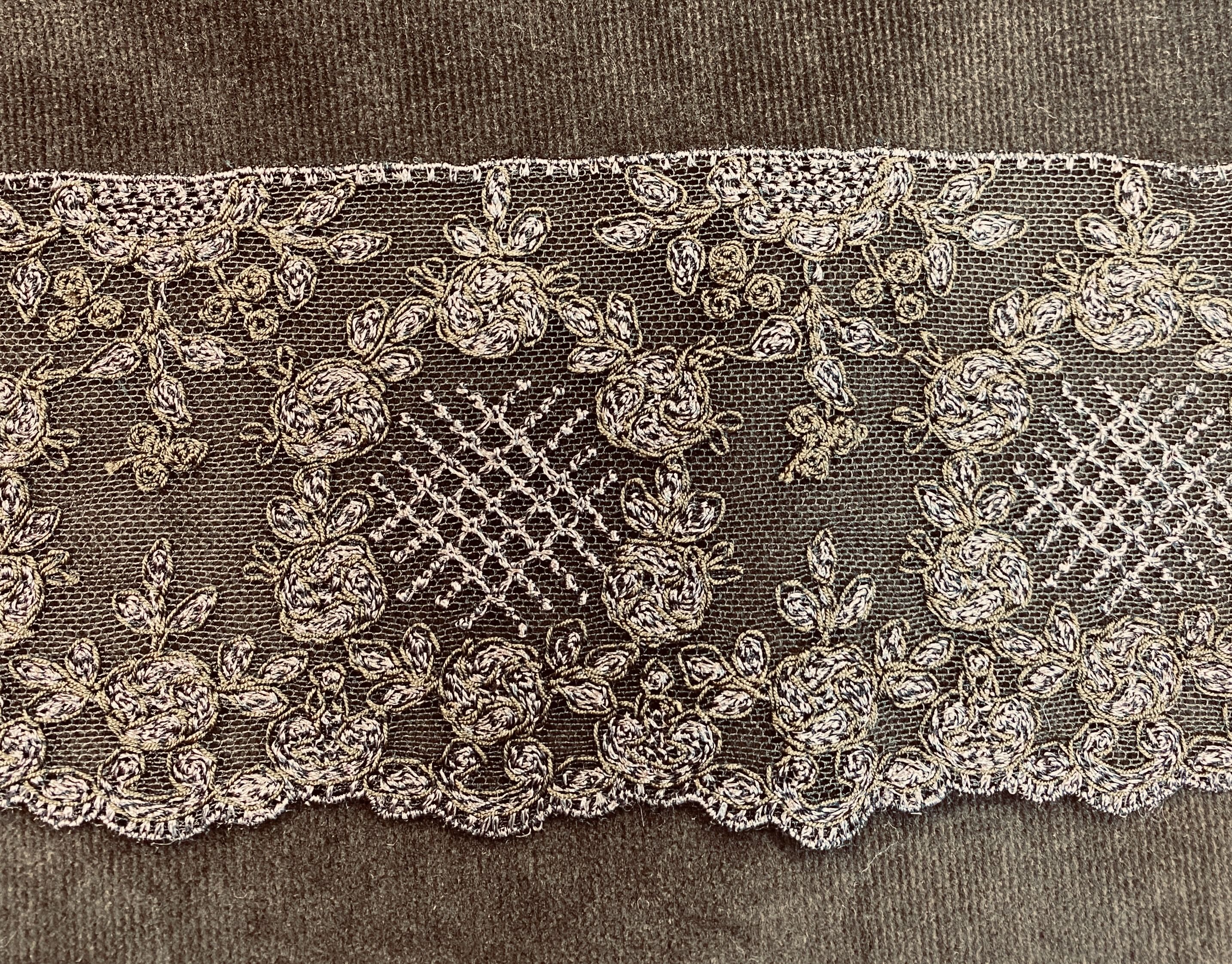 на сетке из тончайшего шелка расположена вышивка из хлопковой и шелковой нити в 2-х тонах цвета горького шоколада