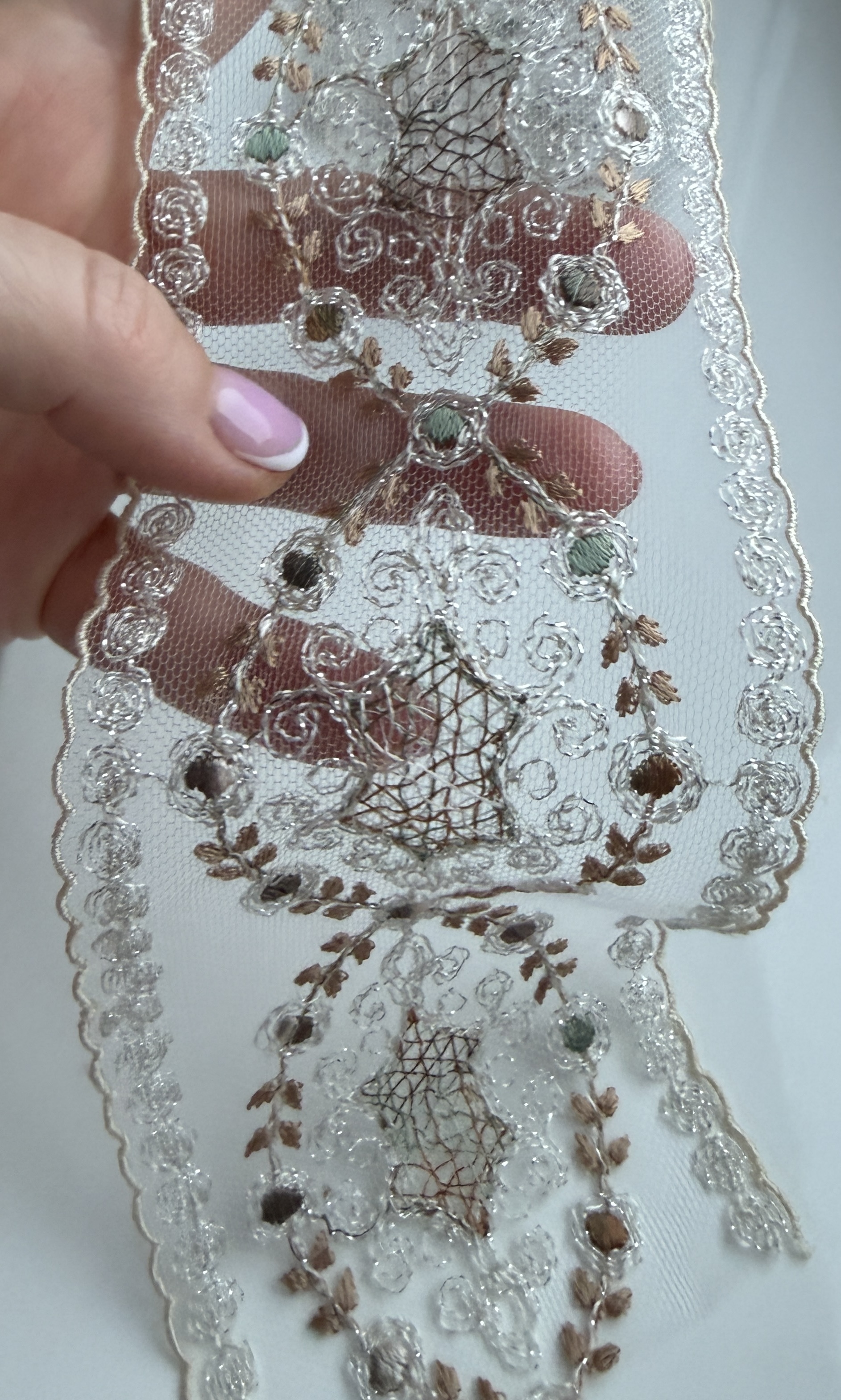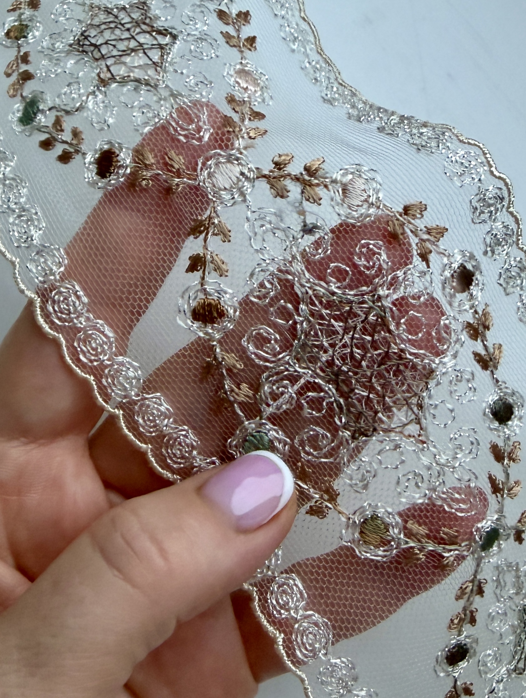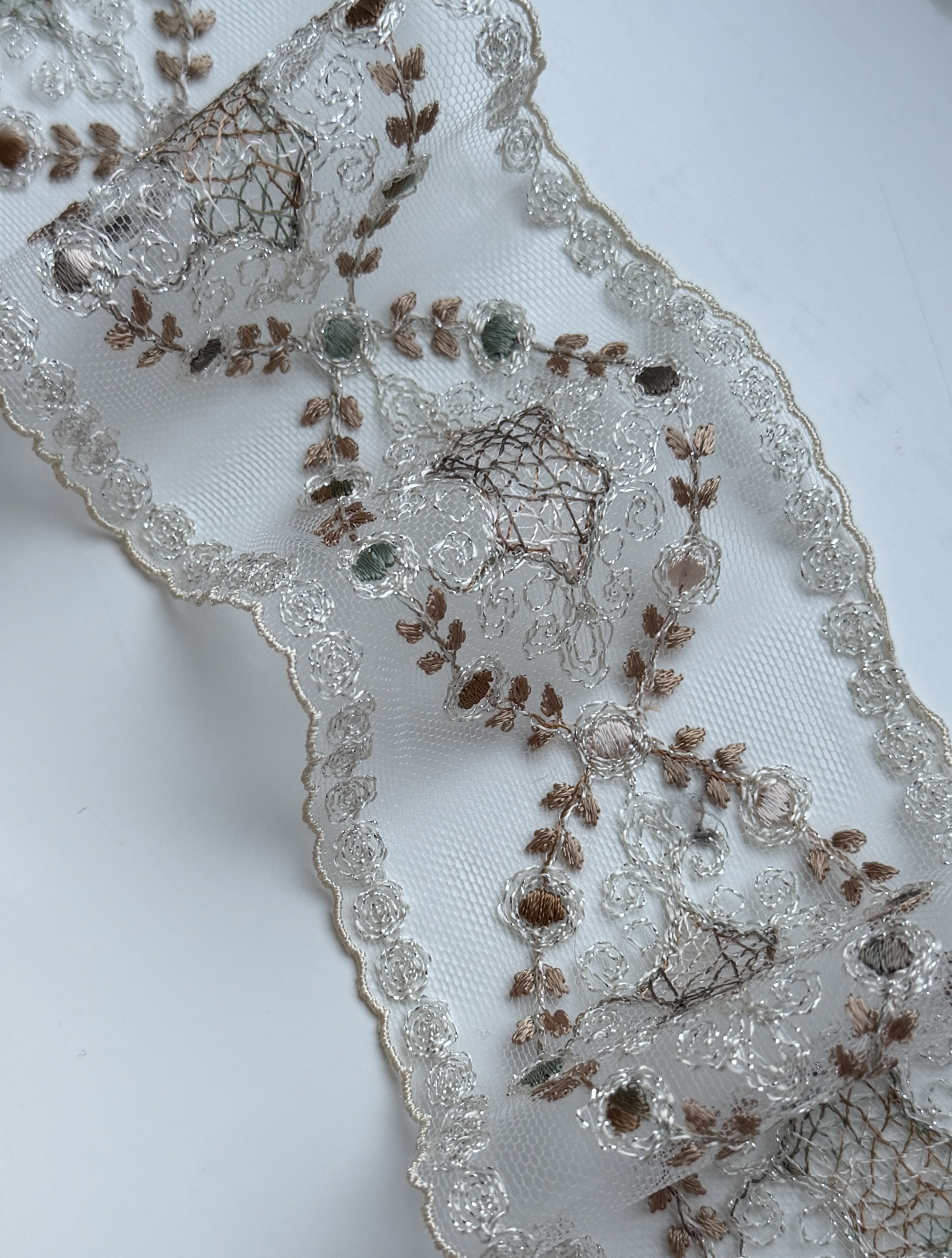 Тонкое цветное кружево с изящным деликатным узором в бежево-молочных тонах с деликатным серебристым люрексом .Мелкие пудрово- оливковые шелковые сердцевинки на мелкой мягкой сетке придают перелив и игру оттенков. Кружево лёгкое, полупрозрачное, с чётко прорисованными контурами узоров. Полотно мягкое, хорошо драпируется и аккуратно ложится в изделии. Не колкое! Край естественный фистонный подчёркивает плавность линий и утончённость рисунка.