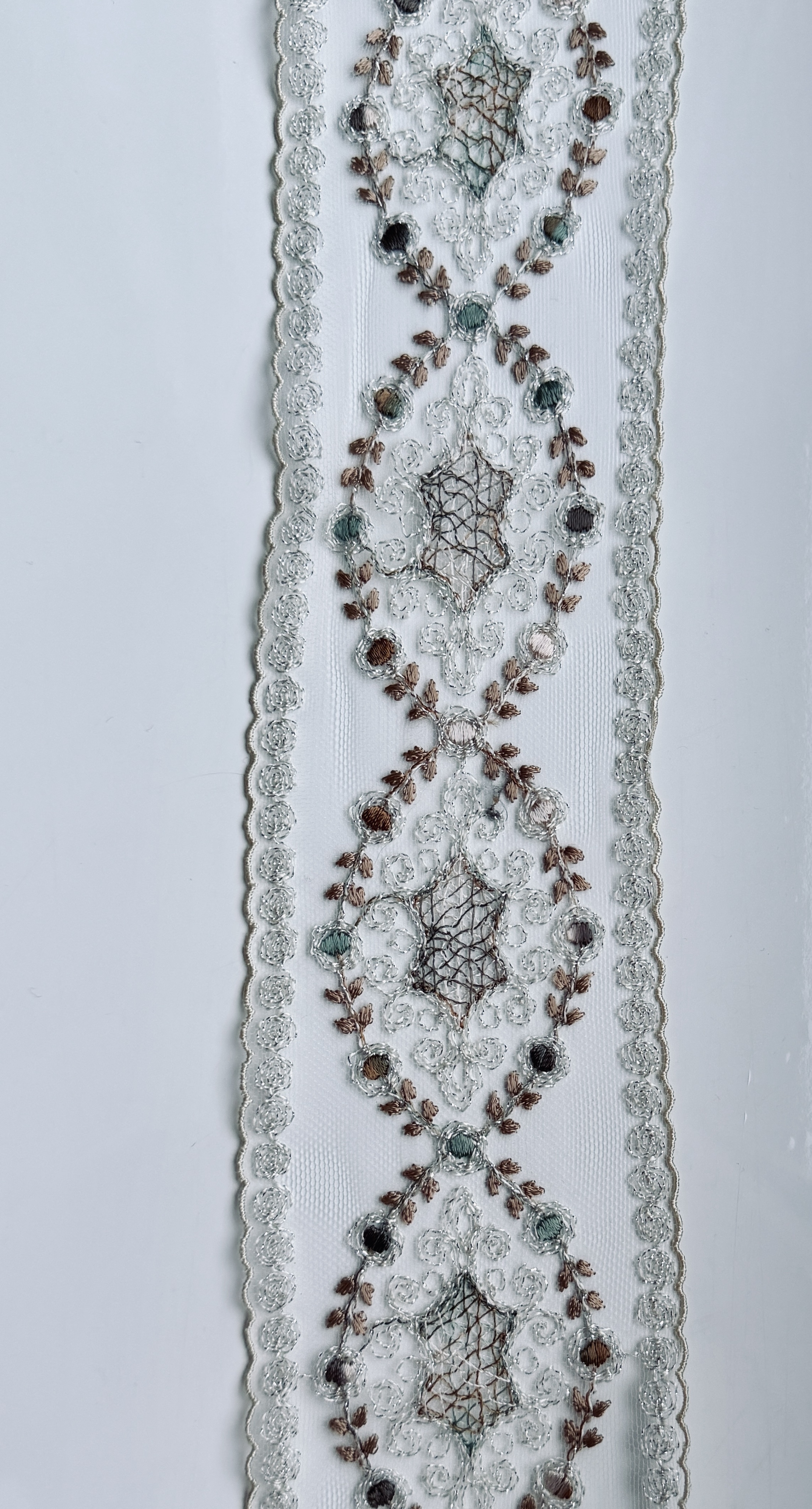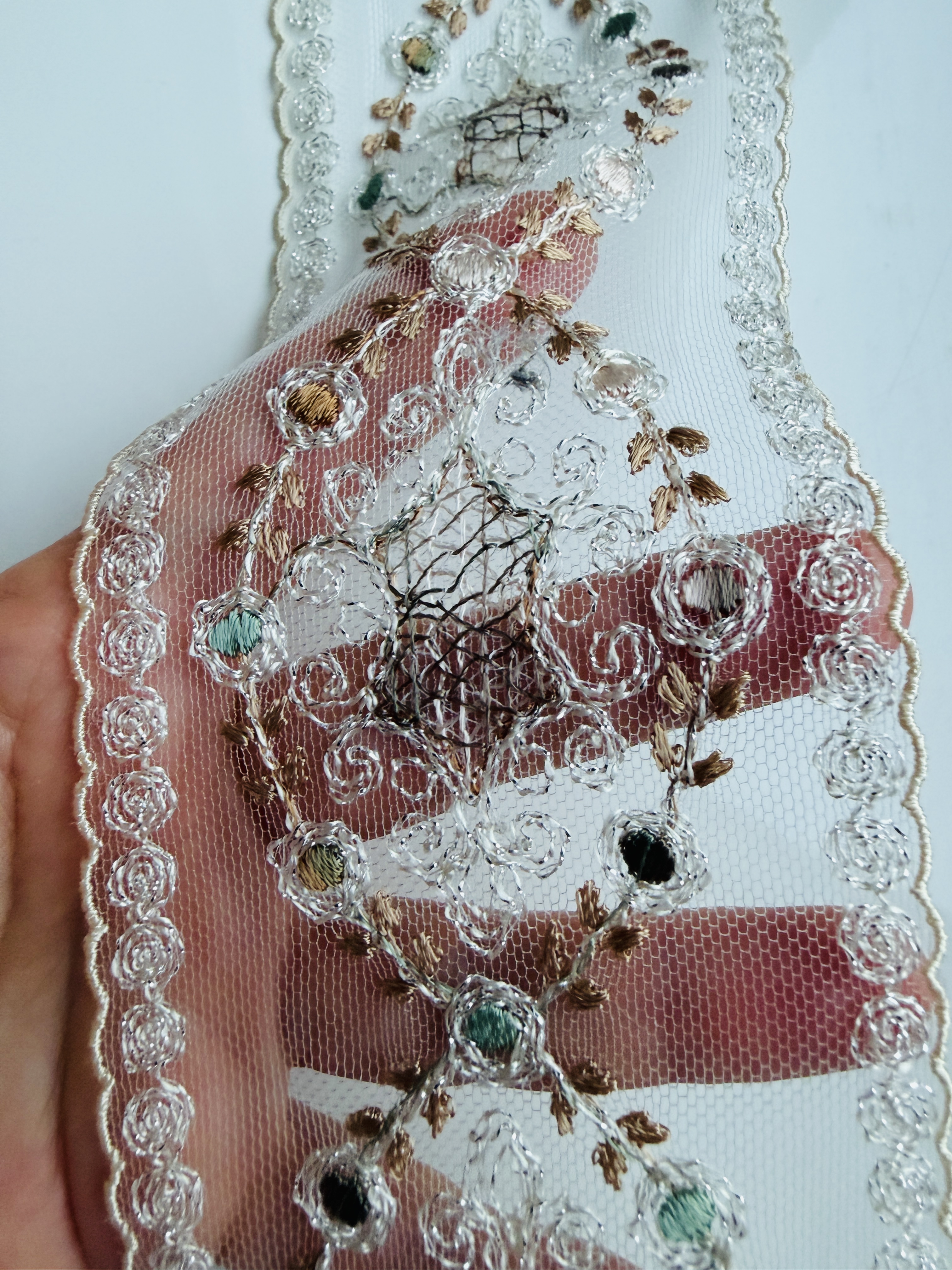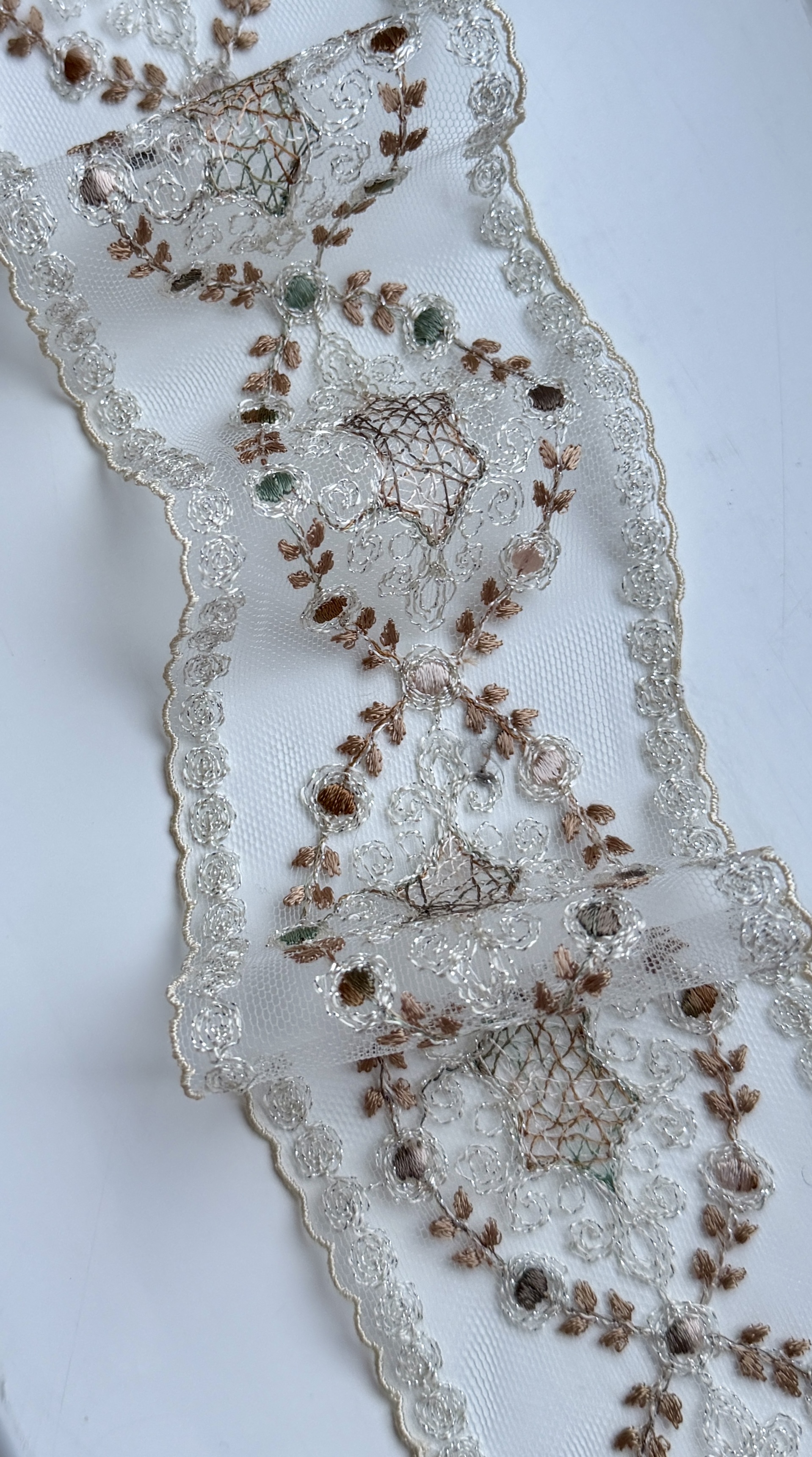Тонкое цветное кружево с изящным деликатным узором в бежево-молочных тонах с деликатным серебристым люрексом .Мелкие пудрово- оливковые шелковые сердцевинки на мелкой мягкой сетке придают перелив и игру оттенков. Кружево лёгкое, полупрозрачное, с чётко прорисованными контурами узоров. Полотно мягкое, хорошо драпируется и аккуратно ложится в изделии. Не колкое! Край естественный фистонный подчёркивает плавность линий и утончённость рисунка.