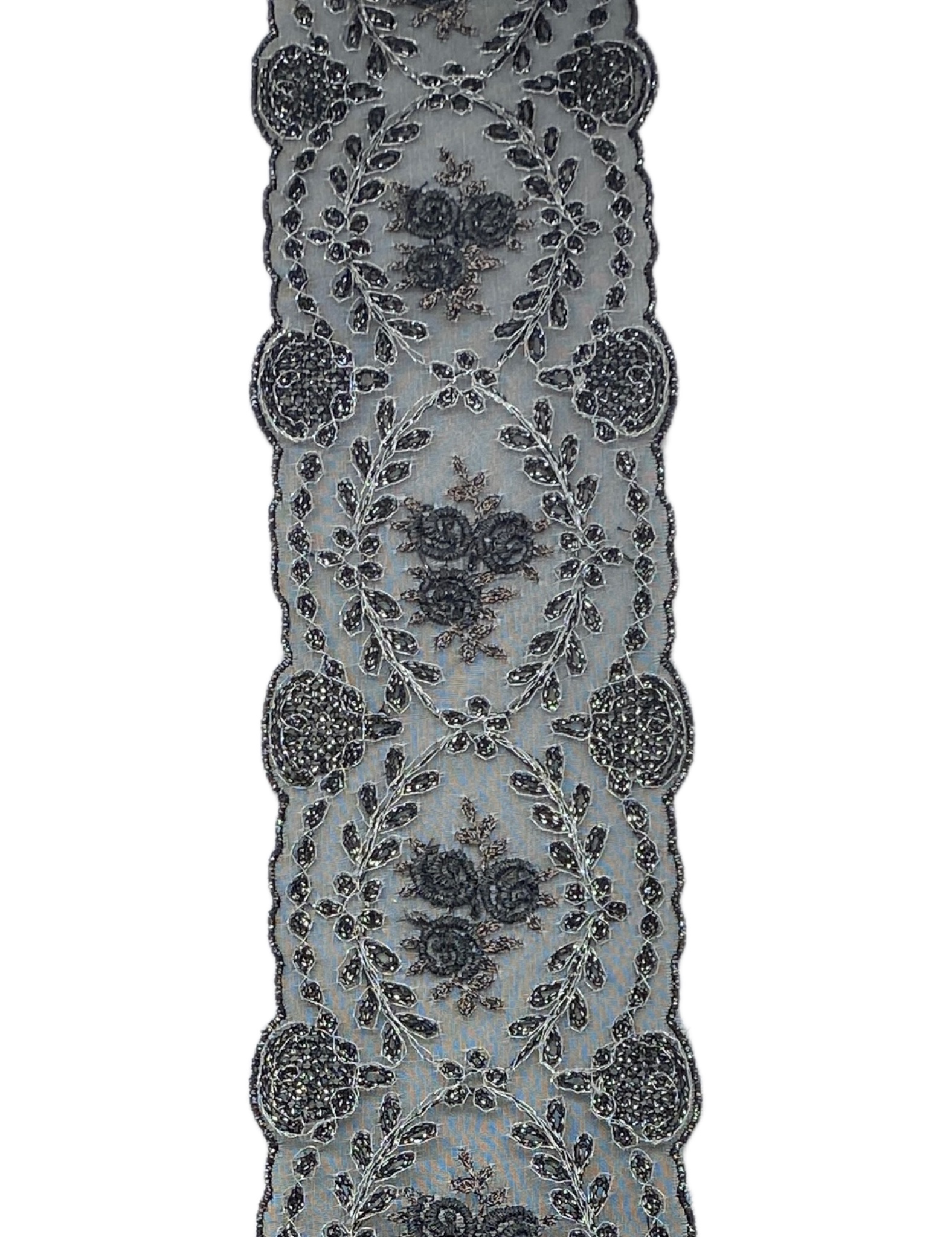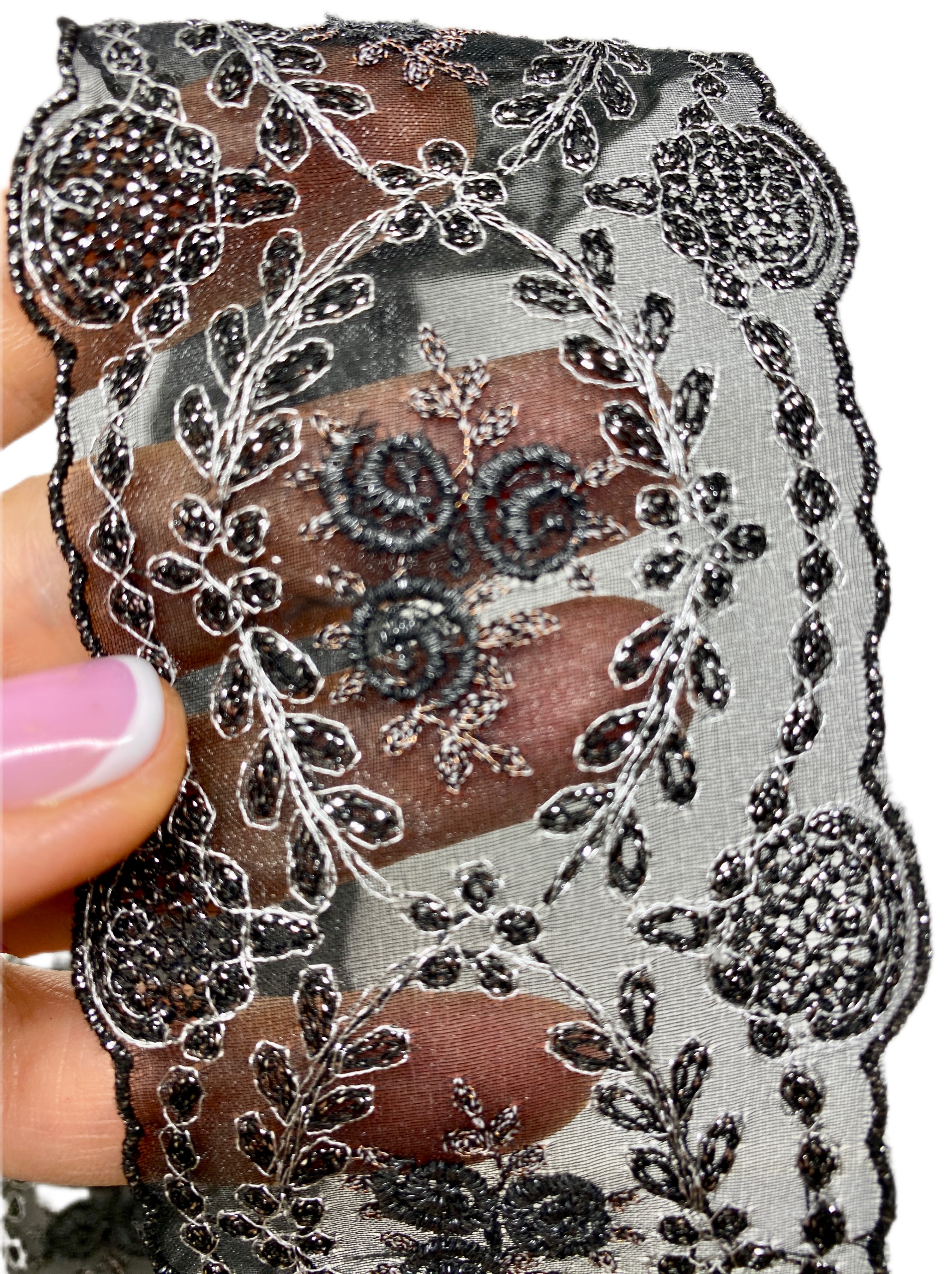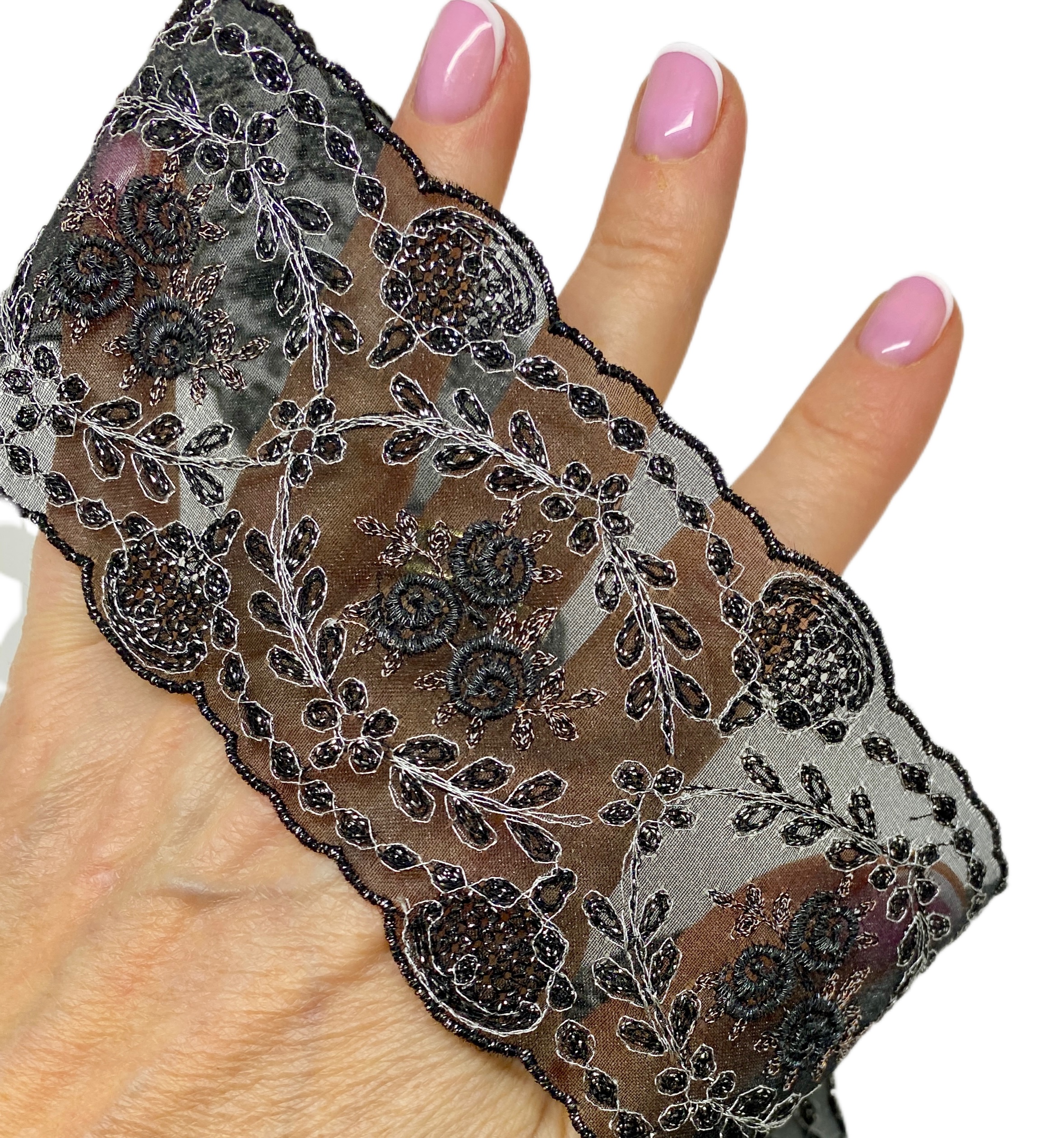 Тонкое цветное кружево с деликатным узором в темных тонах на жесткой органзе! Кружево лёгкое, полупрозрачное, с чётко прорисованными контурами узоров. Полотно неэластичное , жесткое (органза держит форму) и аккуратно ложится в изделии. Край естественный фистонный , что подчёркивает плавность линий и утончённость рисунка.