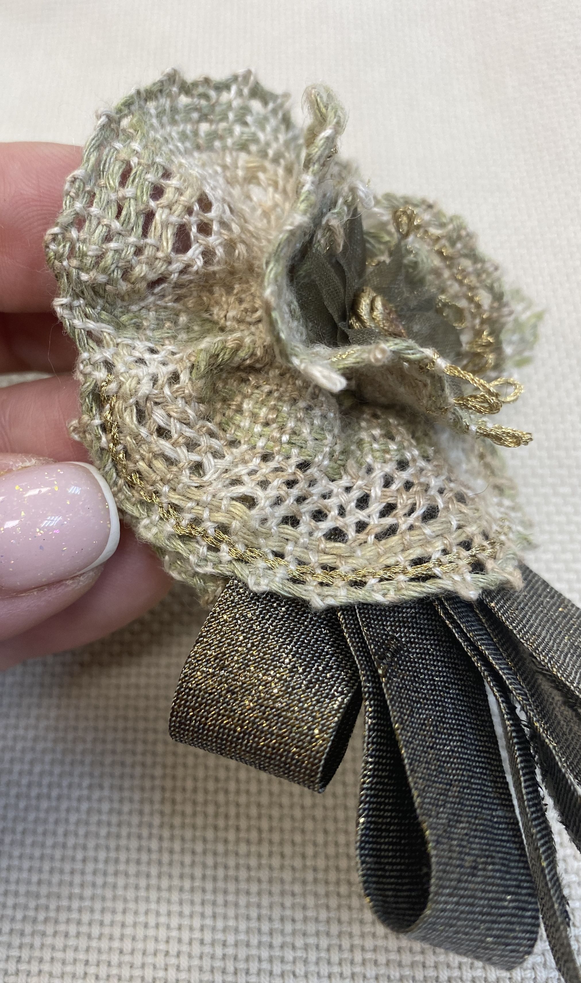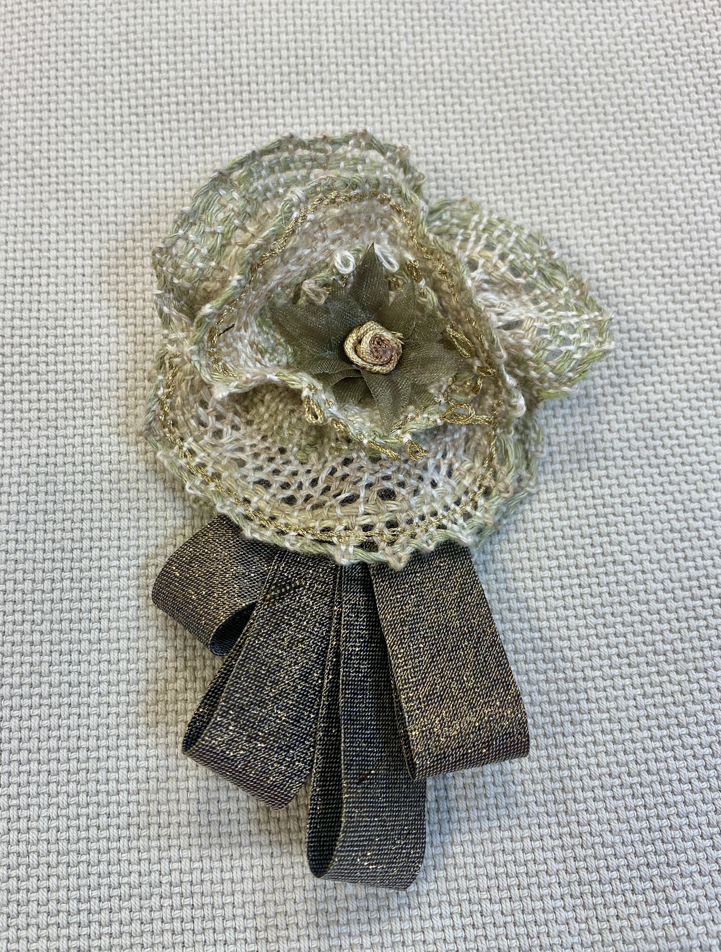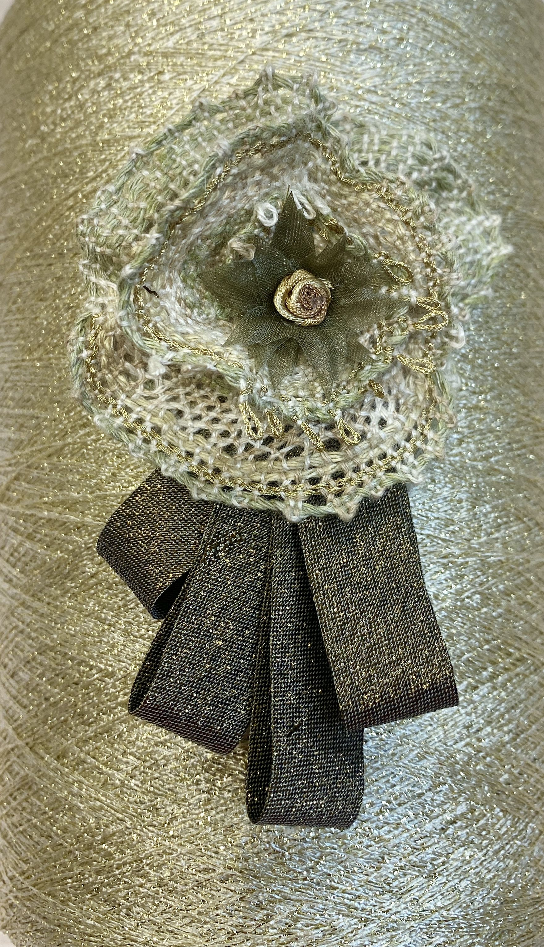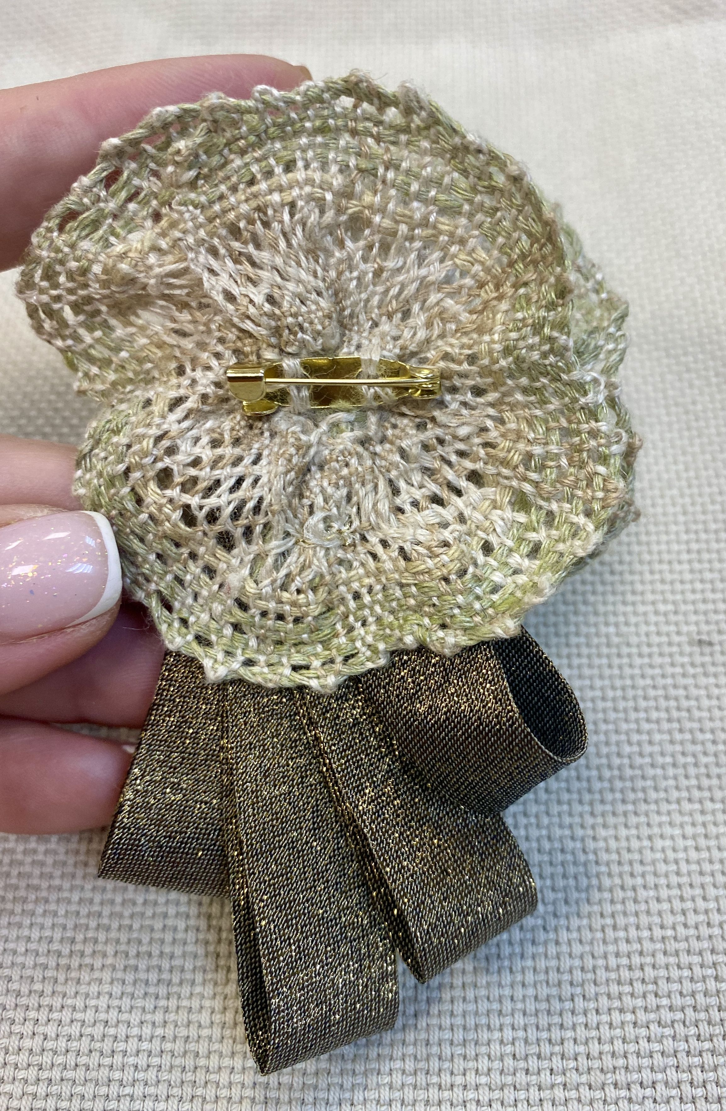Брошь выполнена в технике непрерывного плетения на коклюшках