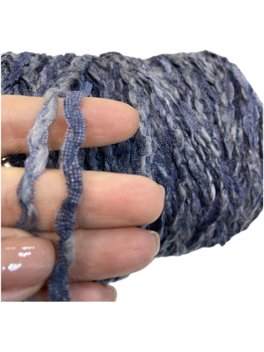 Пряжа имеет завораживающий меланжевый цвет в джинсовых тонах, ленточную фактуру и готова помочь придать по истине особенный вид любому проекту!