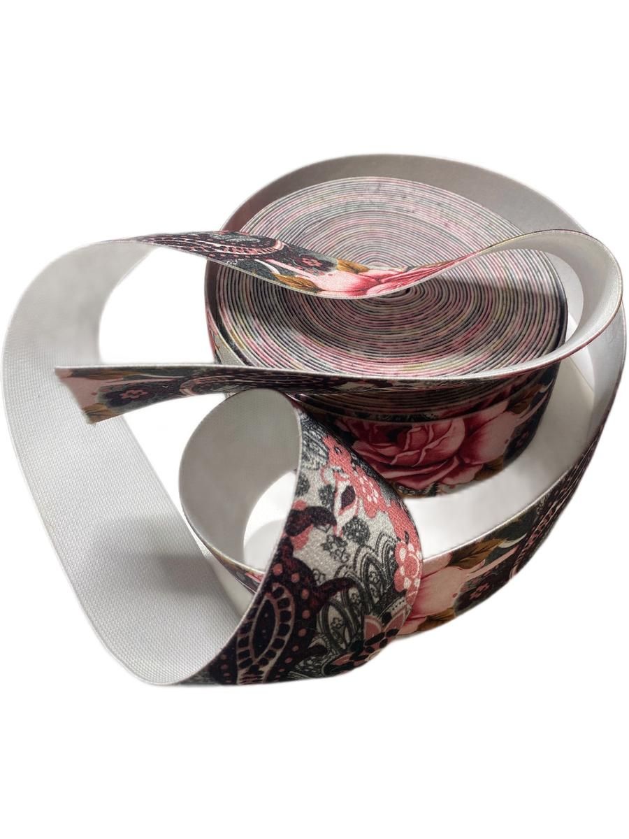 - Широкая цветная резинка с цветочным узором — универсальный аксессуар для шитья и рукоделия.