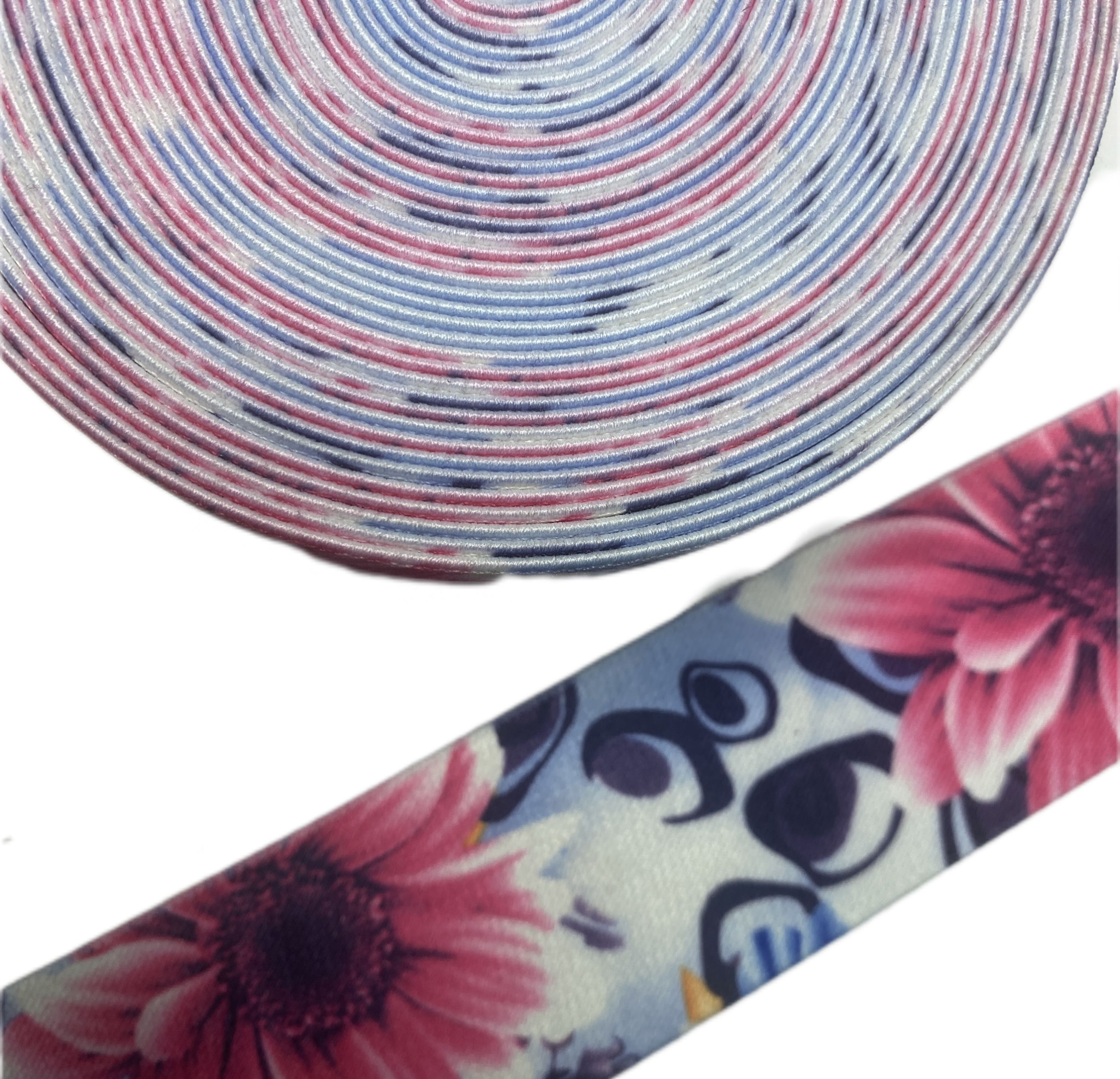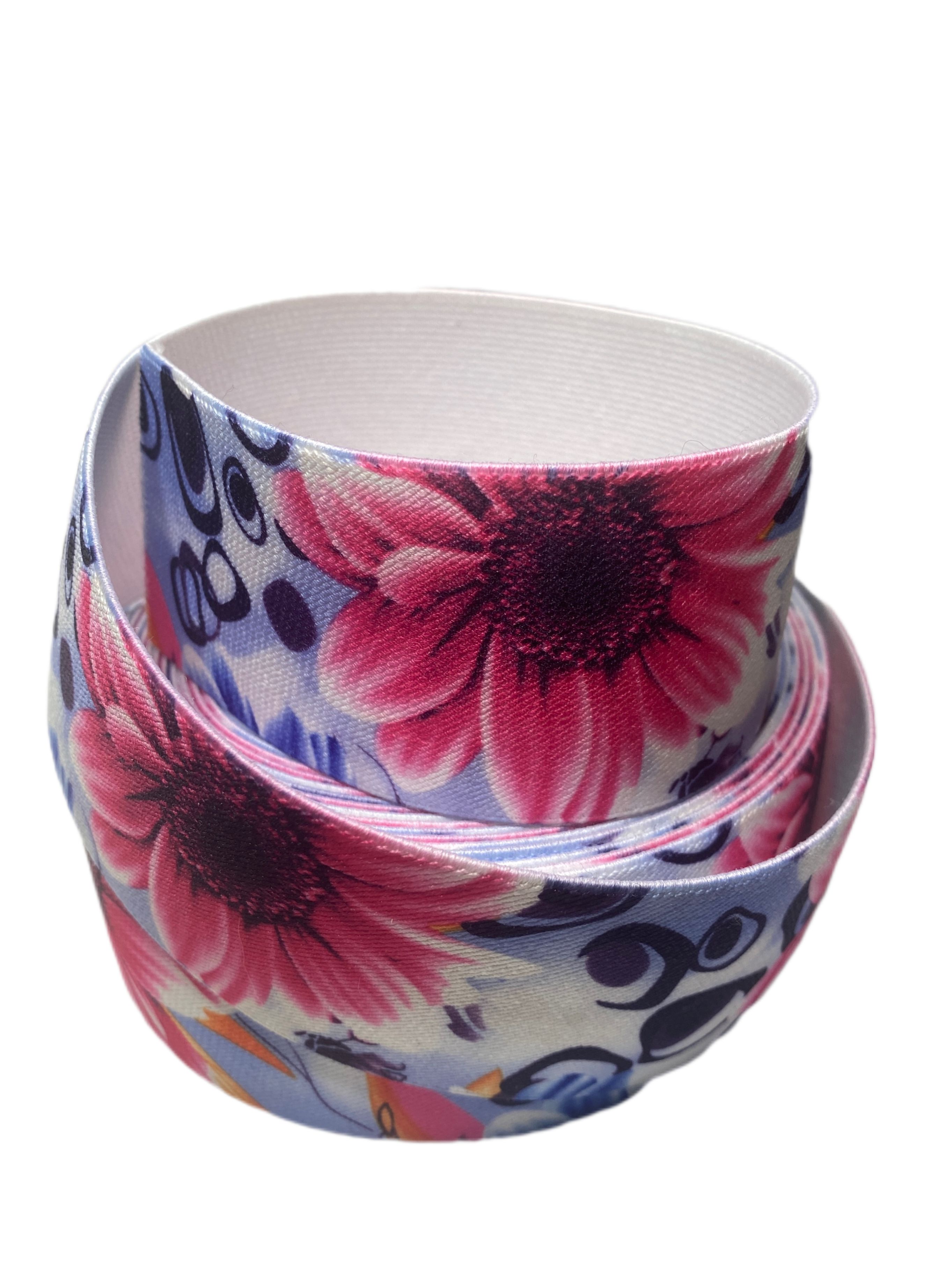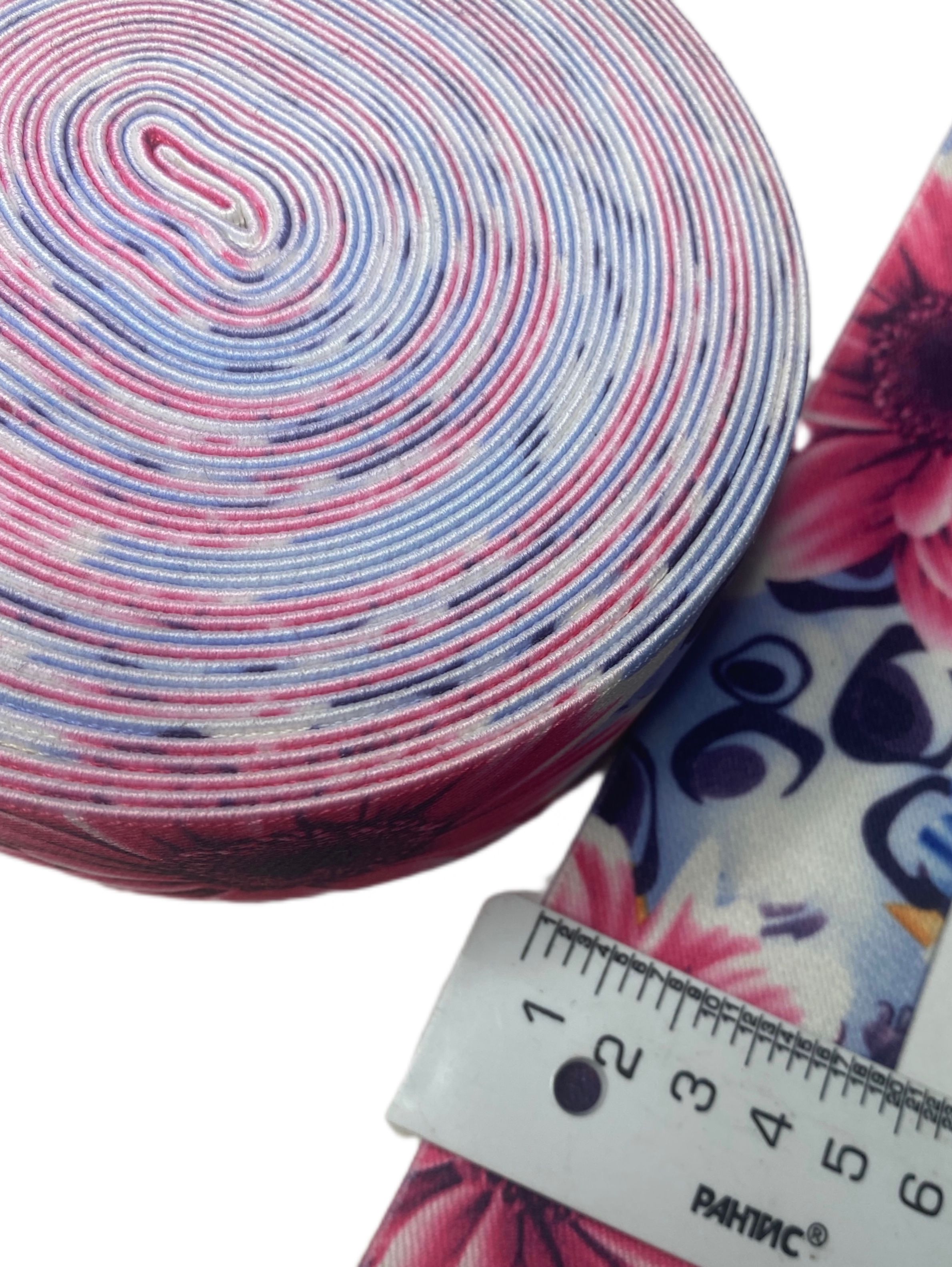 - Широкая цветная резинка с цветочным узором — универсальный аксессуар для шитья и рукоделия.