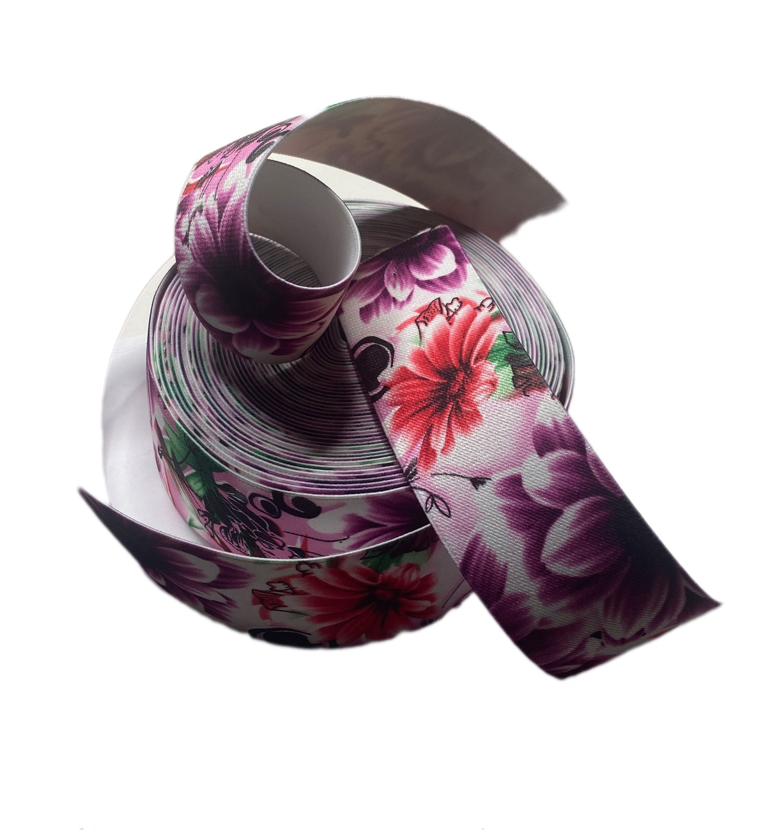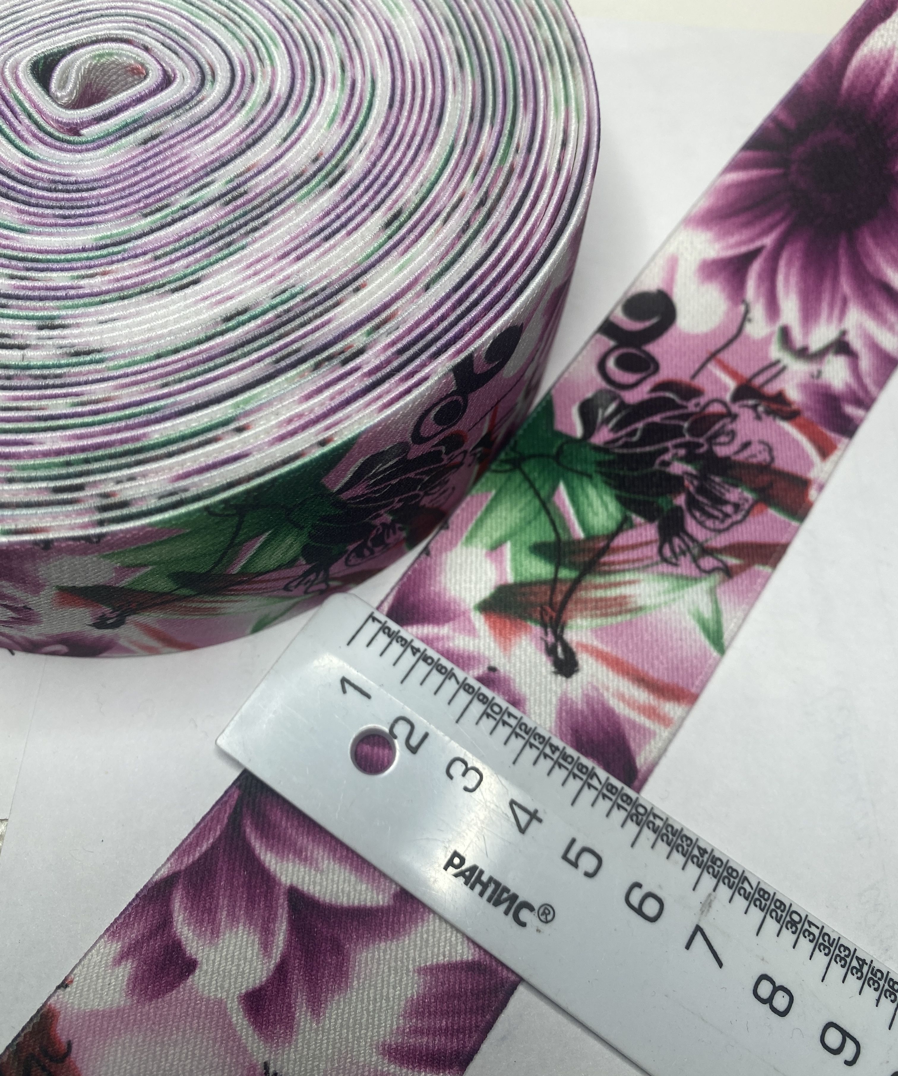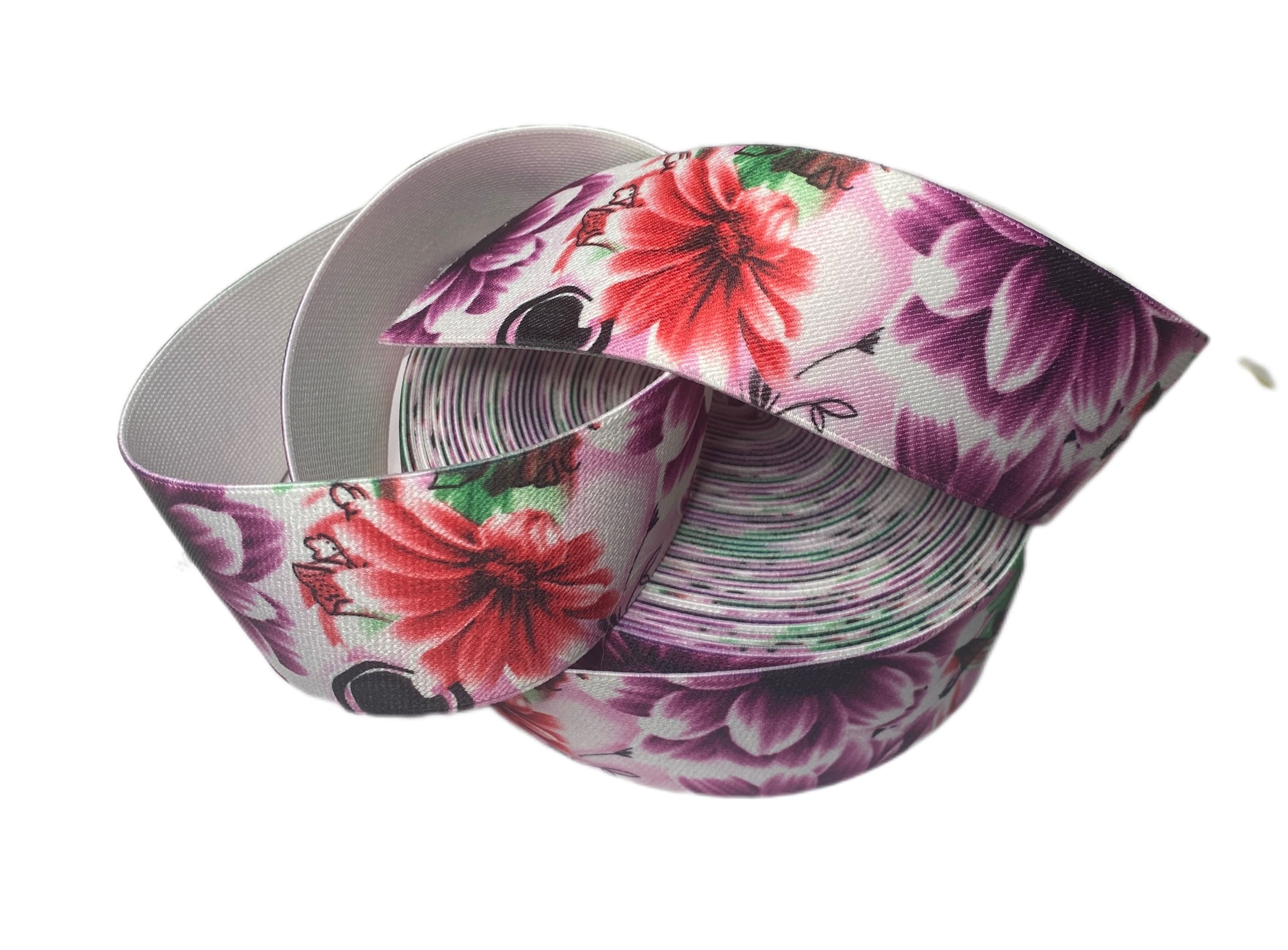 - Широкая цветная резинка с цветочным узором — универсальный аксессуар для шитья и рукоделия.