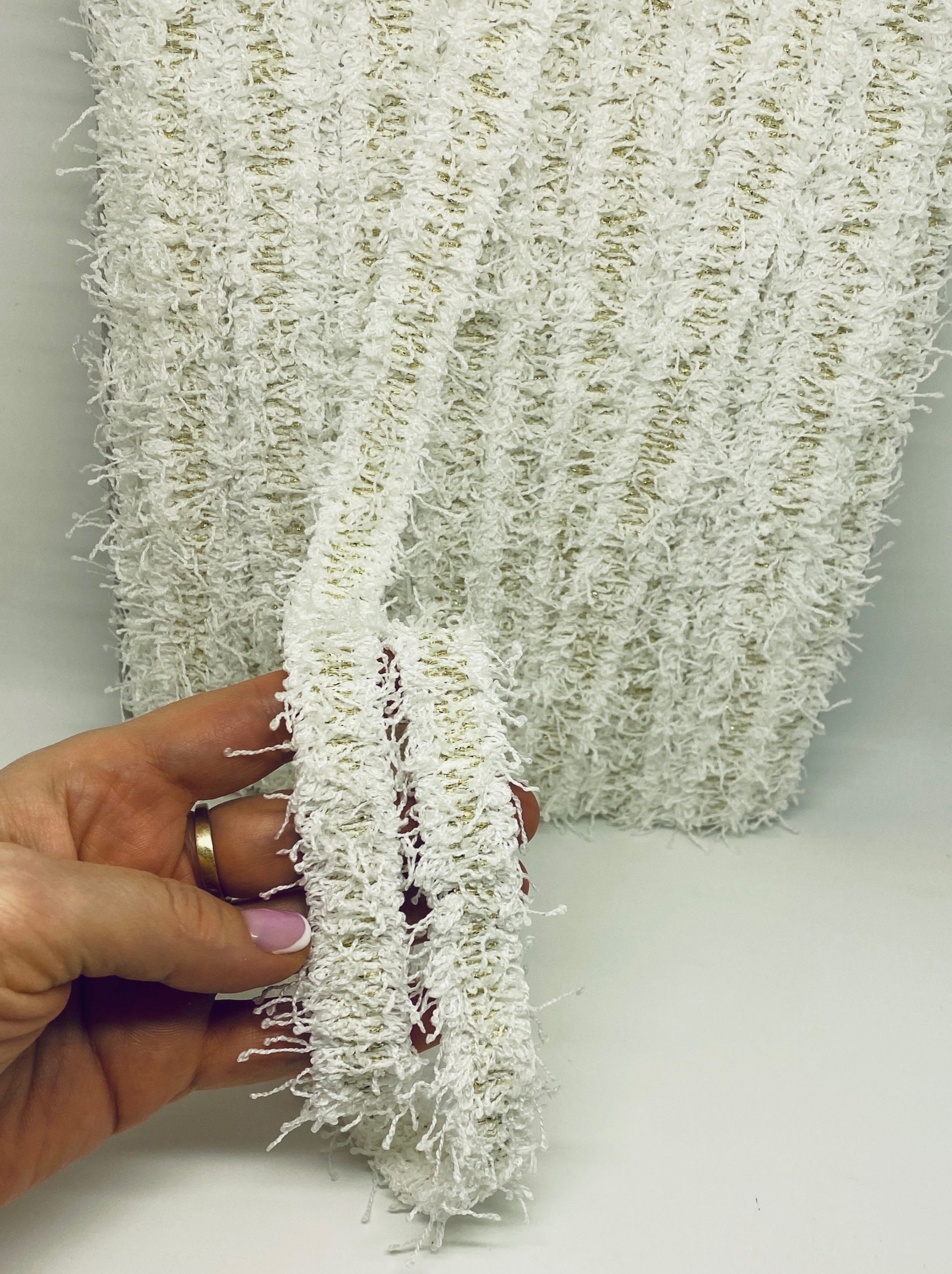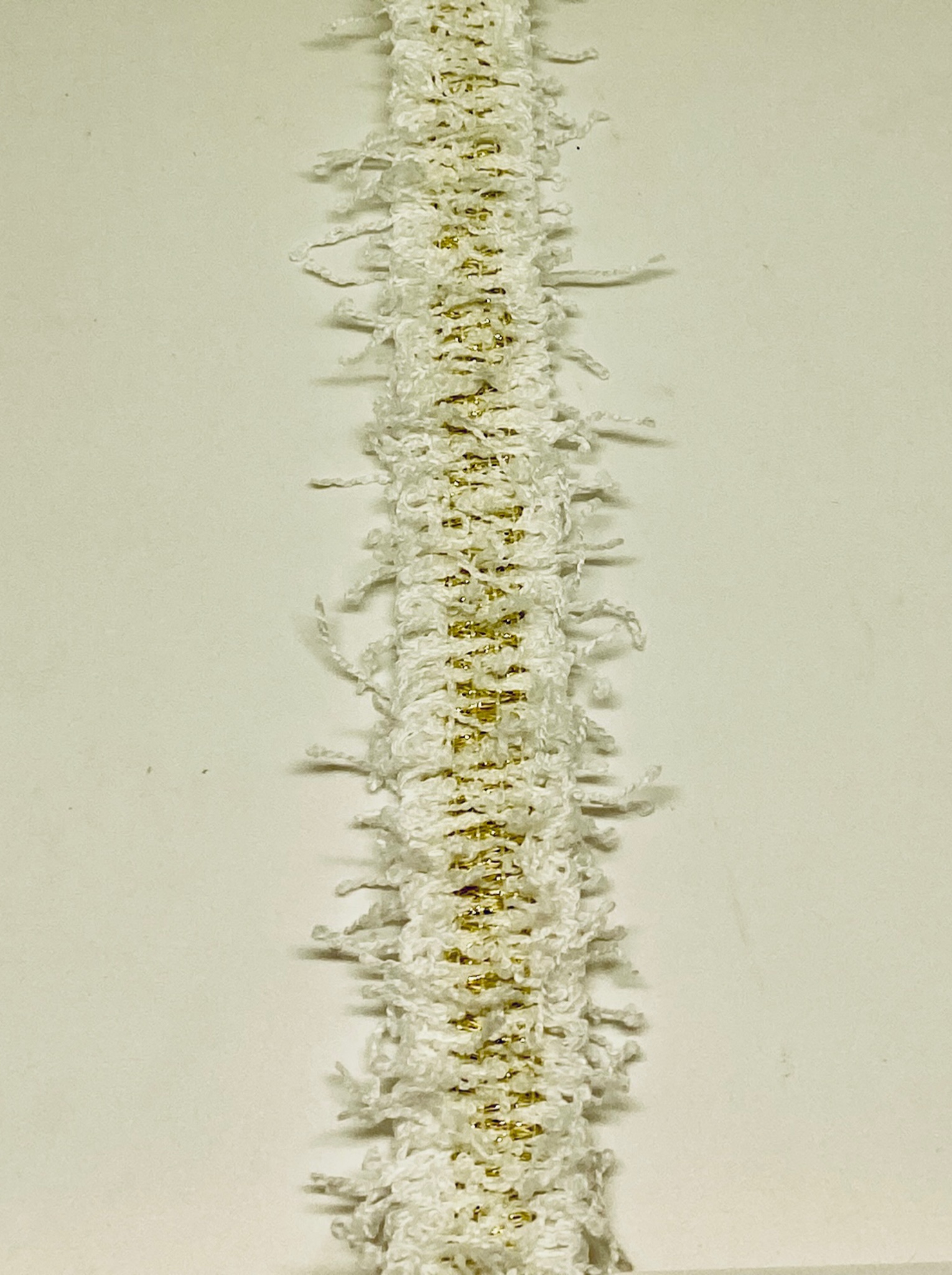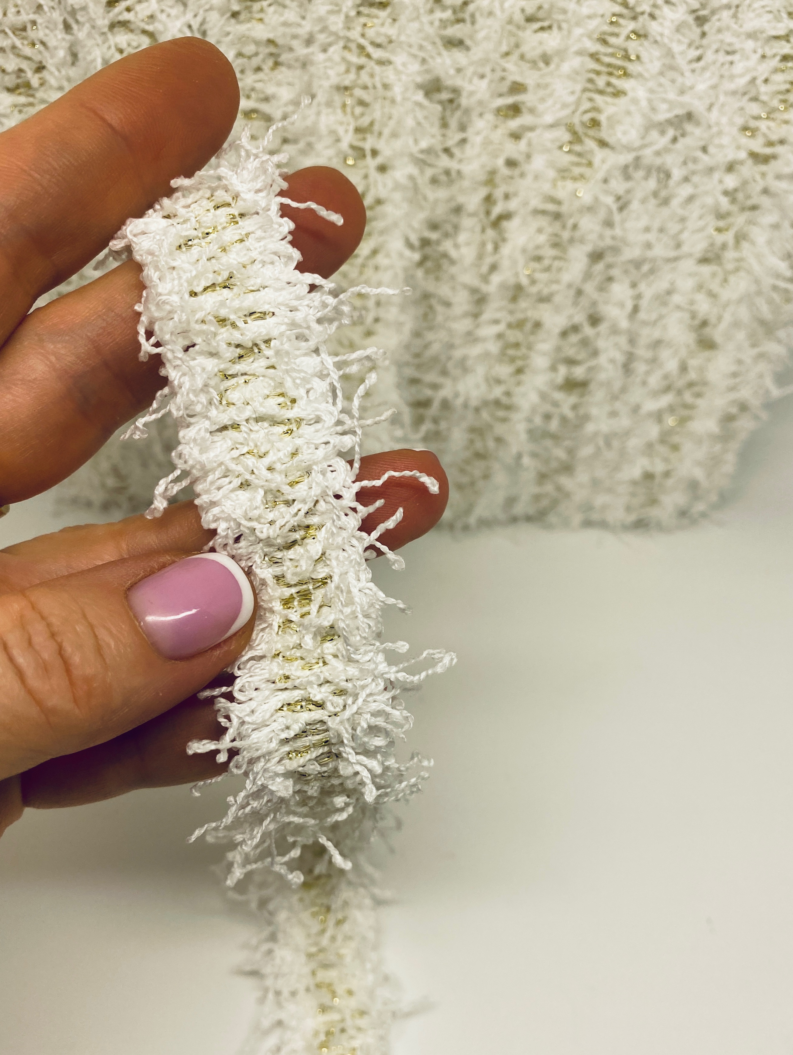 Мягкая декоративная тесьма травка из текстиля с прошитолй твидовой золотистой нитью — идеальный вариант для оформления одежды, аксессуаров и интерьерных проектов.