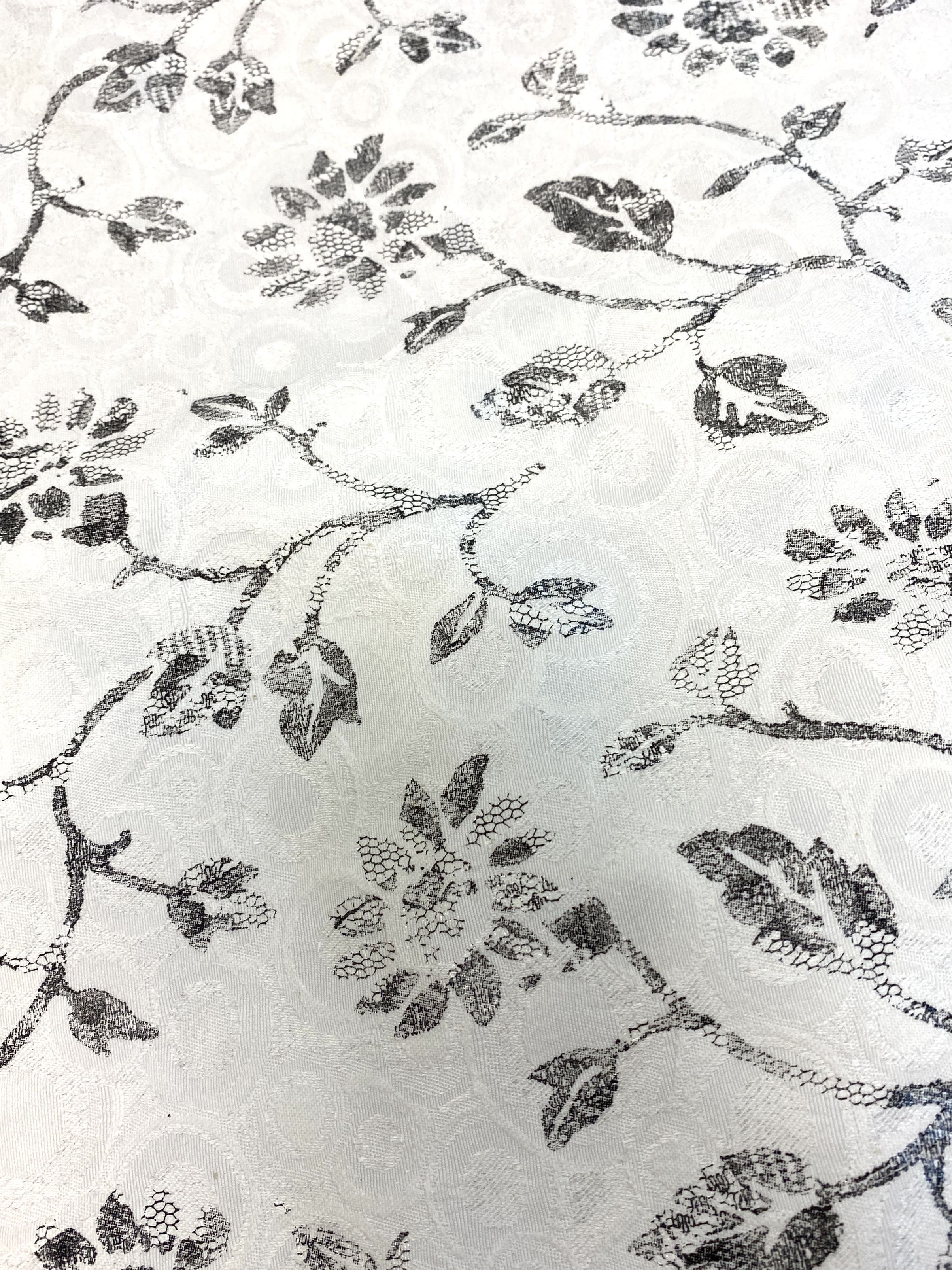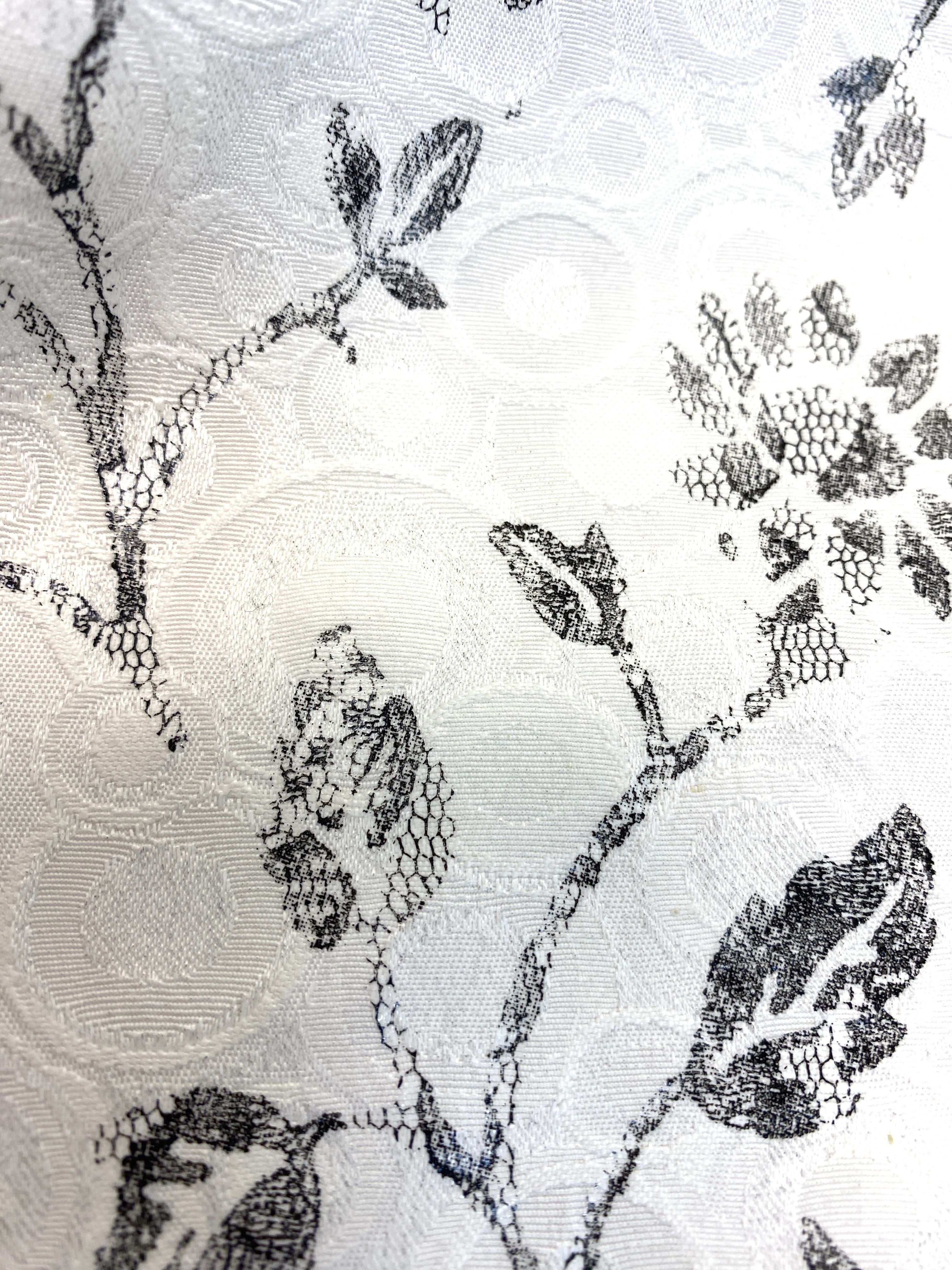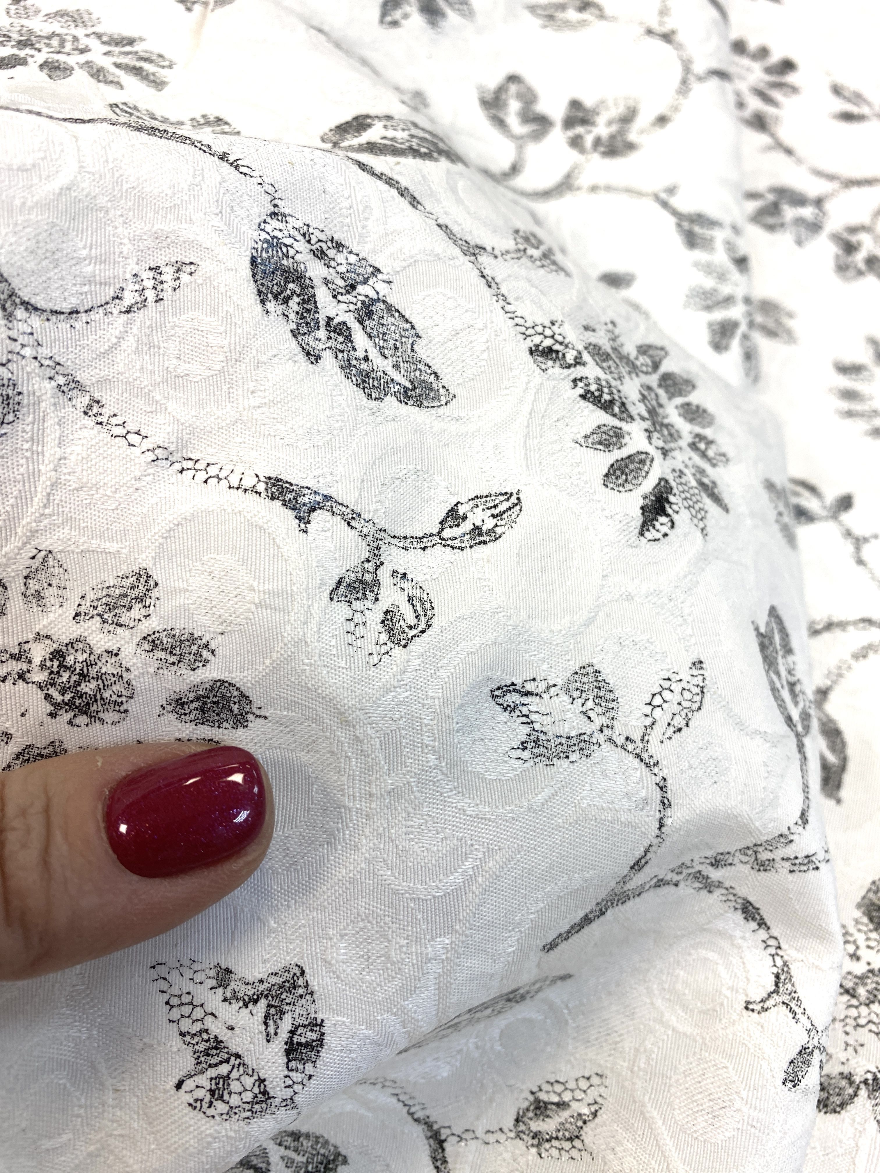 Рисунок на данной ткани представлен цветами, темно серого цвета (печать) на жаккардовом однотонном белом фоне -выглядит очень эстетично