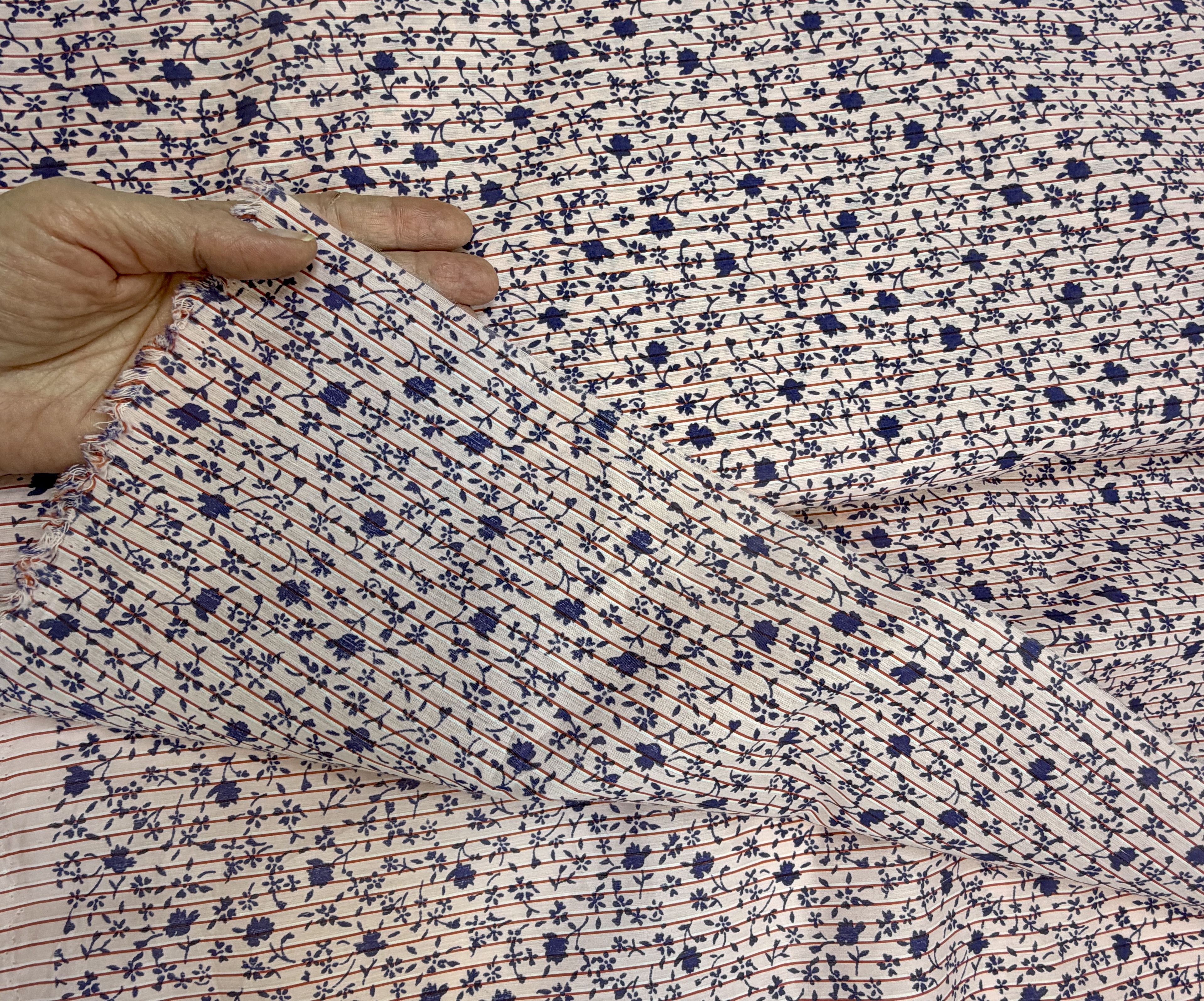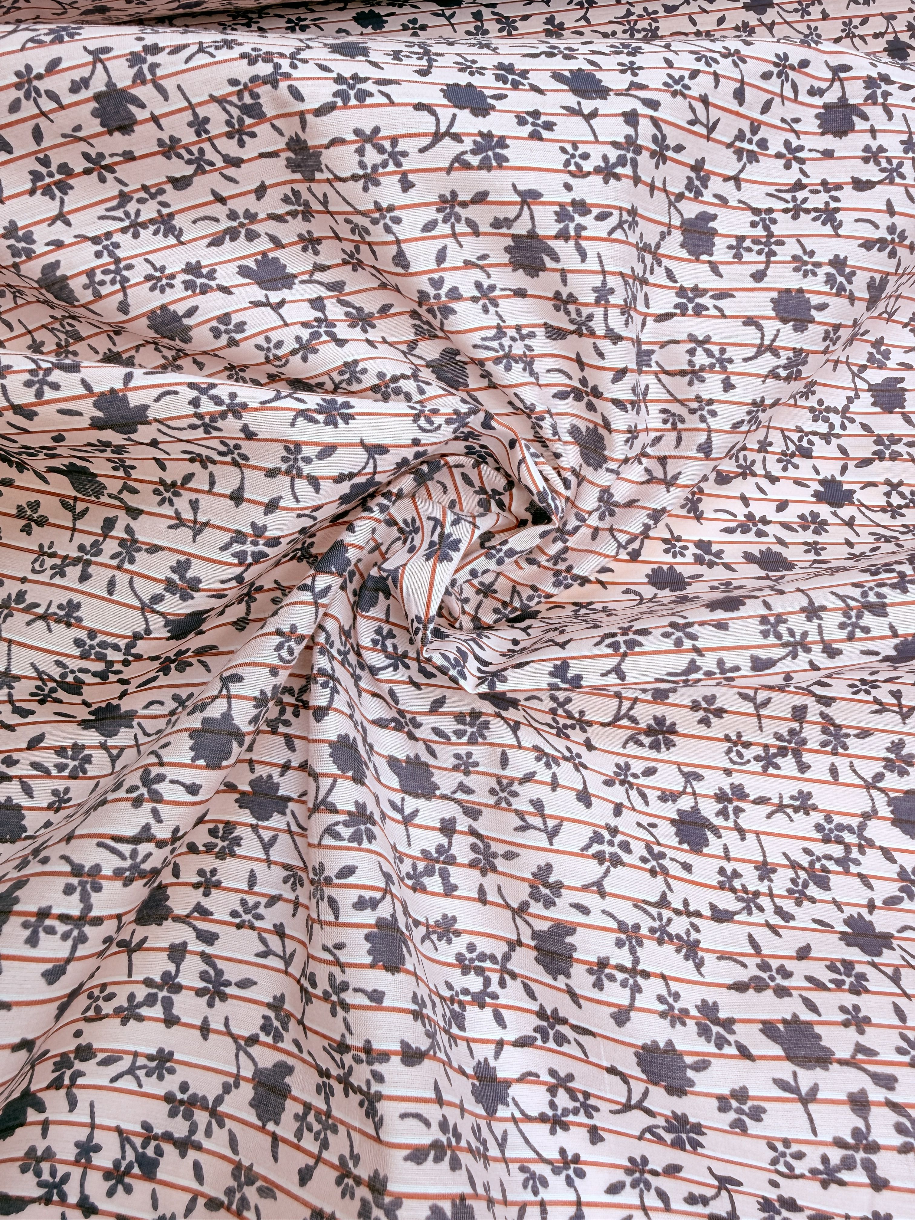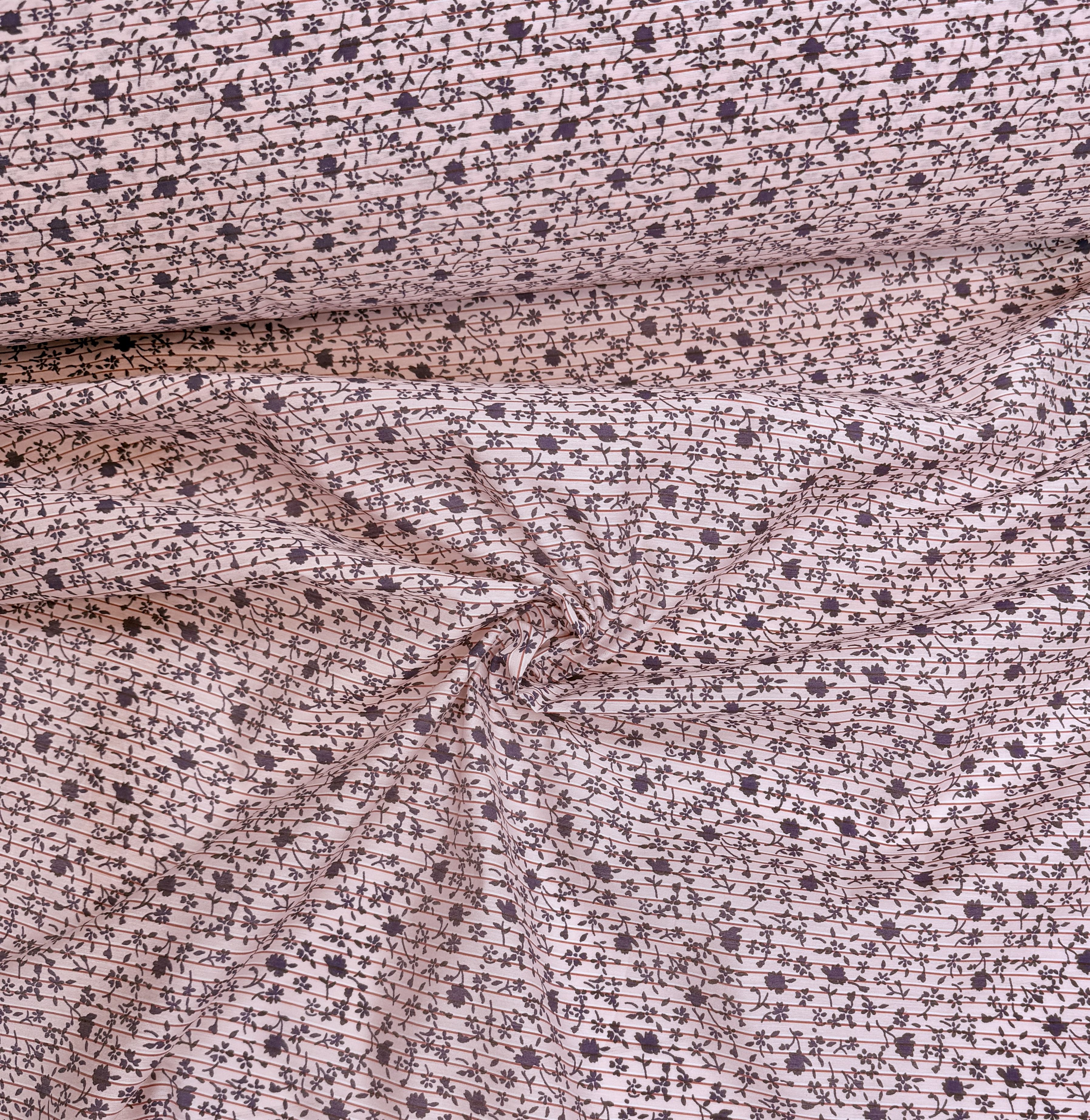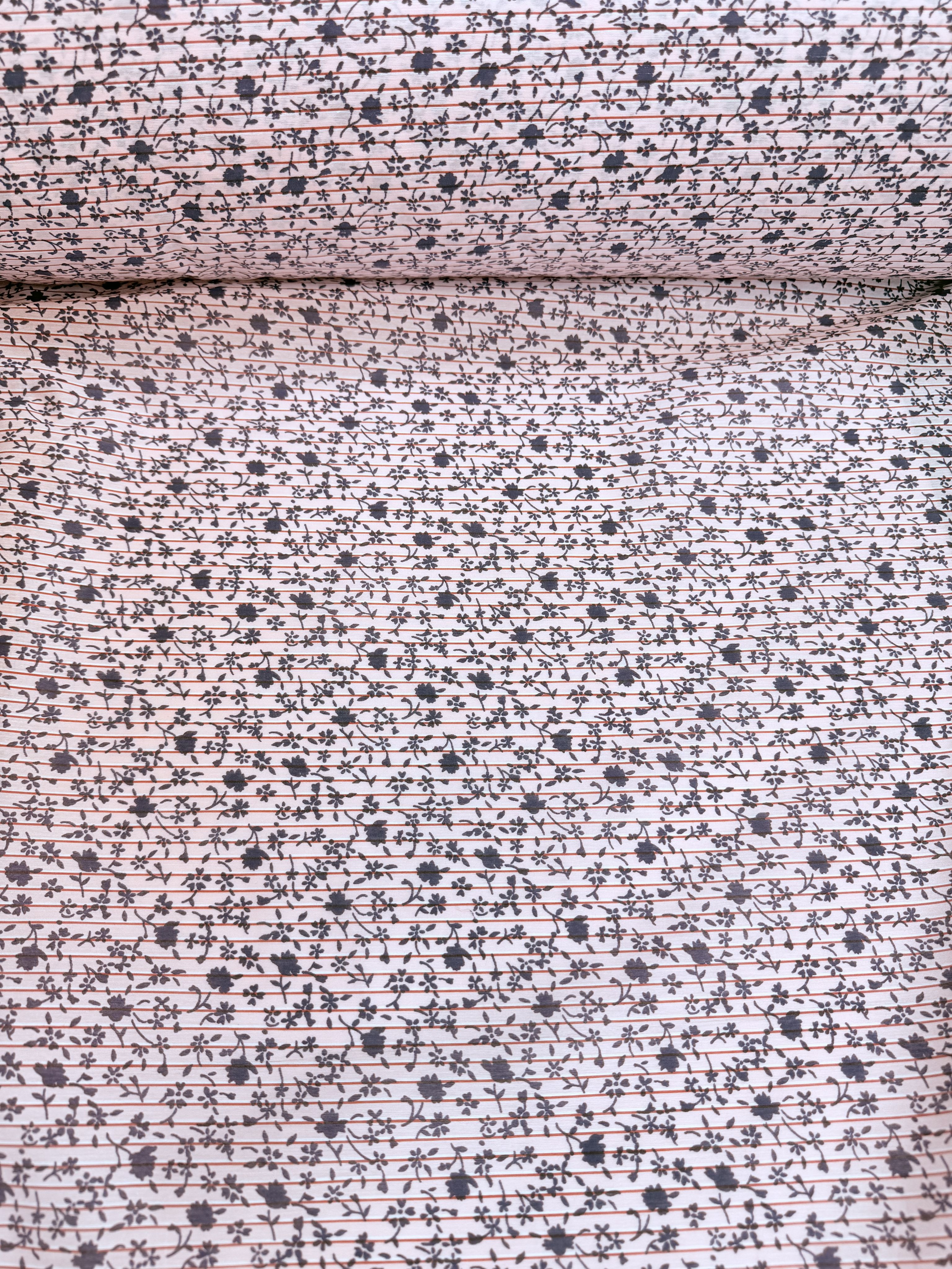 Принт на данной ткани представлен мелкими цветами на розовом фоне с горизонтальной полоской (не сильно заметной) Такое сочетание геометрии и цветочного принта раскрывает возможности ткани
