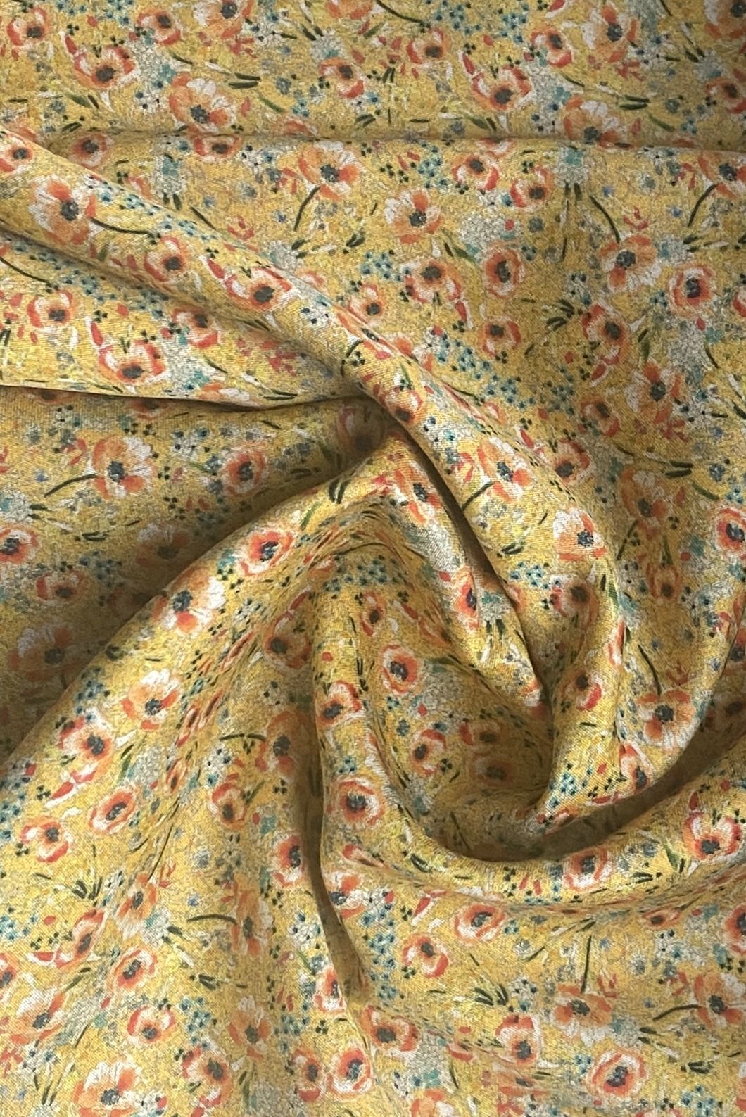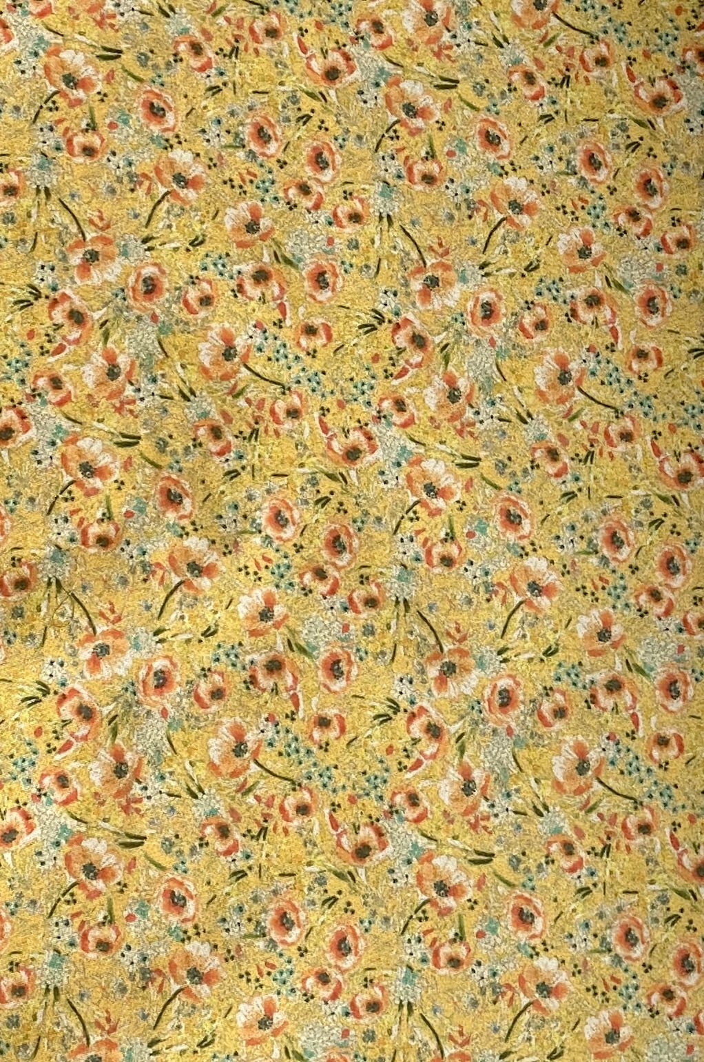 на желтом фоне мелкие цветы в оранжево-изумрудной гамме