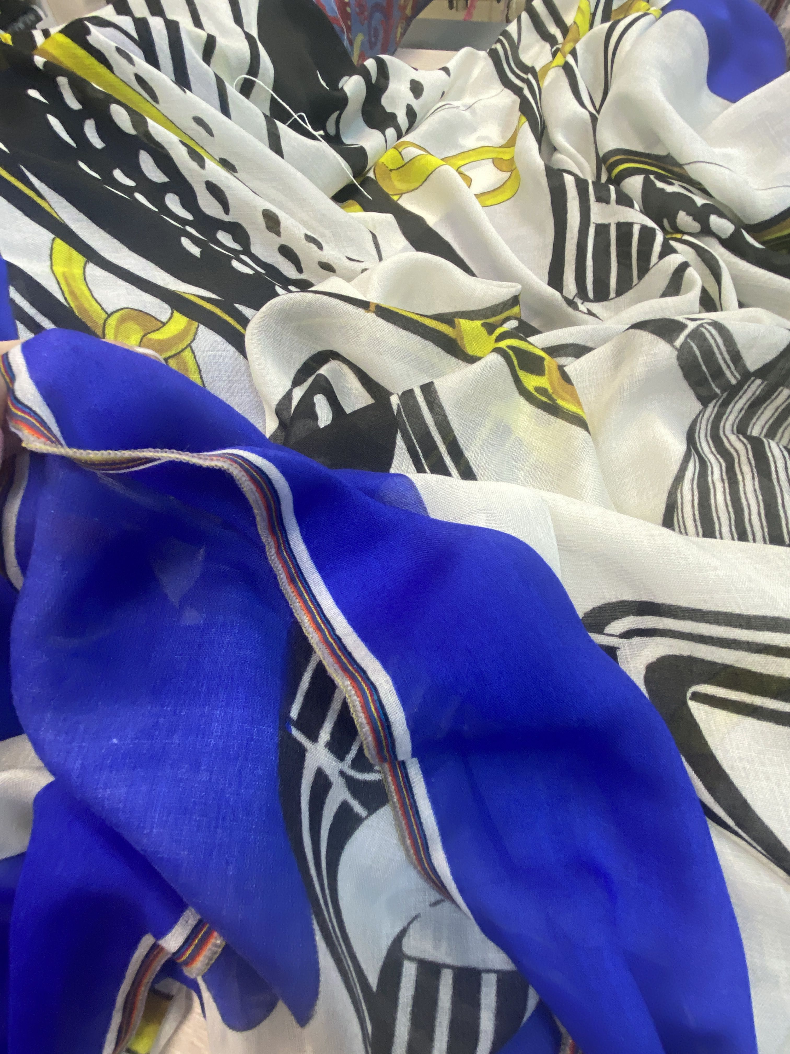 цвет - васильковая кайма, центр платка заполнен белым, желтым и черным цветом