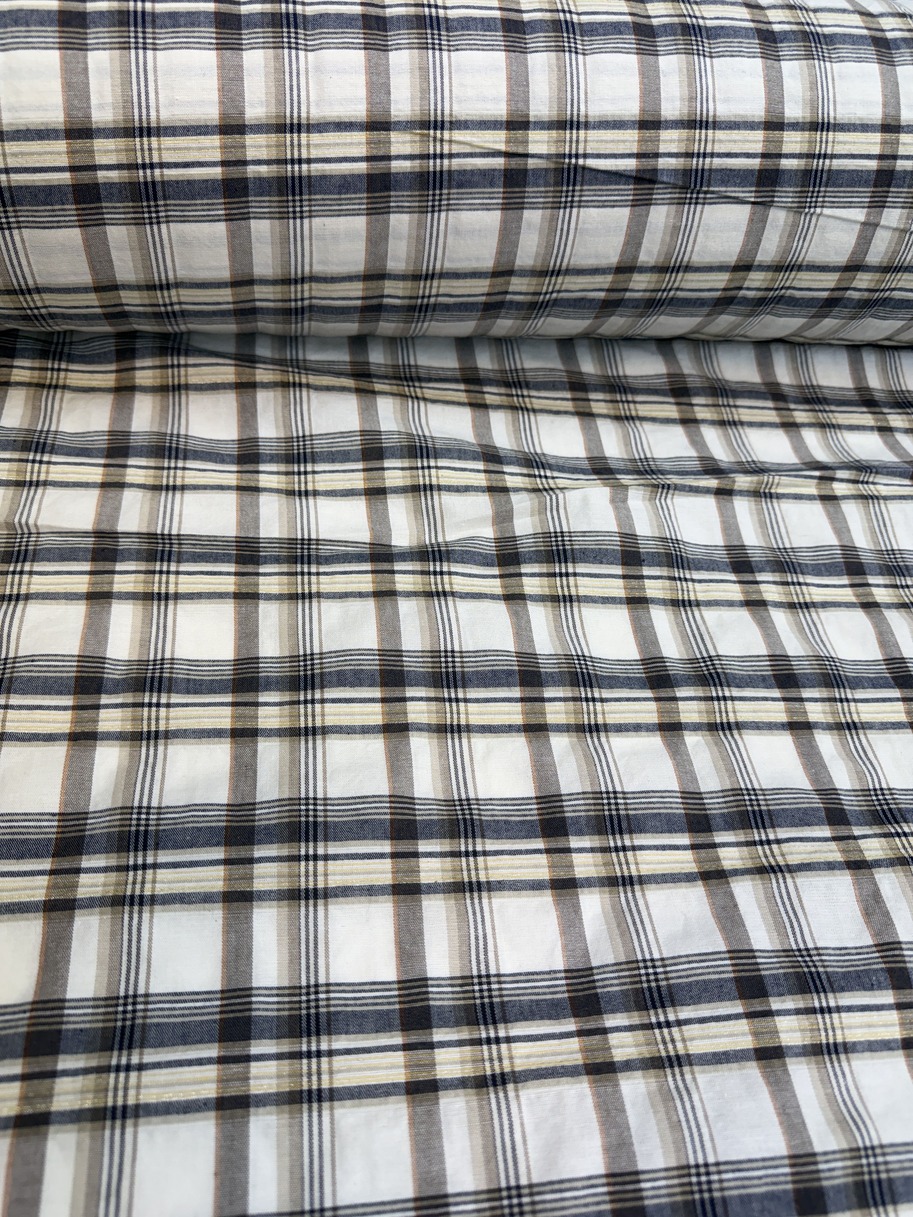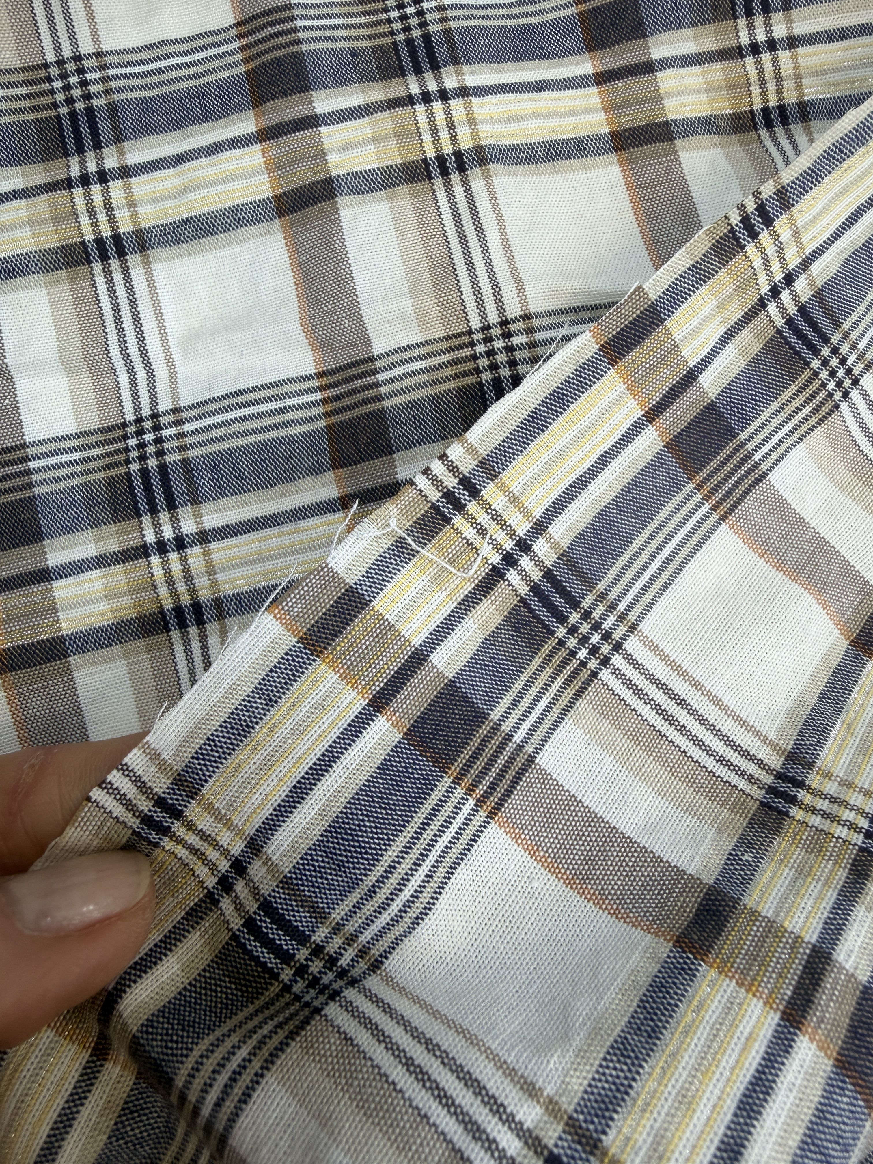 Представляем ткань из чистого льна с выразительным дизайном: крупная клетка в благородной гамме синего, белого и бежевого, дополненная тонкой ниткой люрекса.