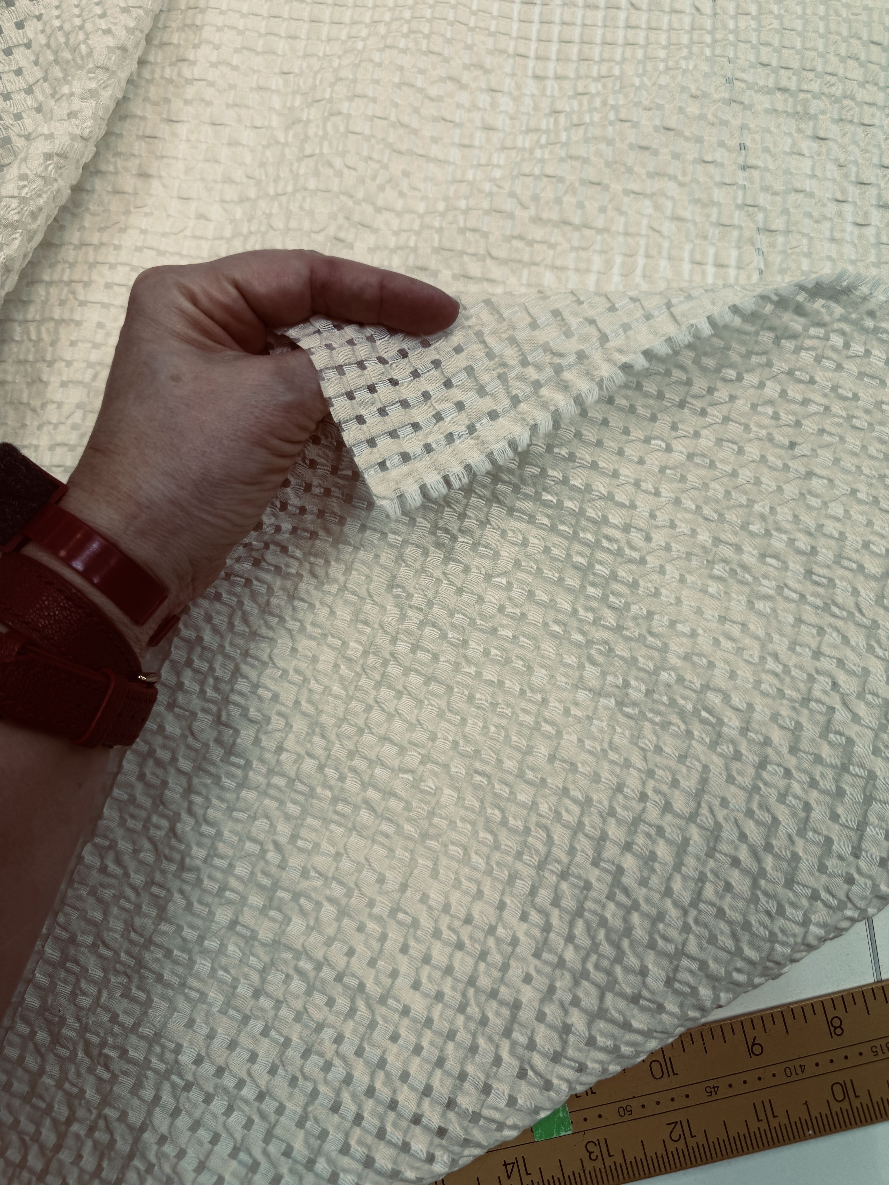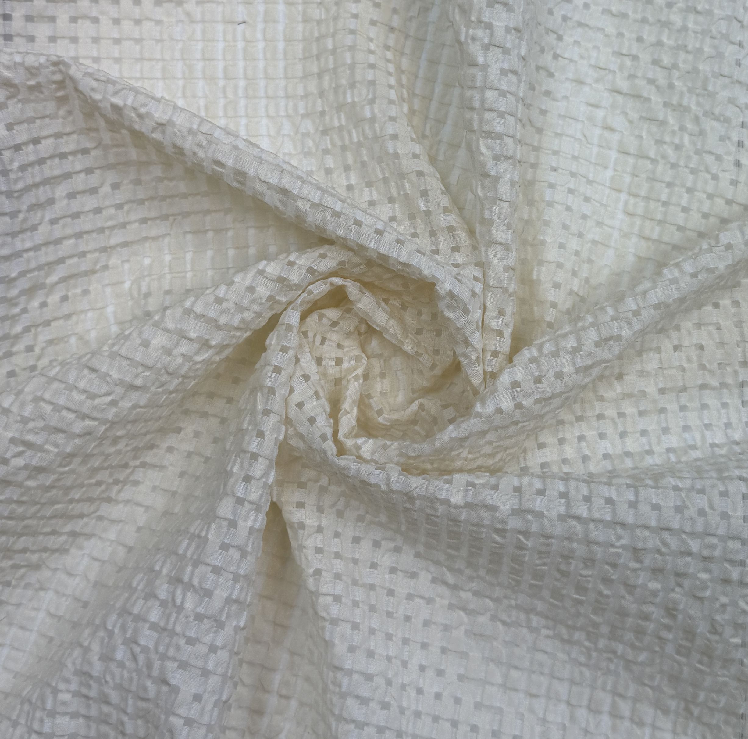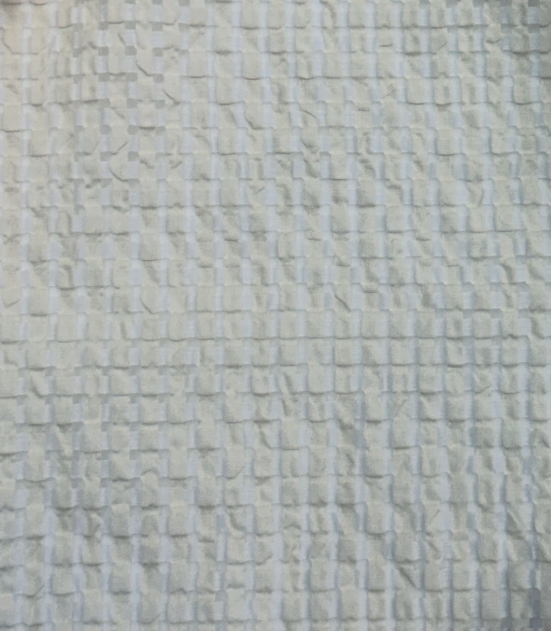 Данный вариант ткани имеет рельефную структуру, напоминающую плетеную сетку (вафельный узор), которая создает игру света и тени; будто игра оттенков! Поверхность не гладкая, идет чередование углубленных и выпуклых участков! При этом ткань не создает лишний объем !