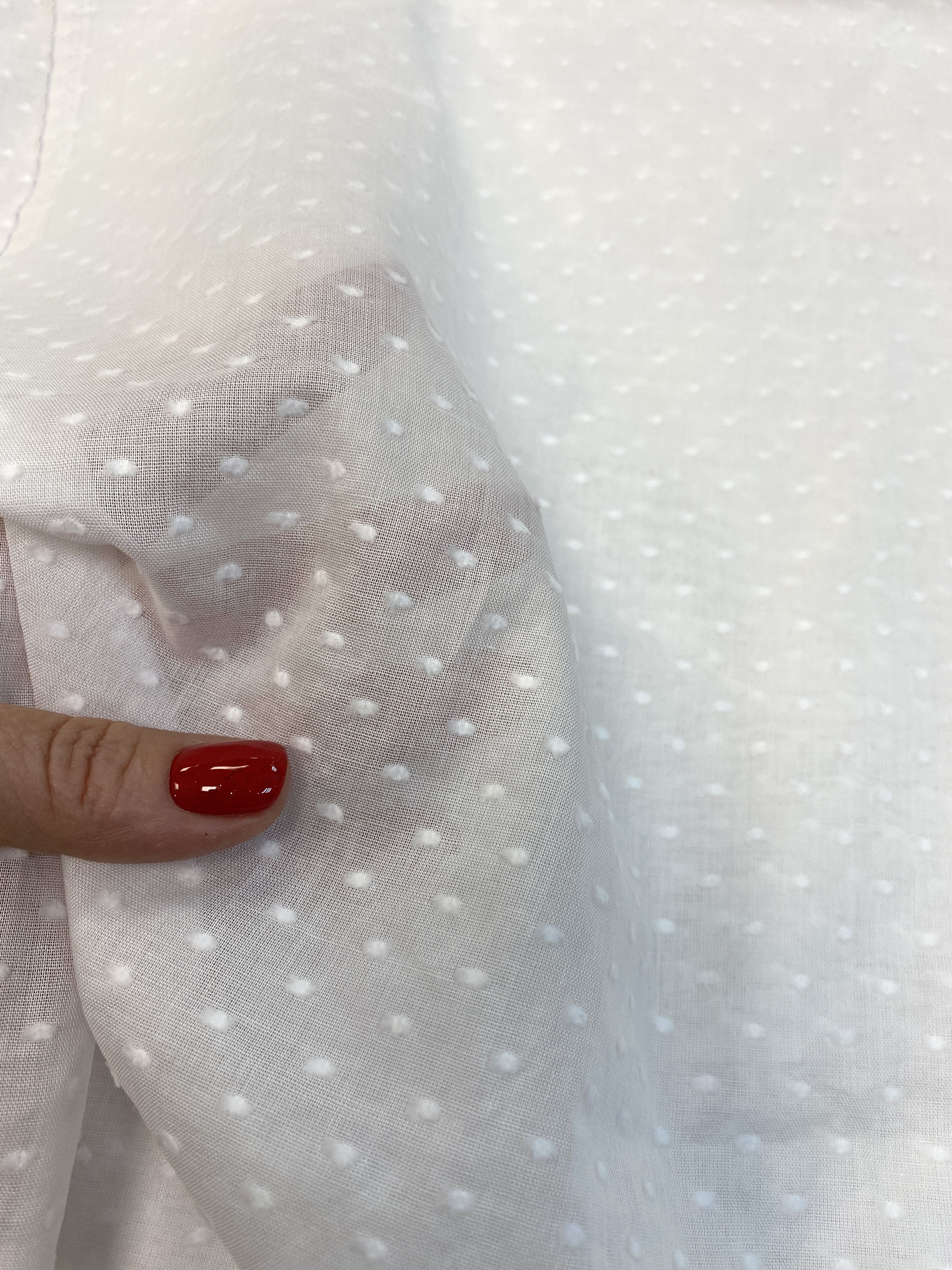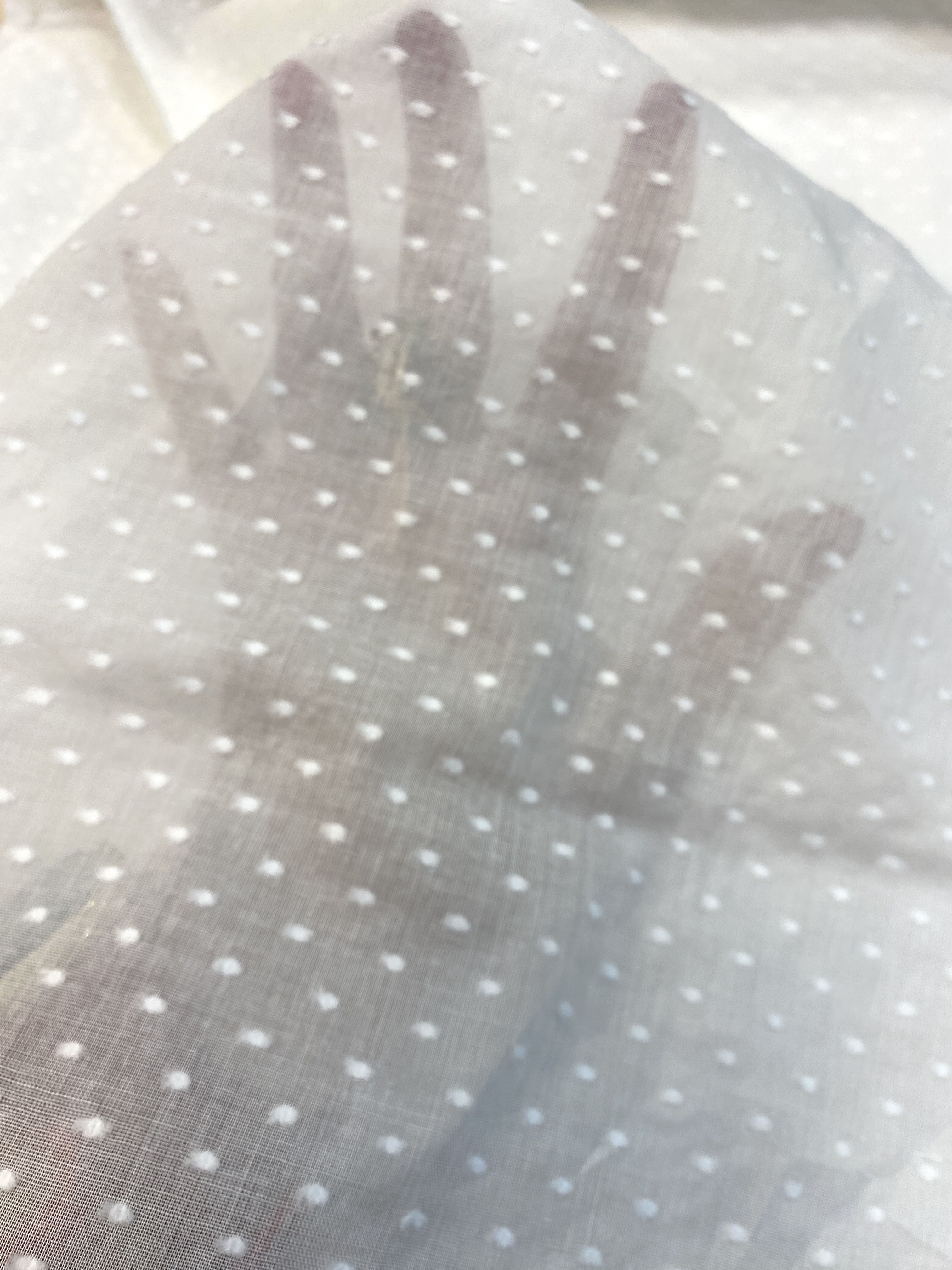 Данный вариант ткани - тонкая полупрозрачная ткань, практически невесомая и пластичная, одна из самых деликатных, с вышивкой в виде мелких белых точек.
