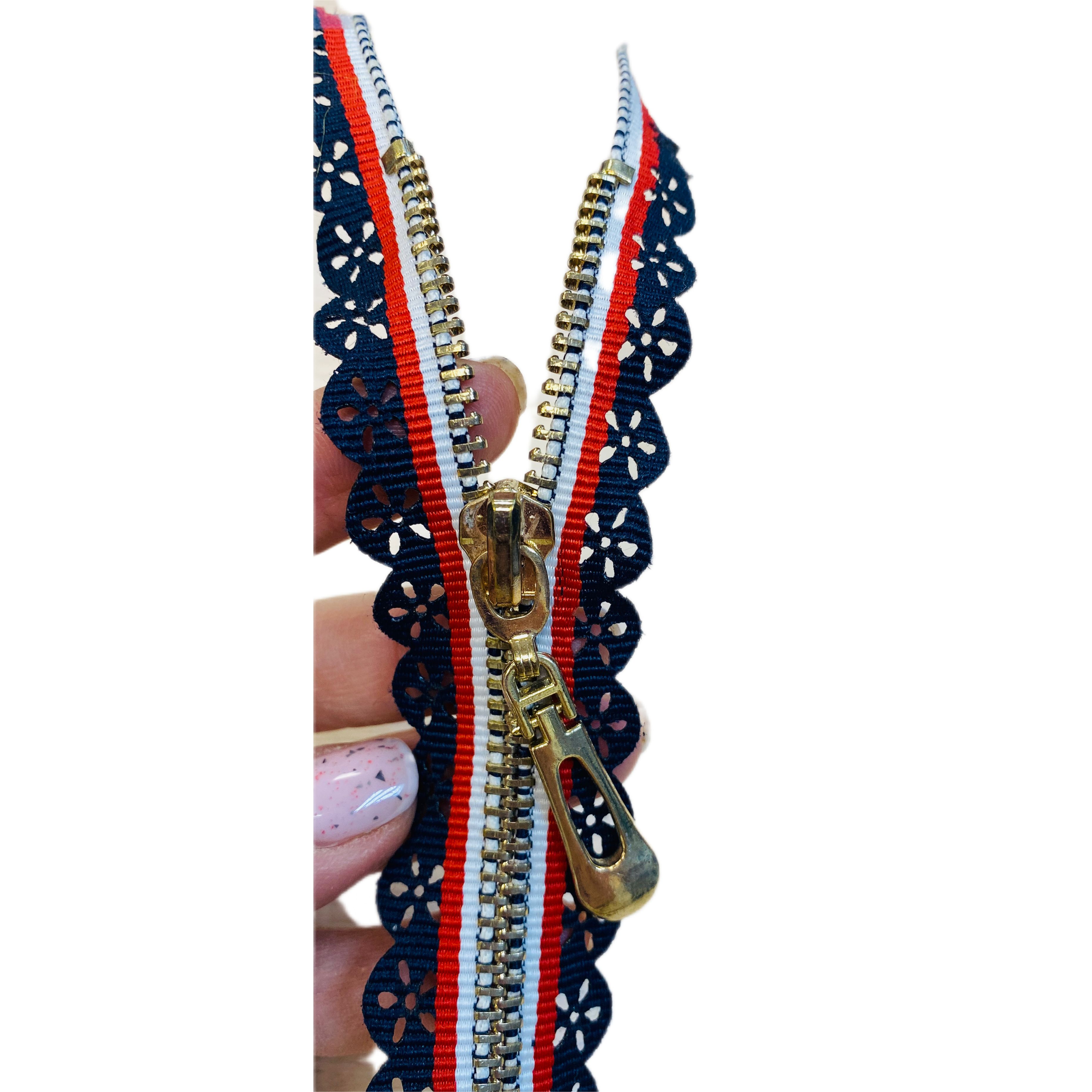 на перфорированной тесьме расположены полосы синего, красного и белого цветов